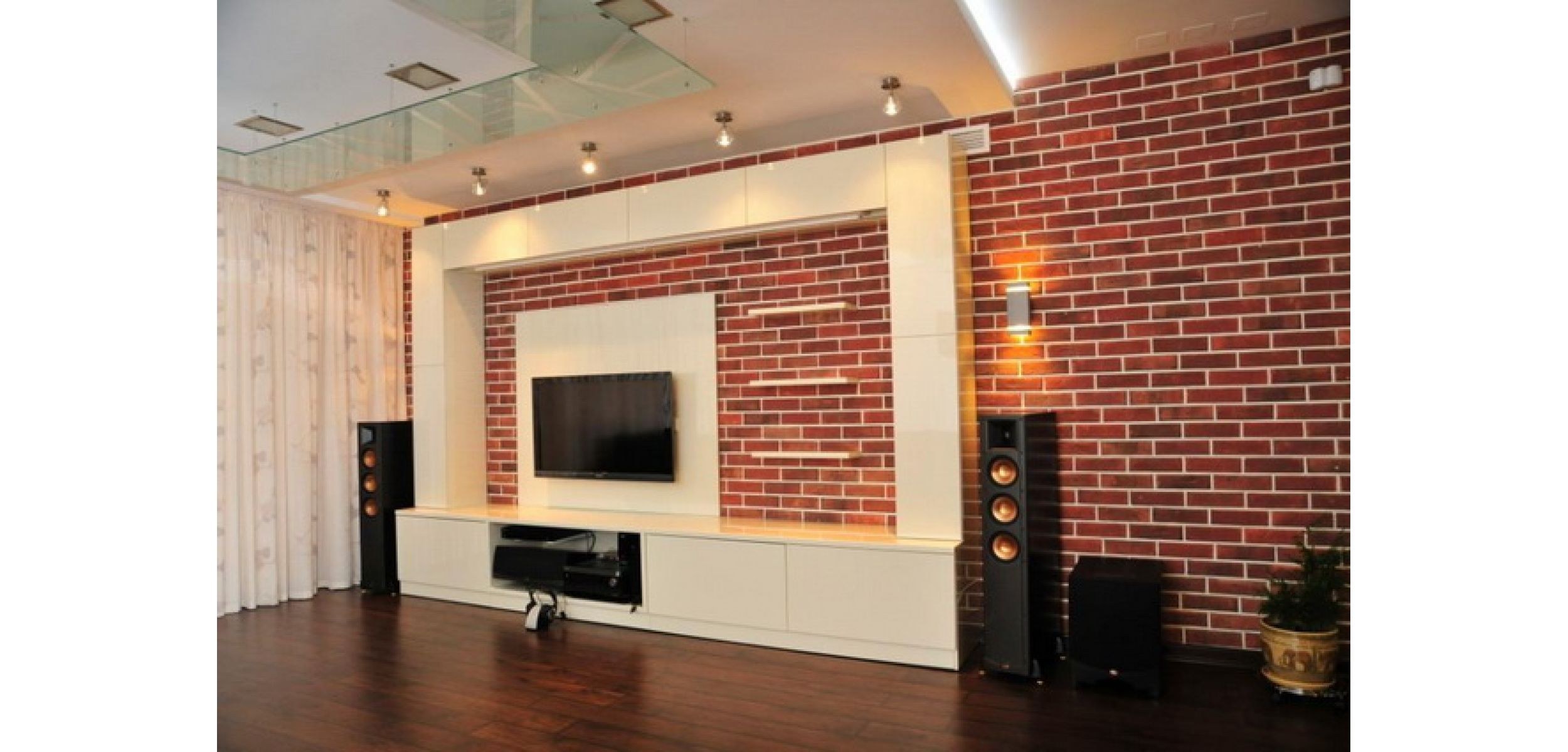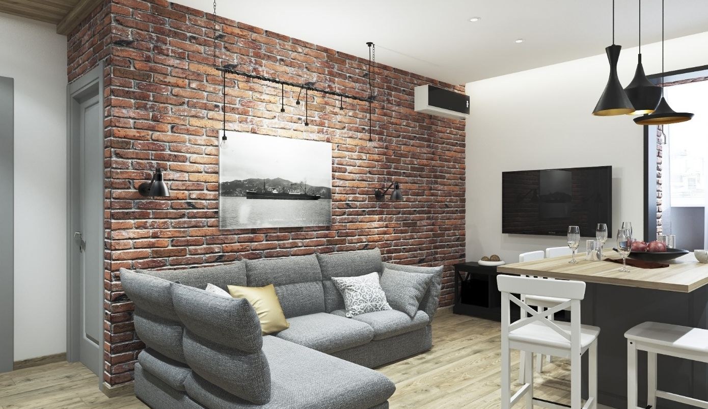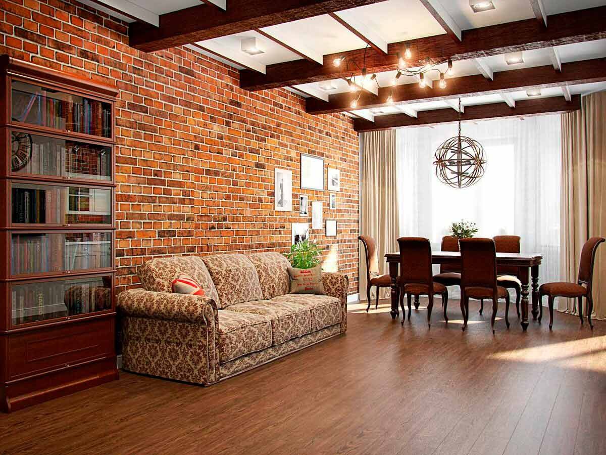 Красный кирпич в интерьере гостиной