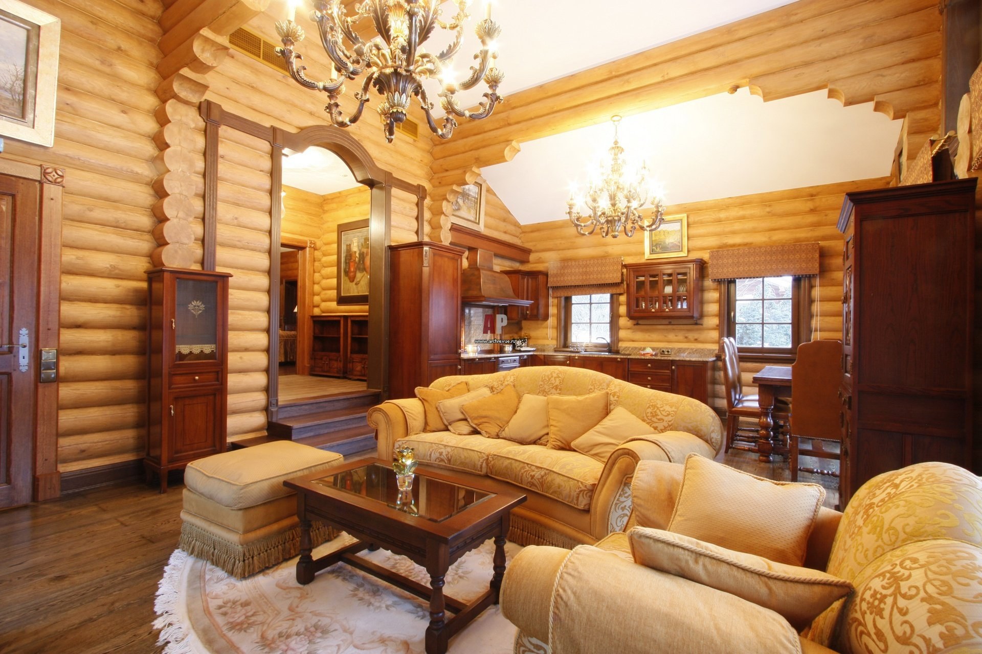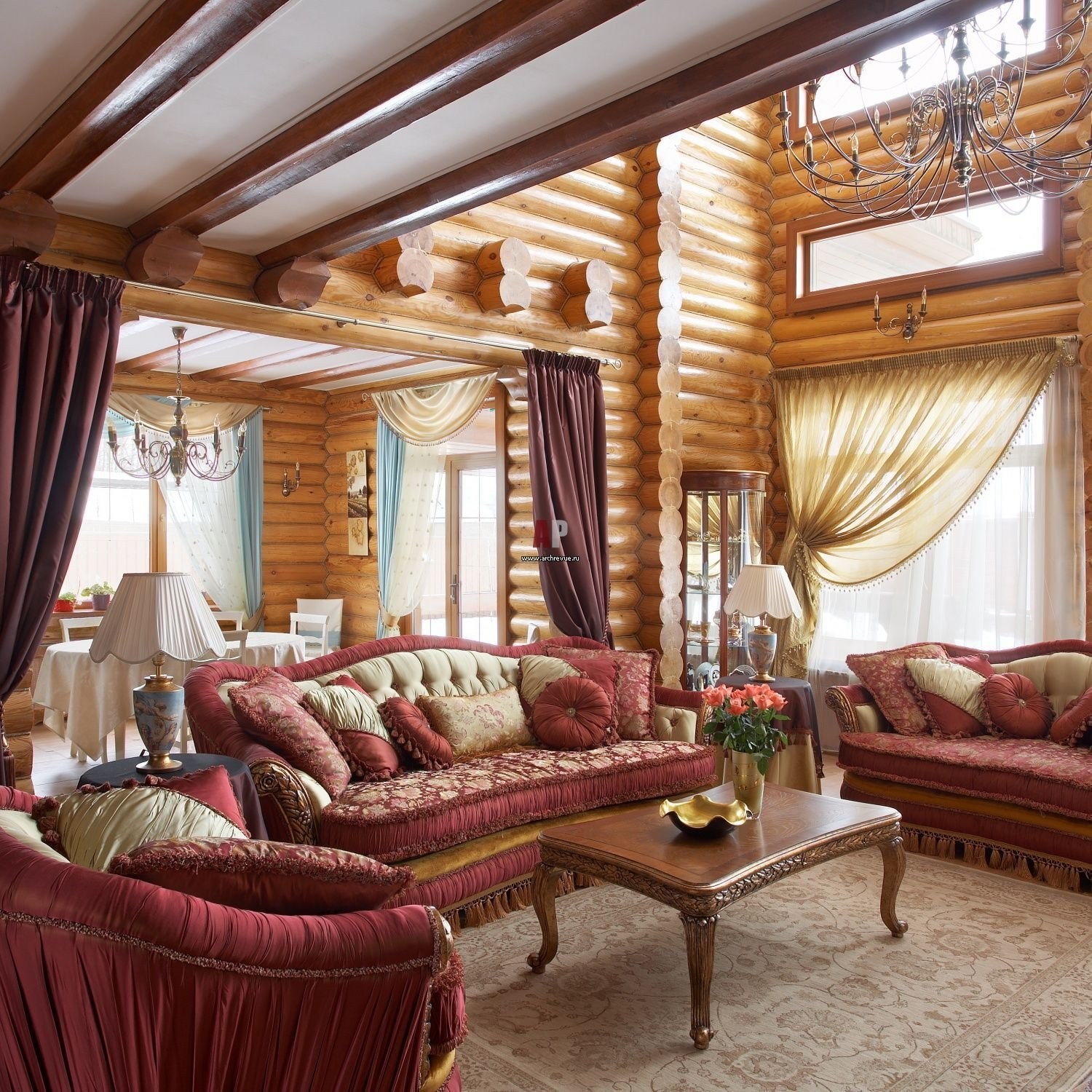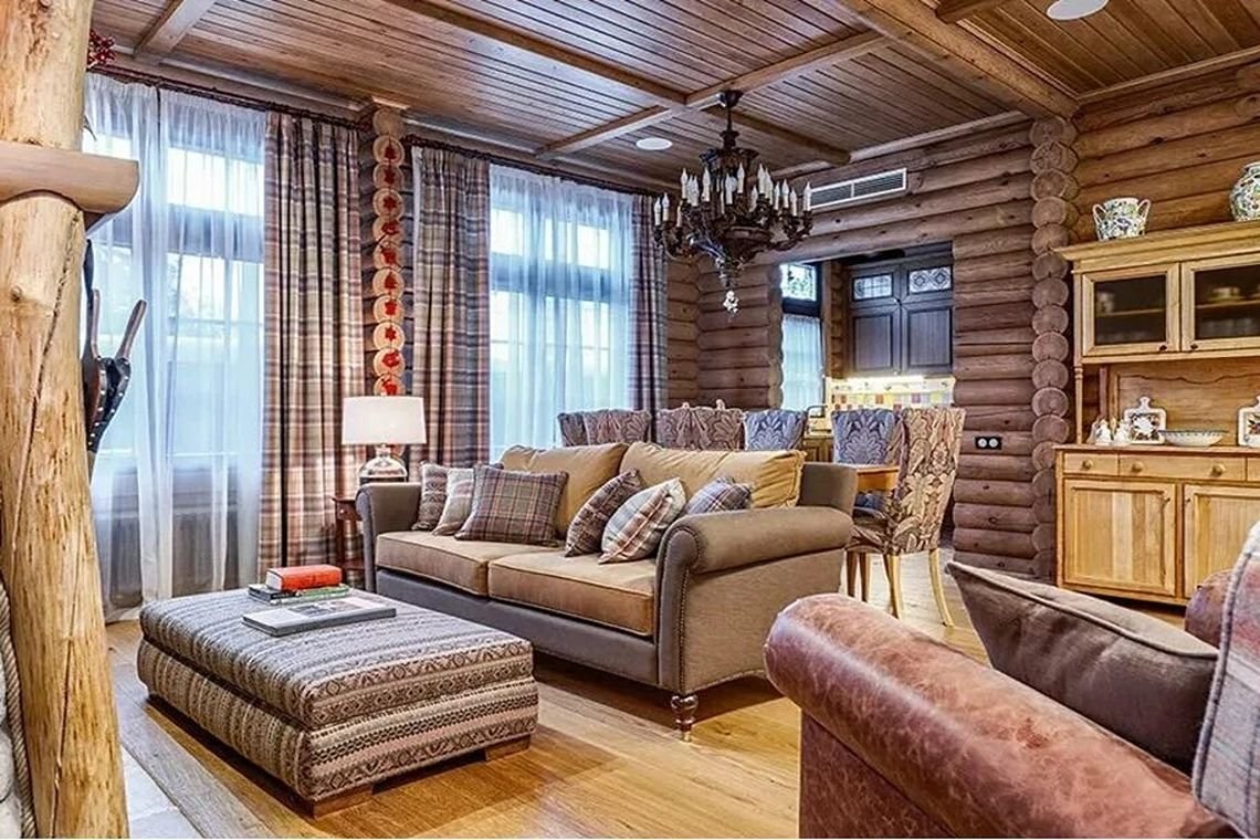 Гостиная в доме из бревна