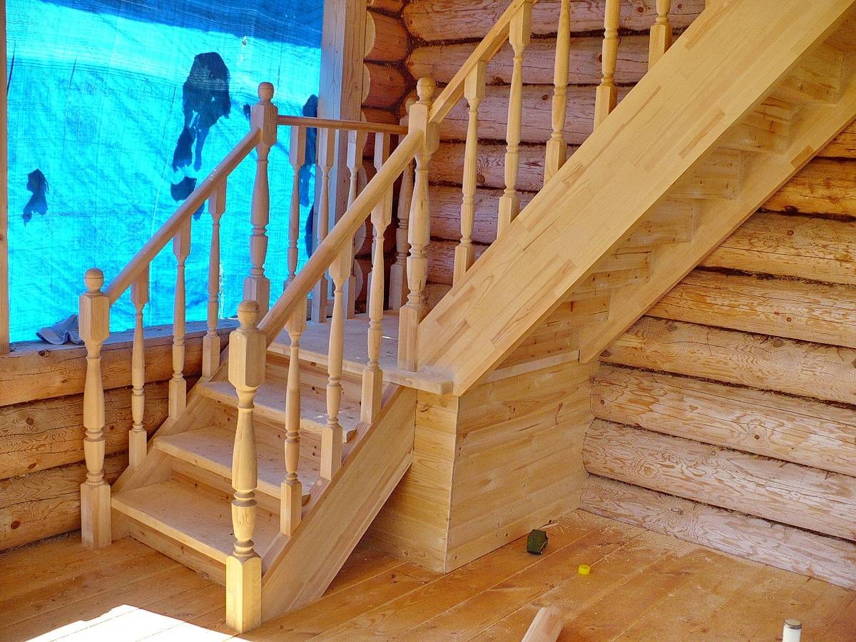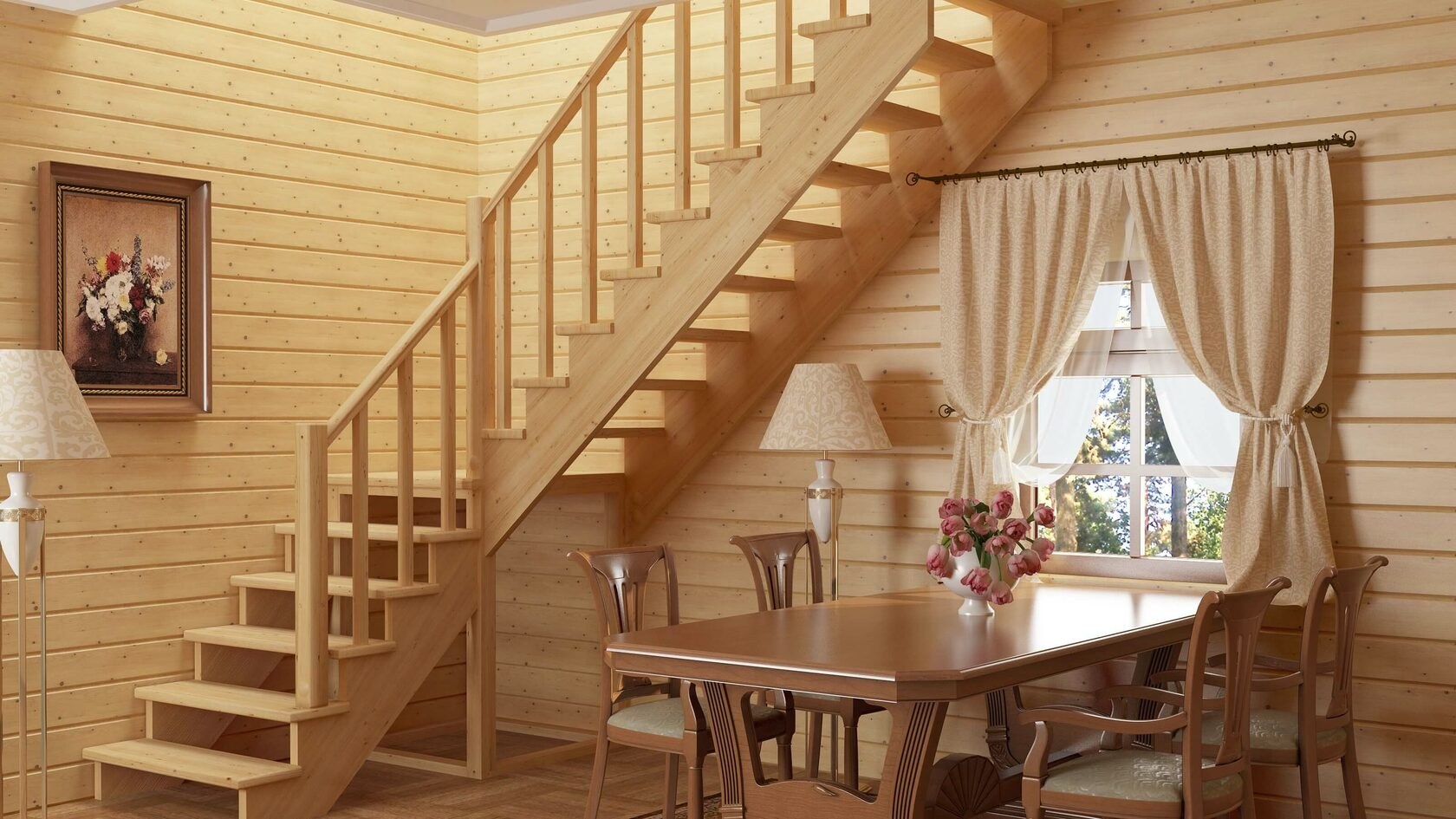Деревянная лестница 180 градусов на второй этаж с забежными ступенями