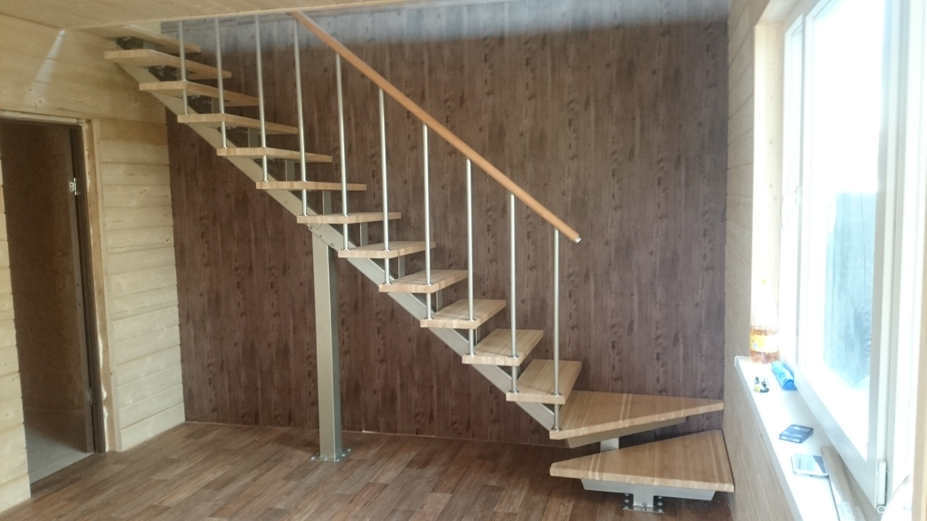 Лестница на второй этаж на косоурах с поворотом с забежными ступенями