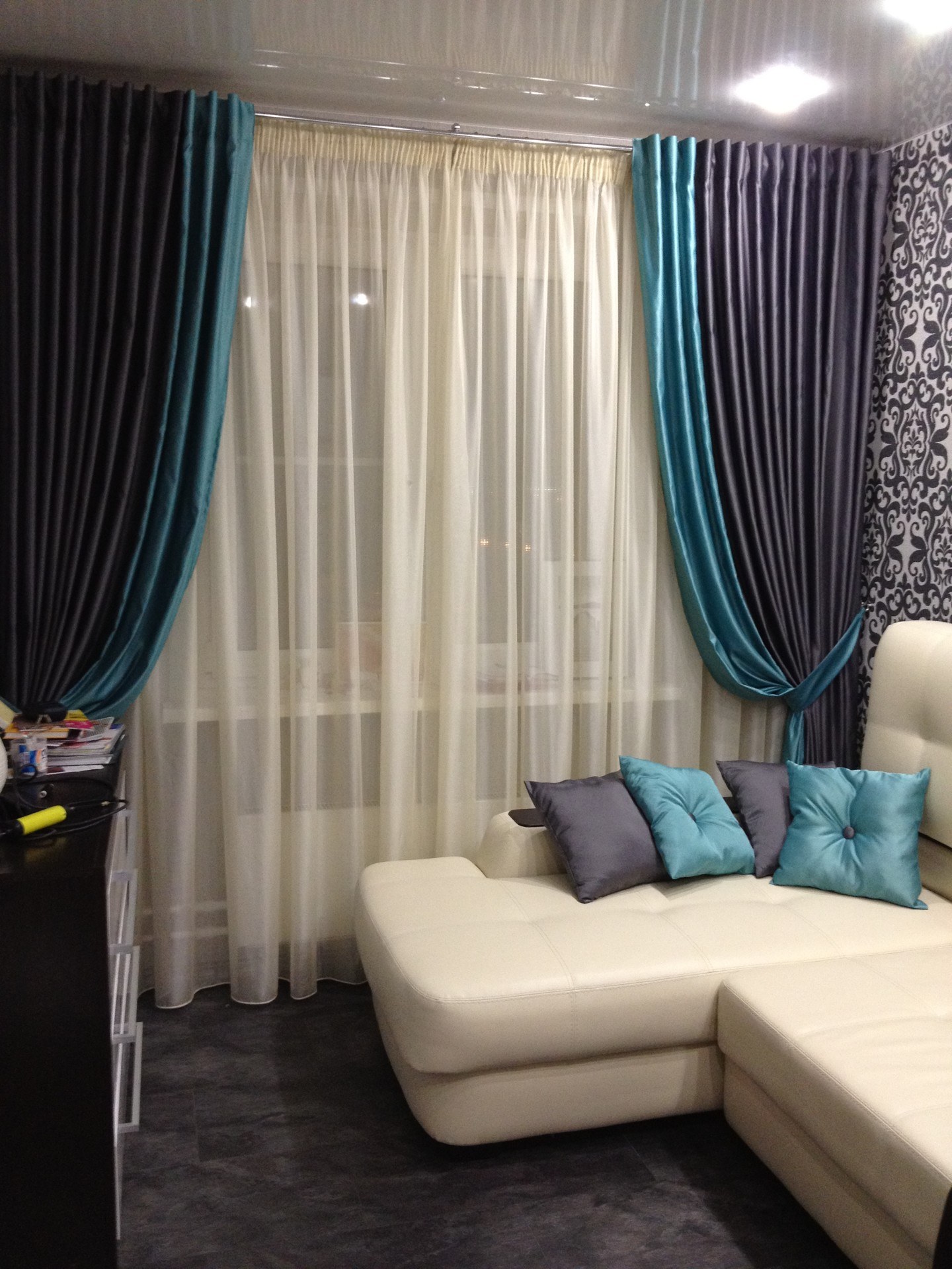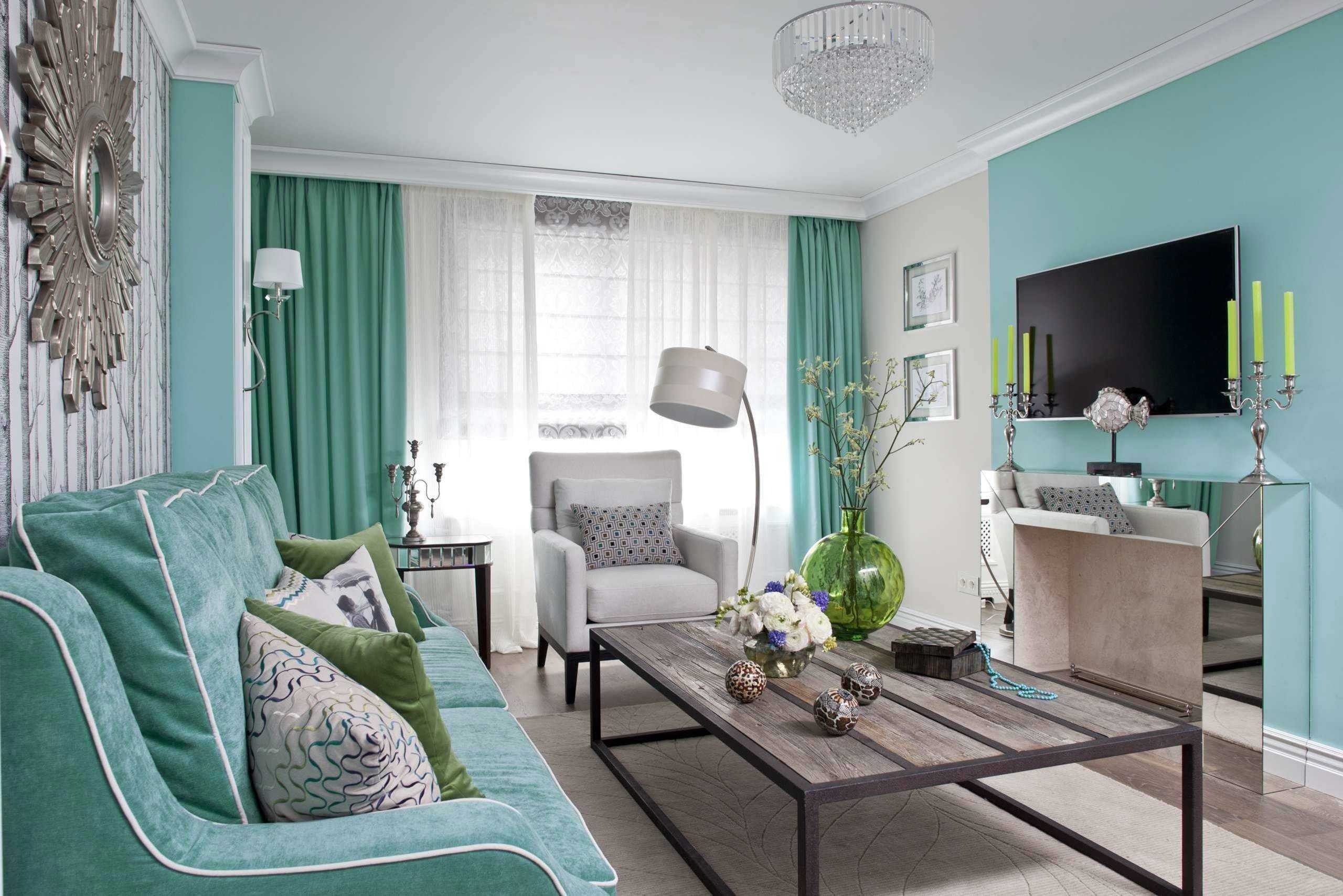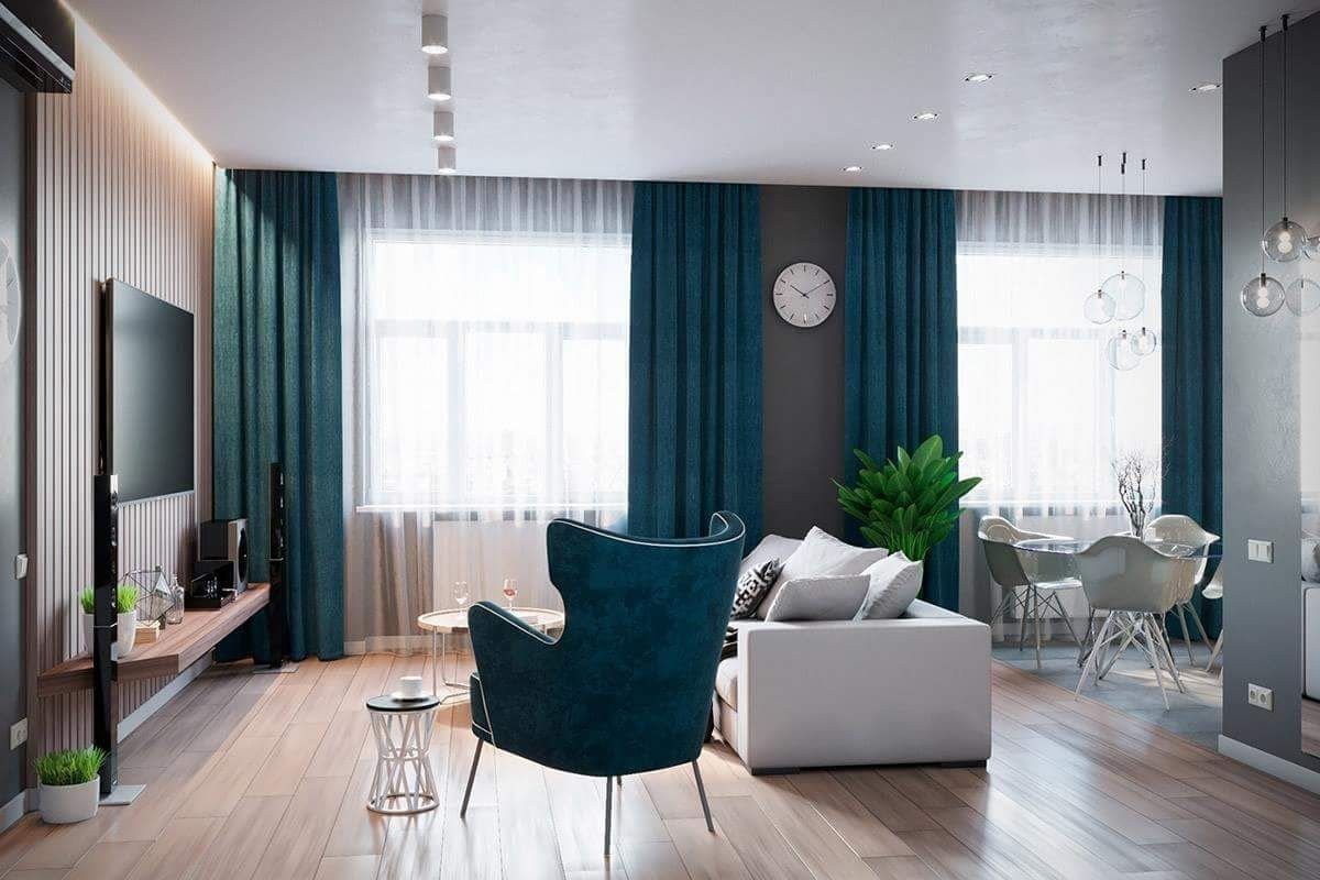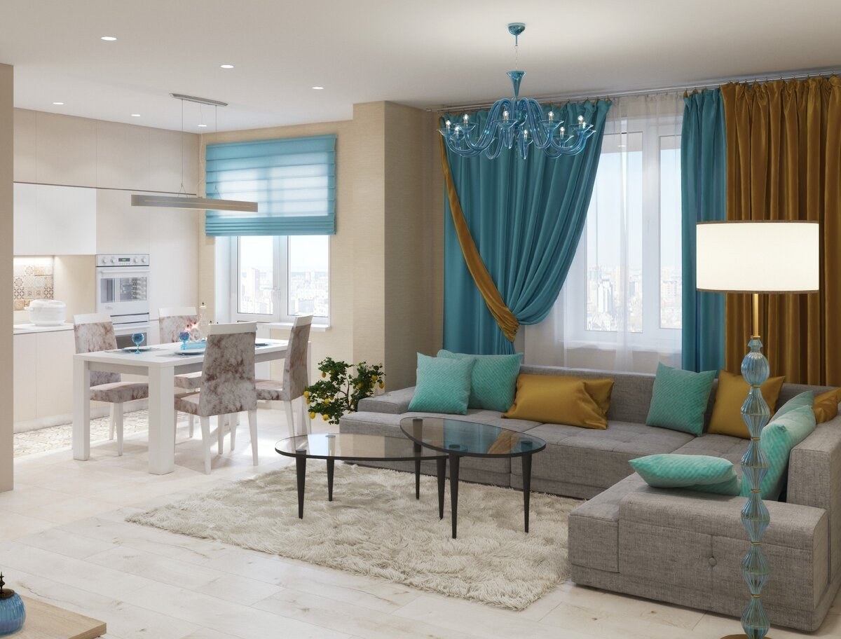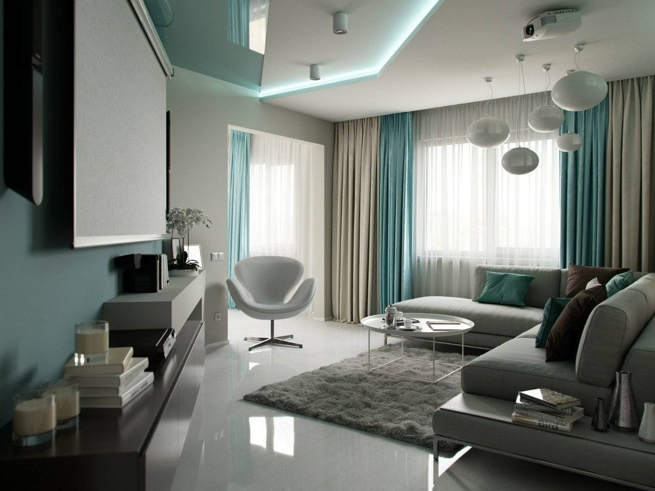 Бирюзовые шторы в гостиной с серым диваном (99 фото)