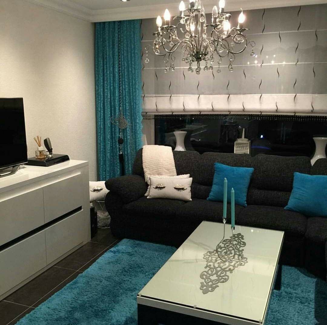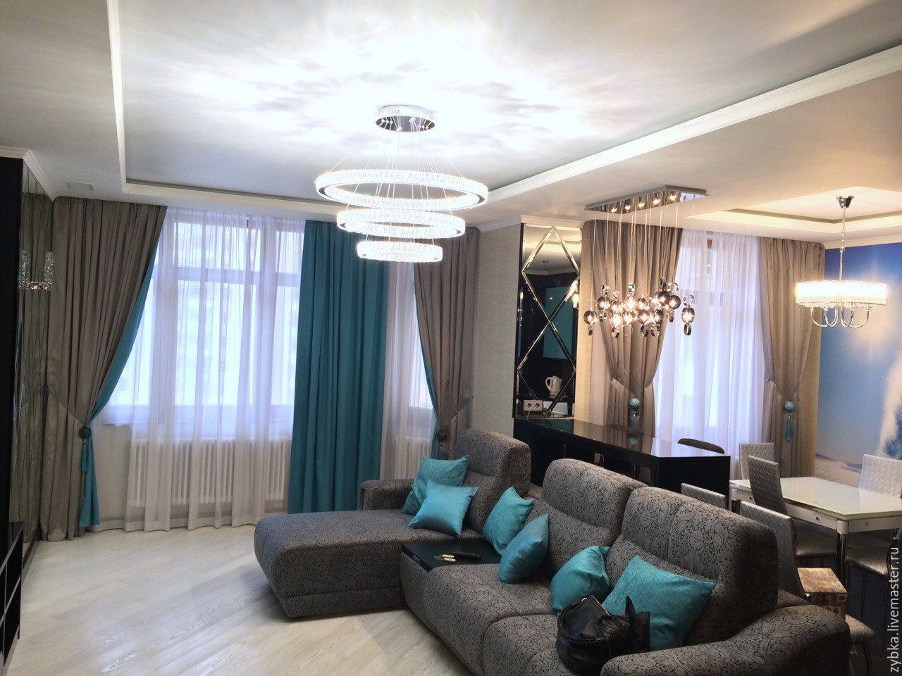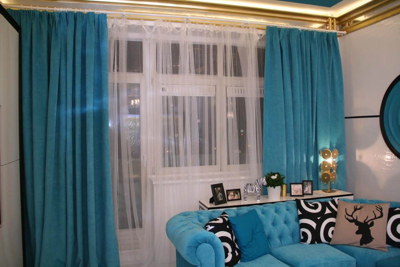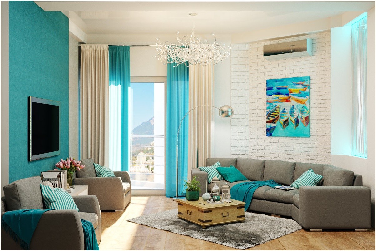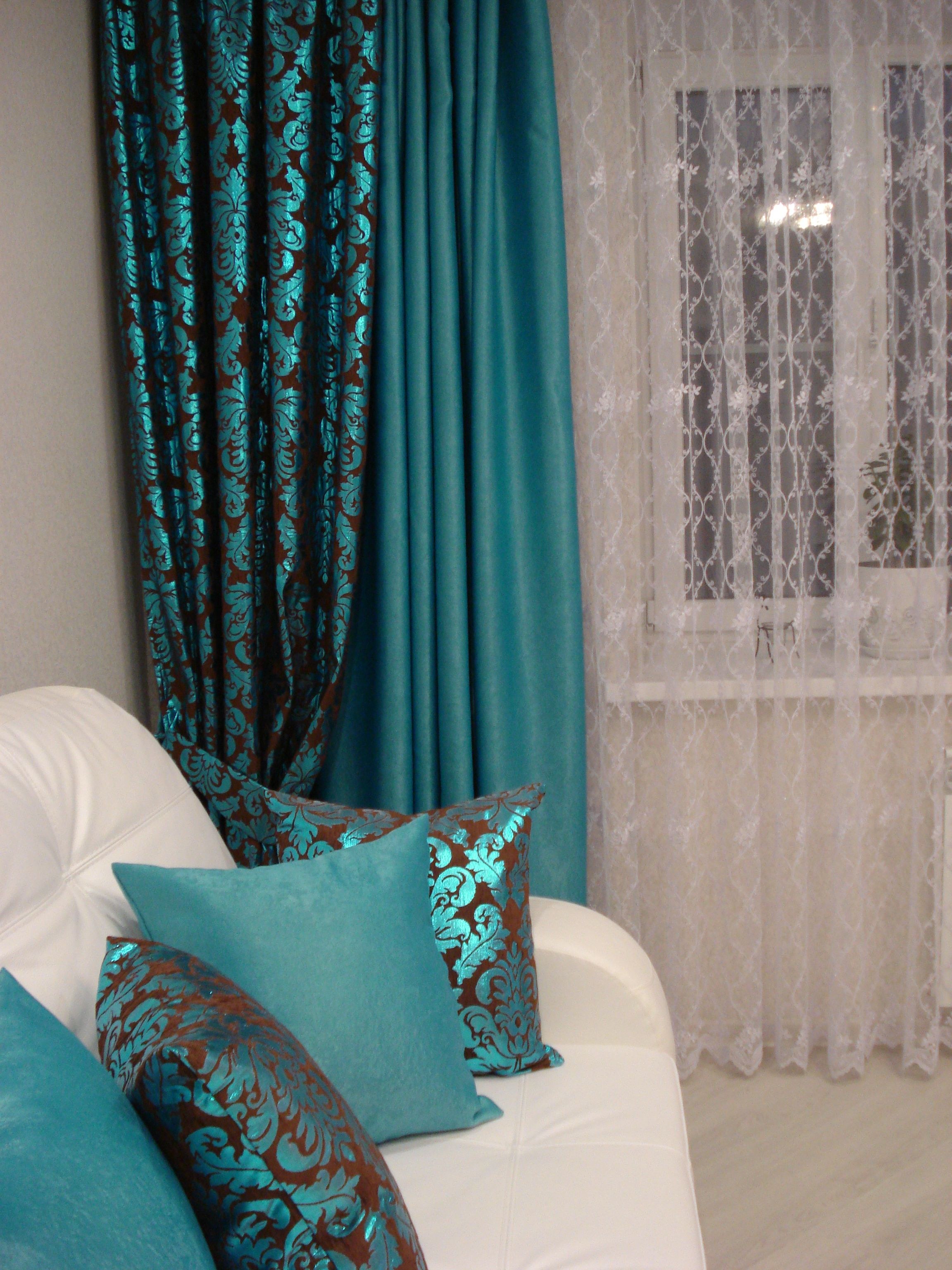 Бирюзовые шторы в гостиной с серым диваном (99 фото)