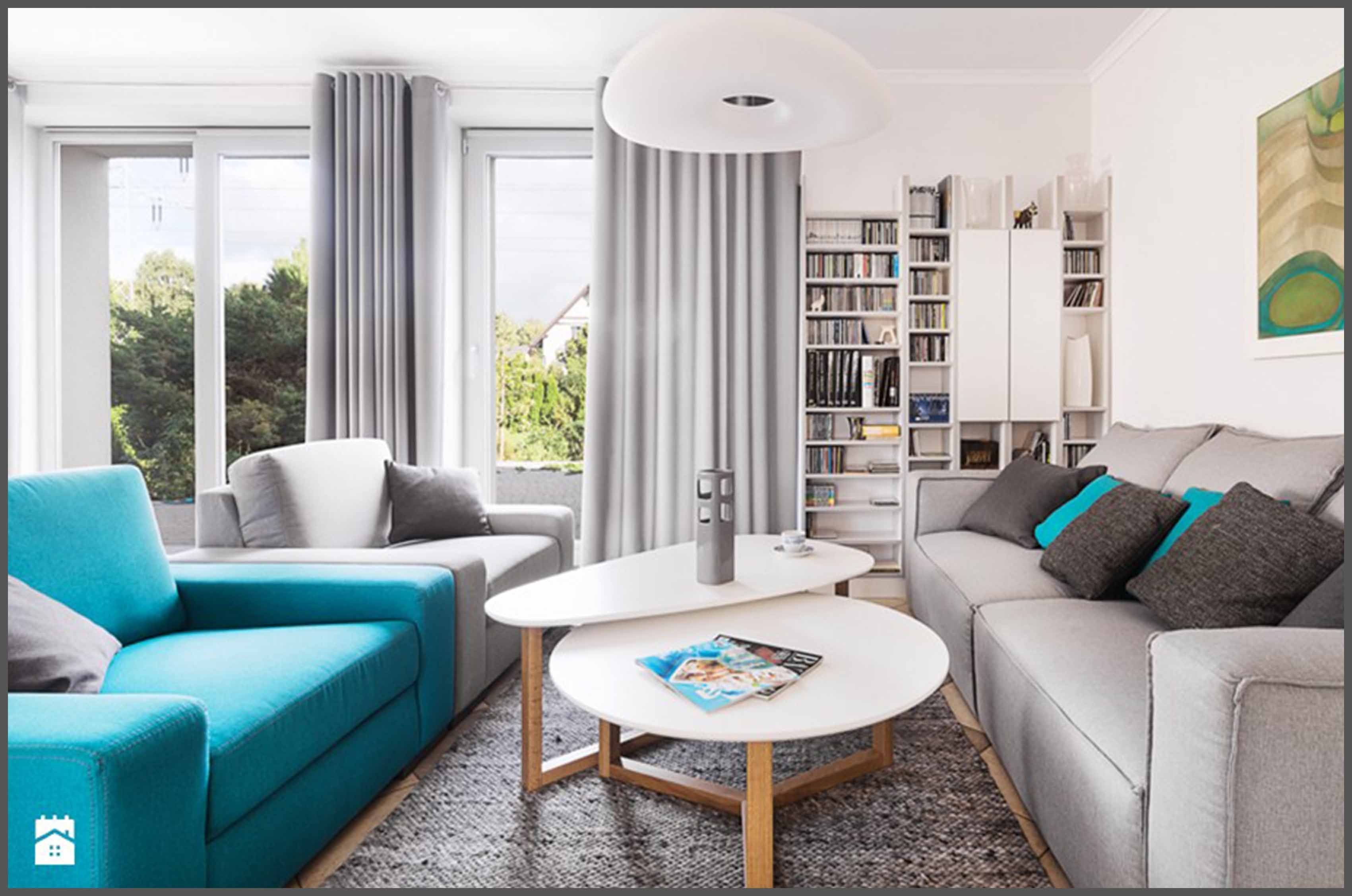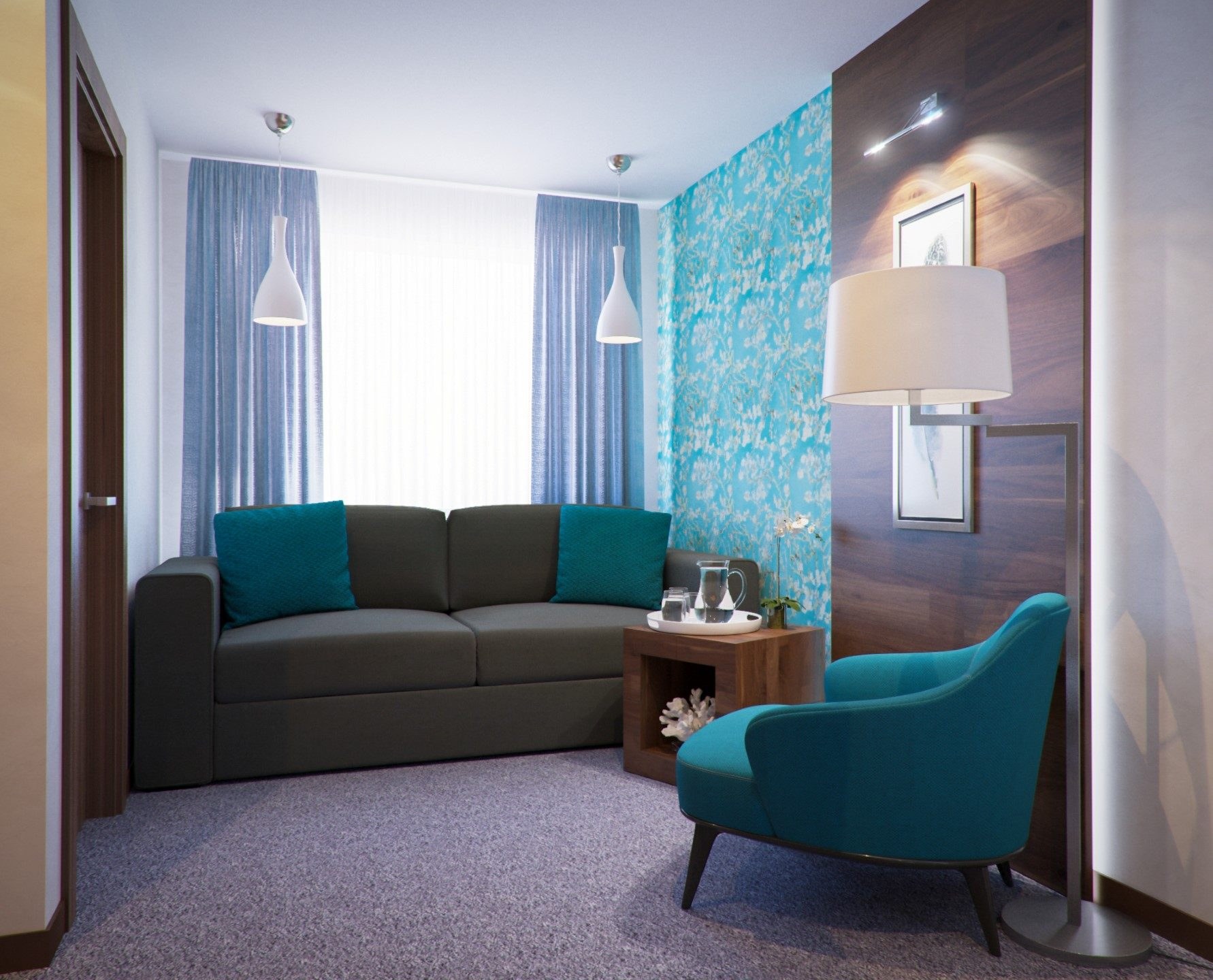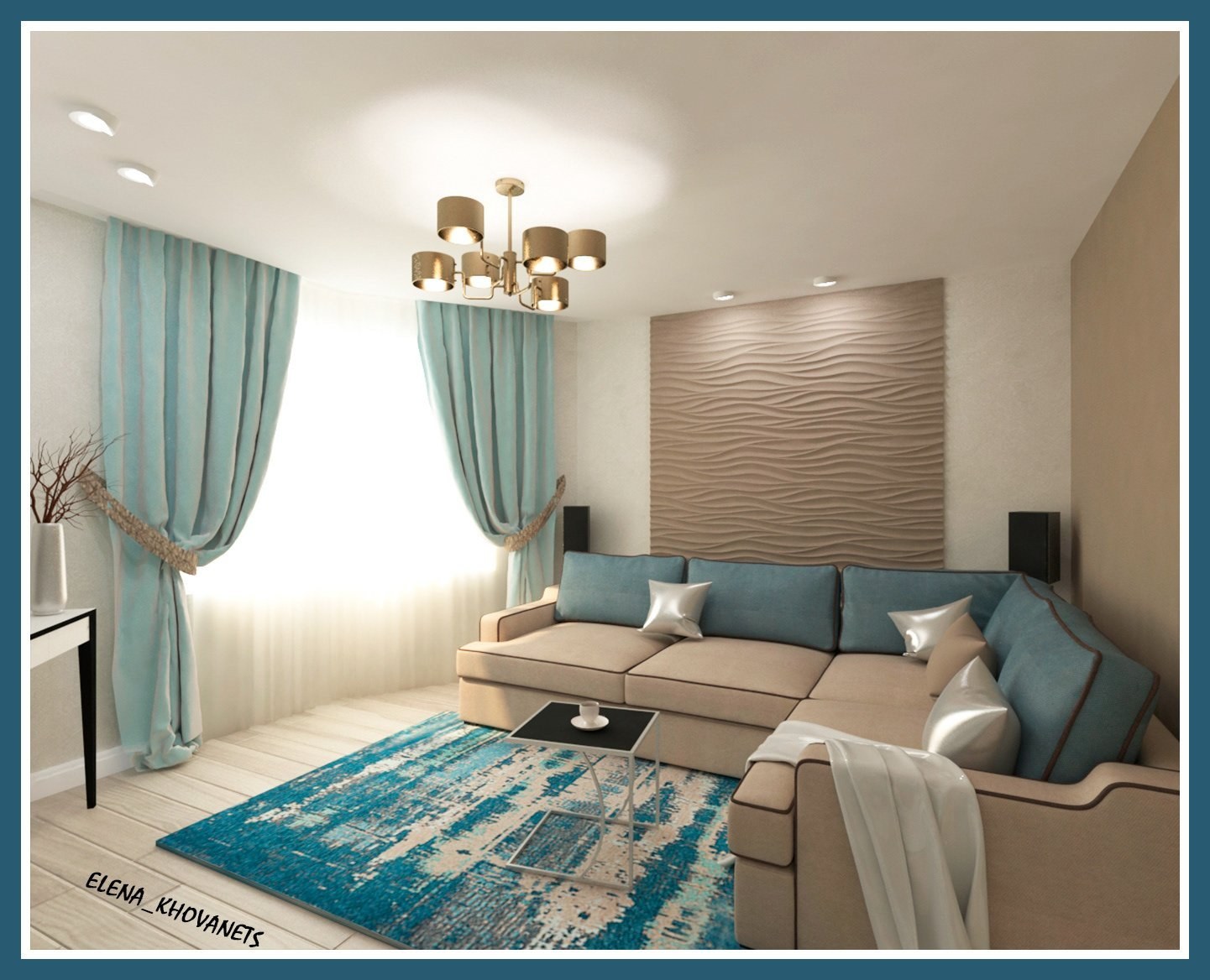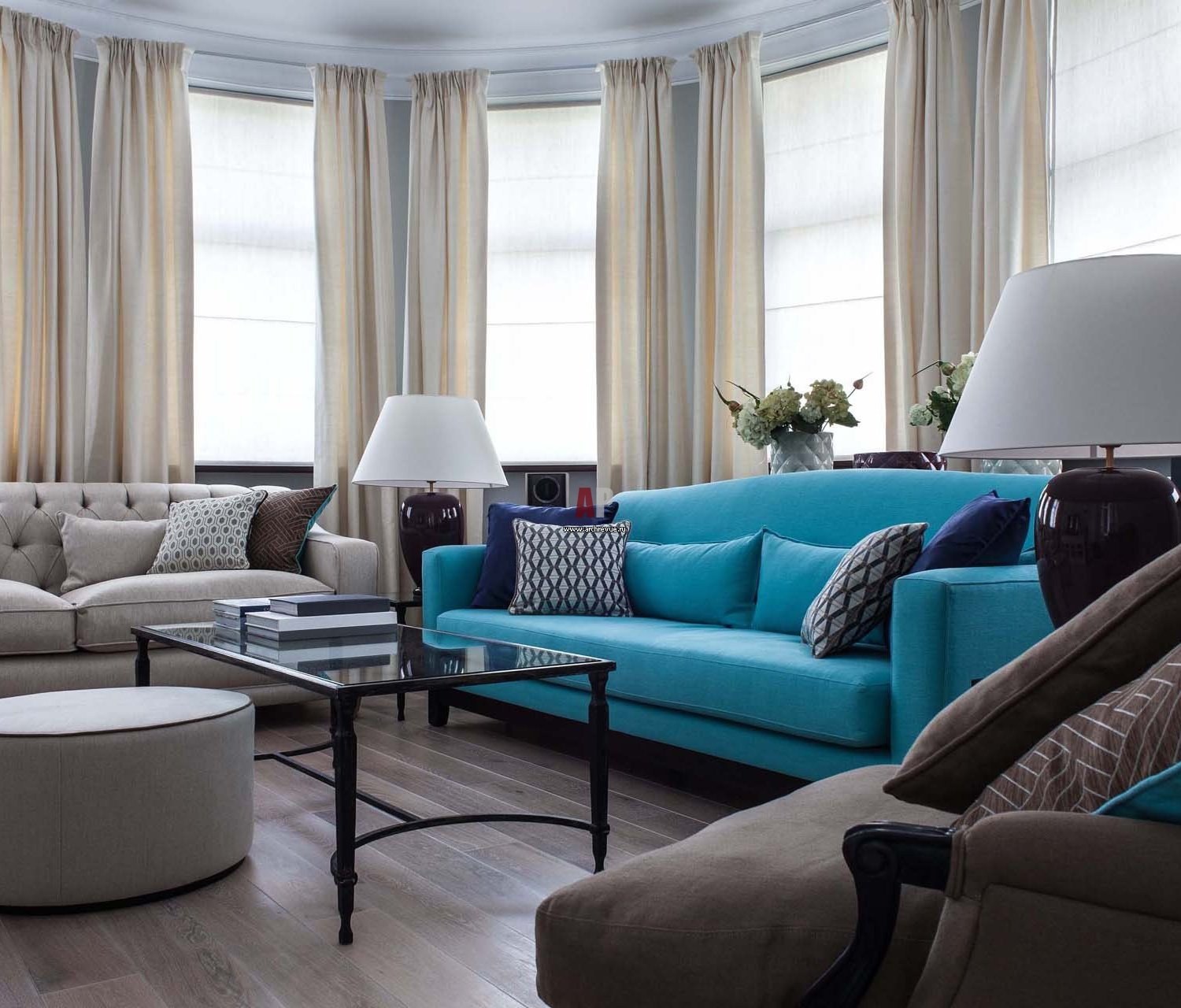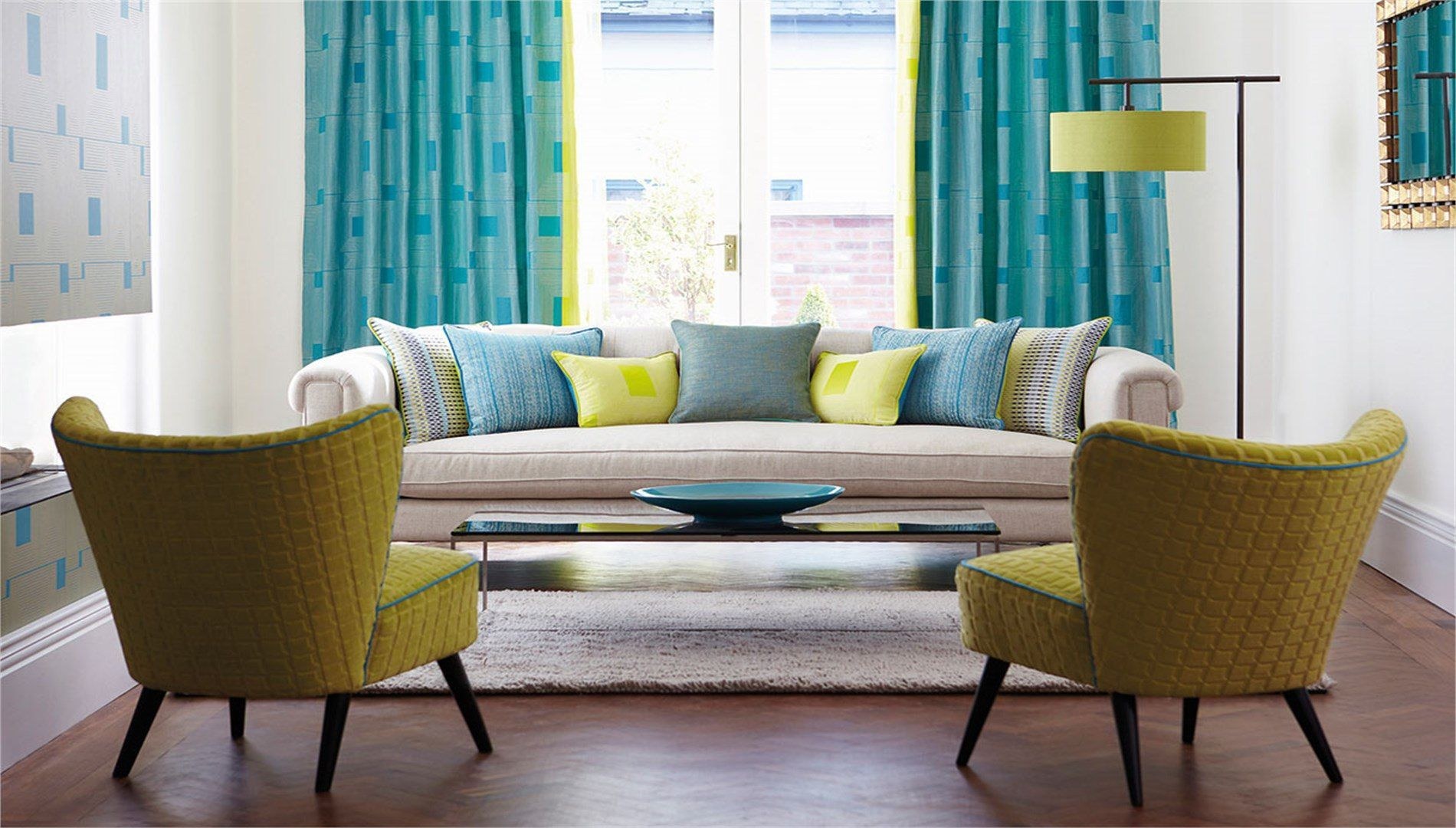 Бирюзовые шторы в гостиной с серым диваном (99 фото)