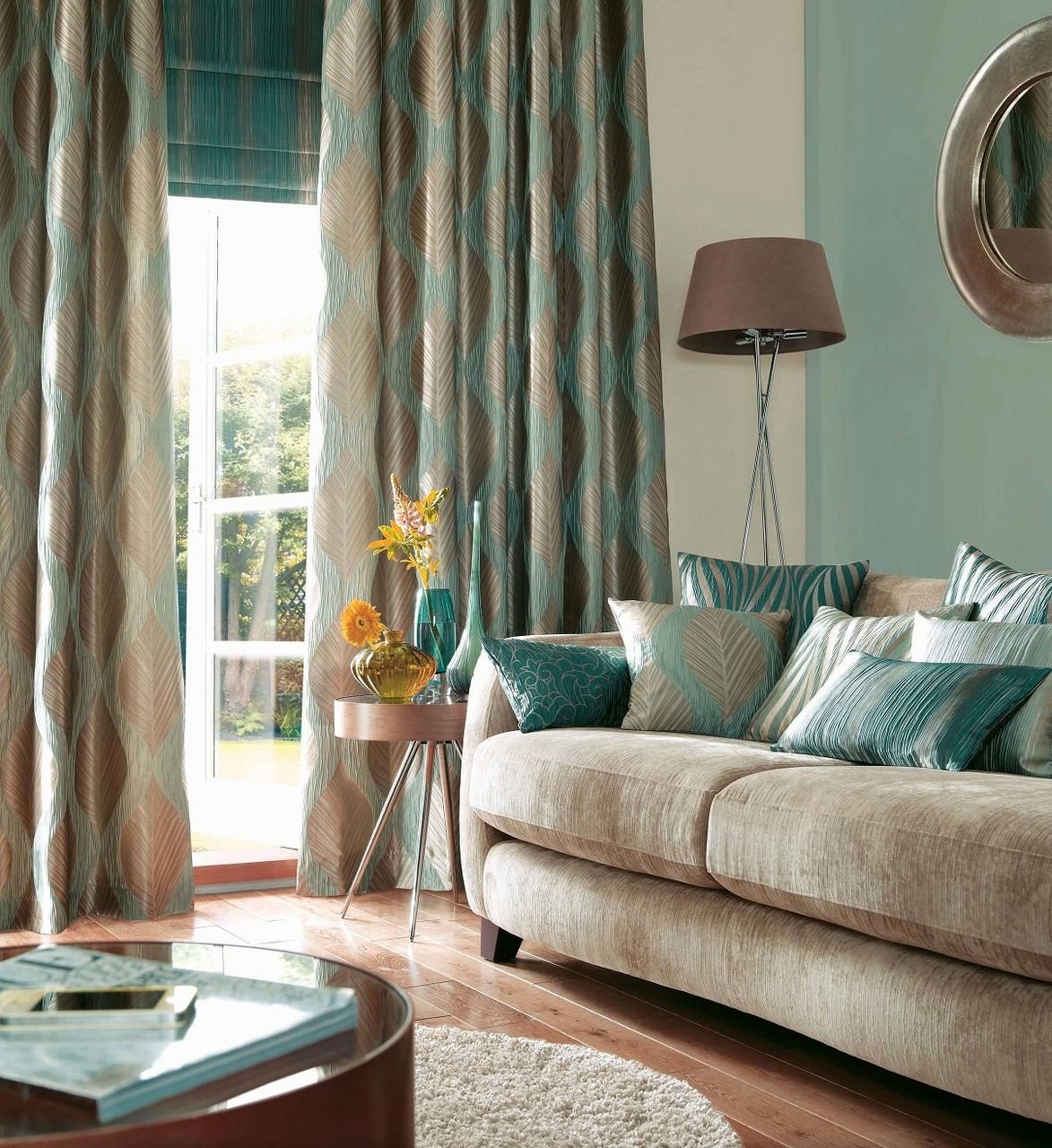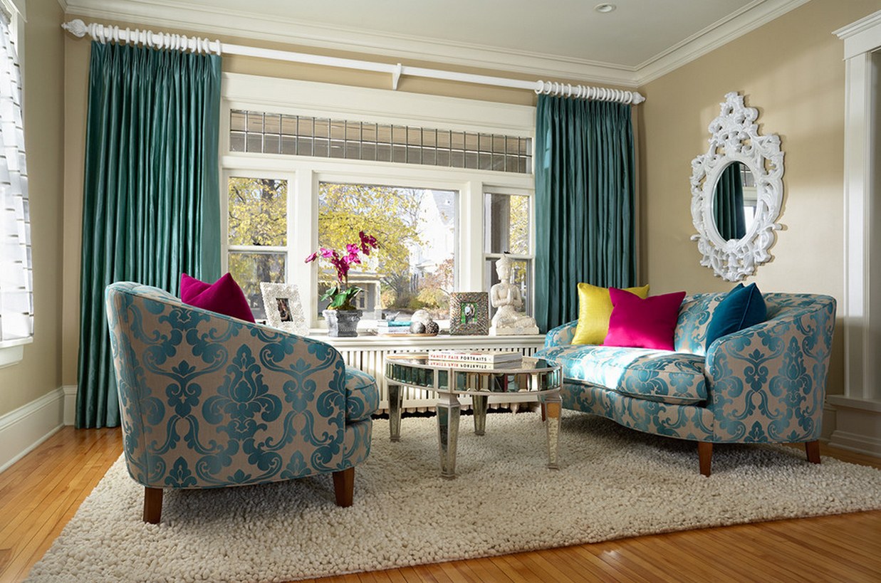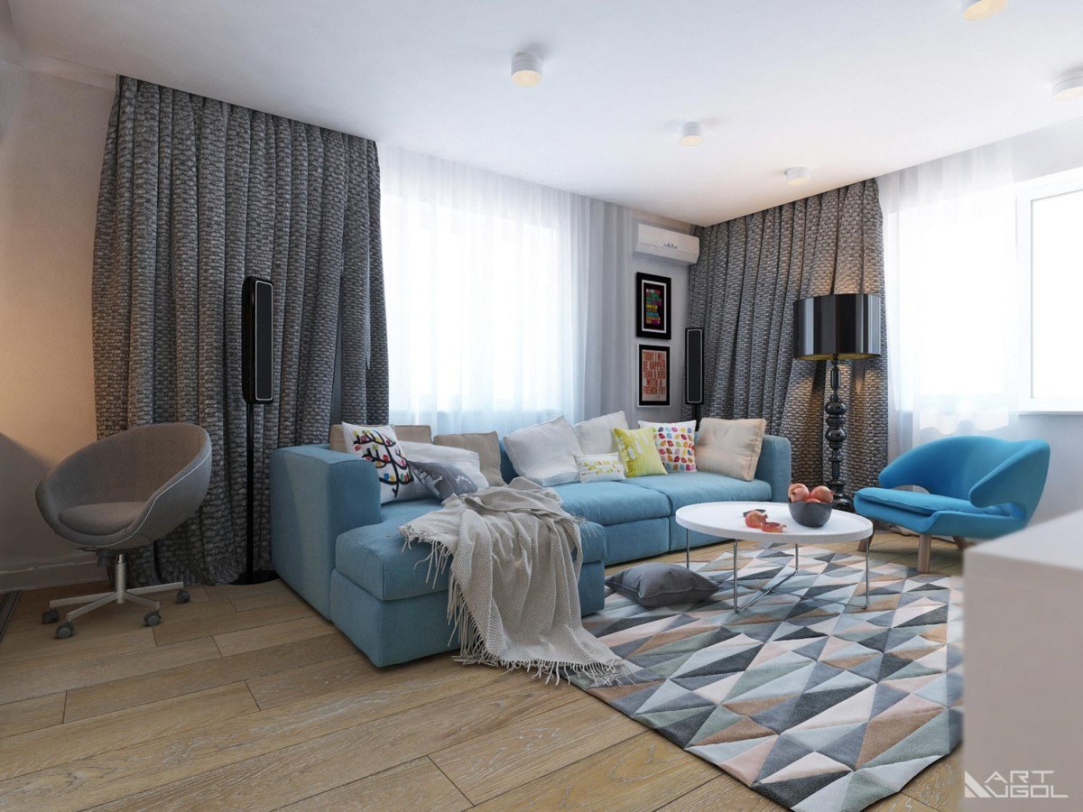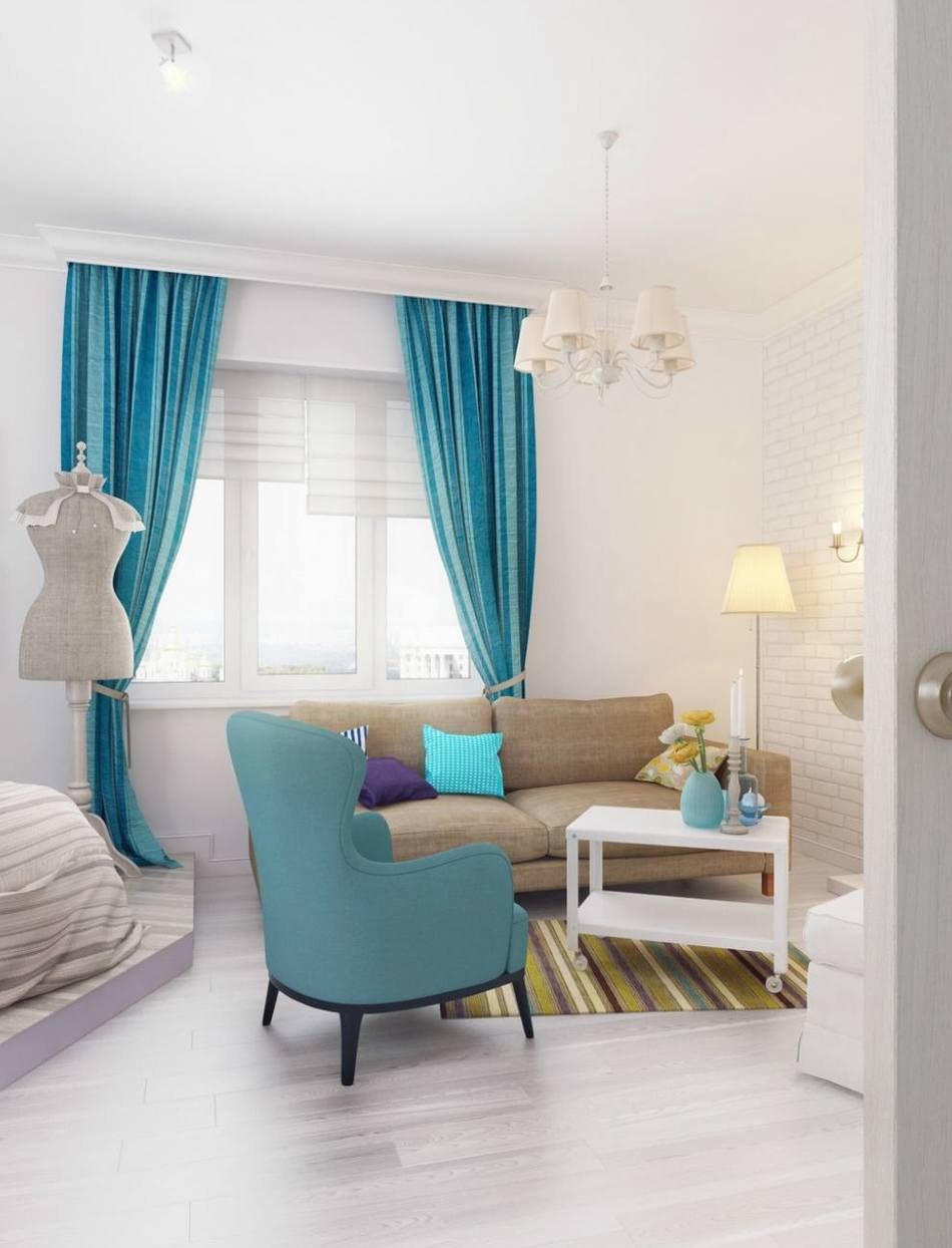 Бирюзовые шторы в гостиной с серым диваном (99 фото)