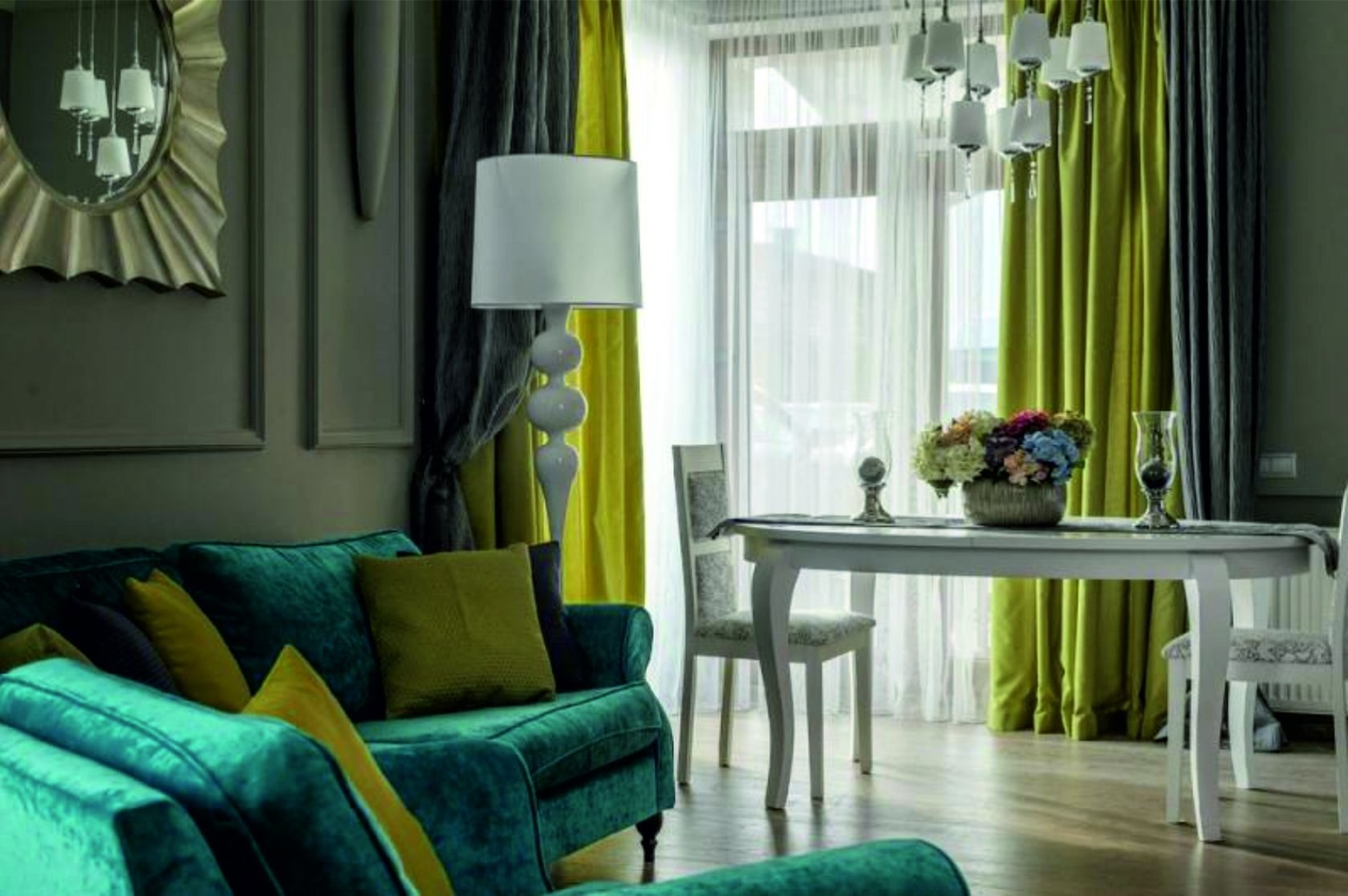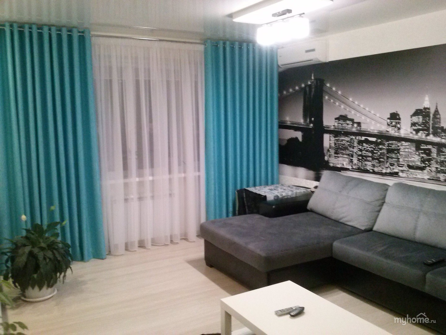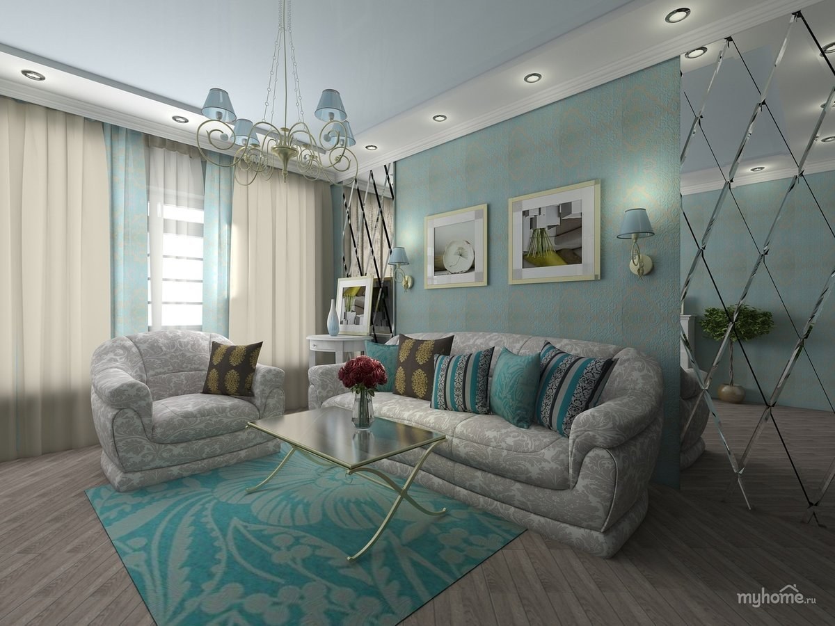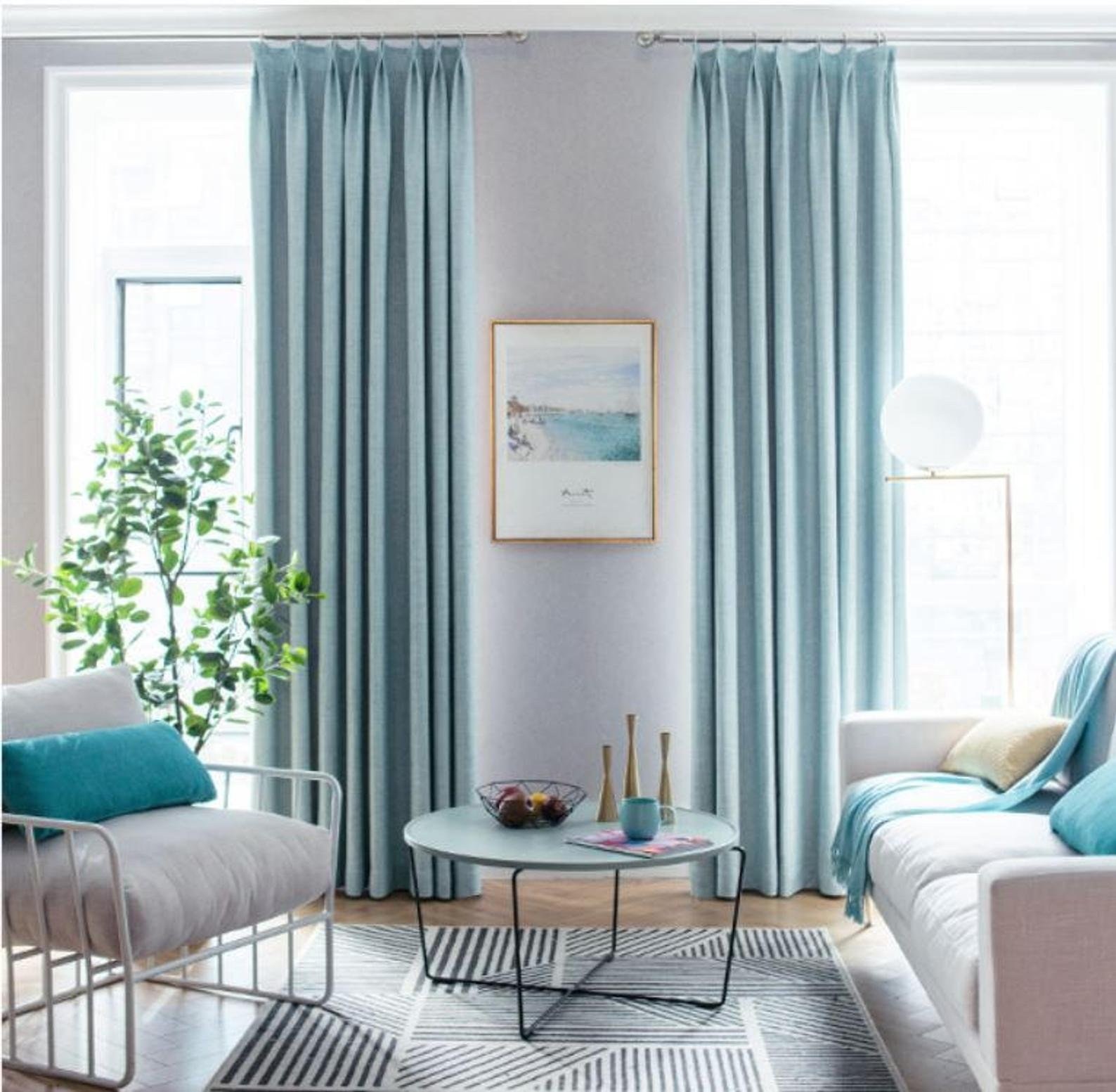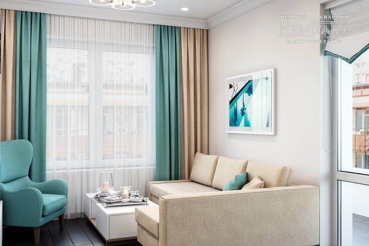 Бирюзовые шторы в гостиной с серым диваном (99 фото)
