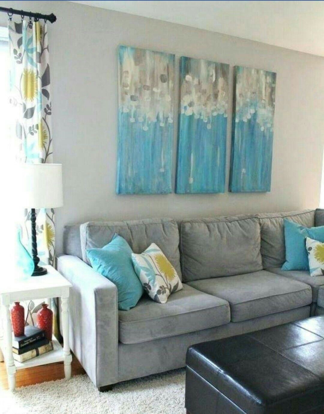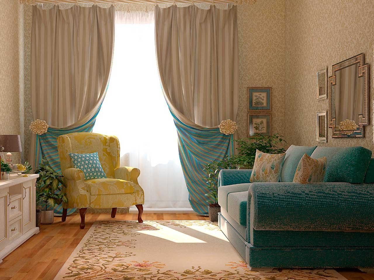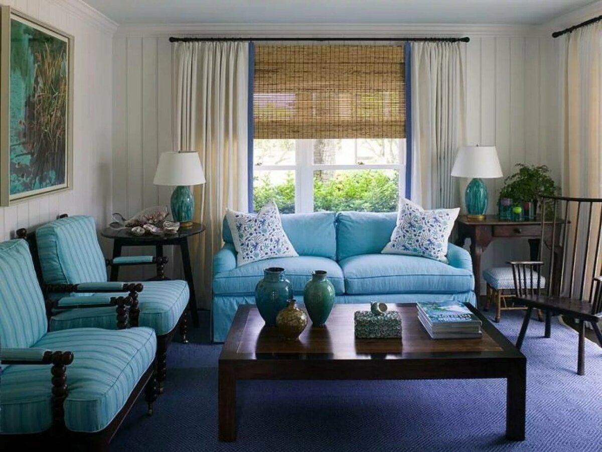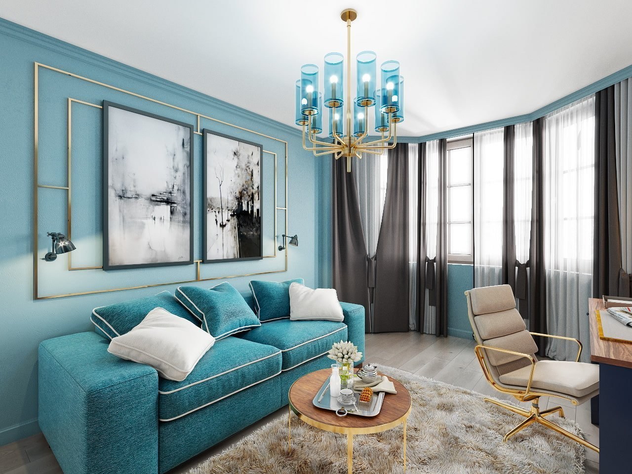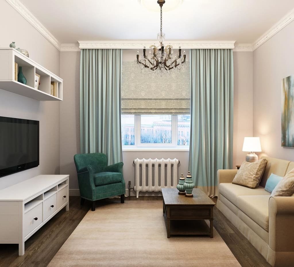 Бирюзовые шторы в гостиной с серым диваном (99 фото)