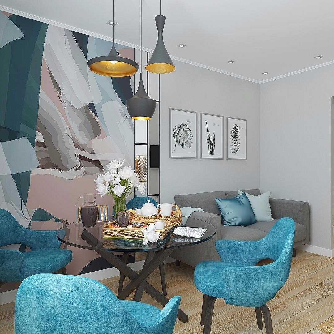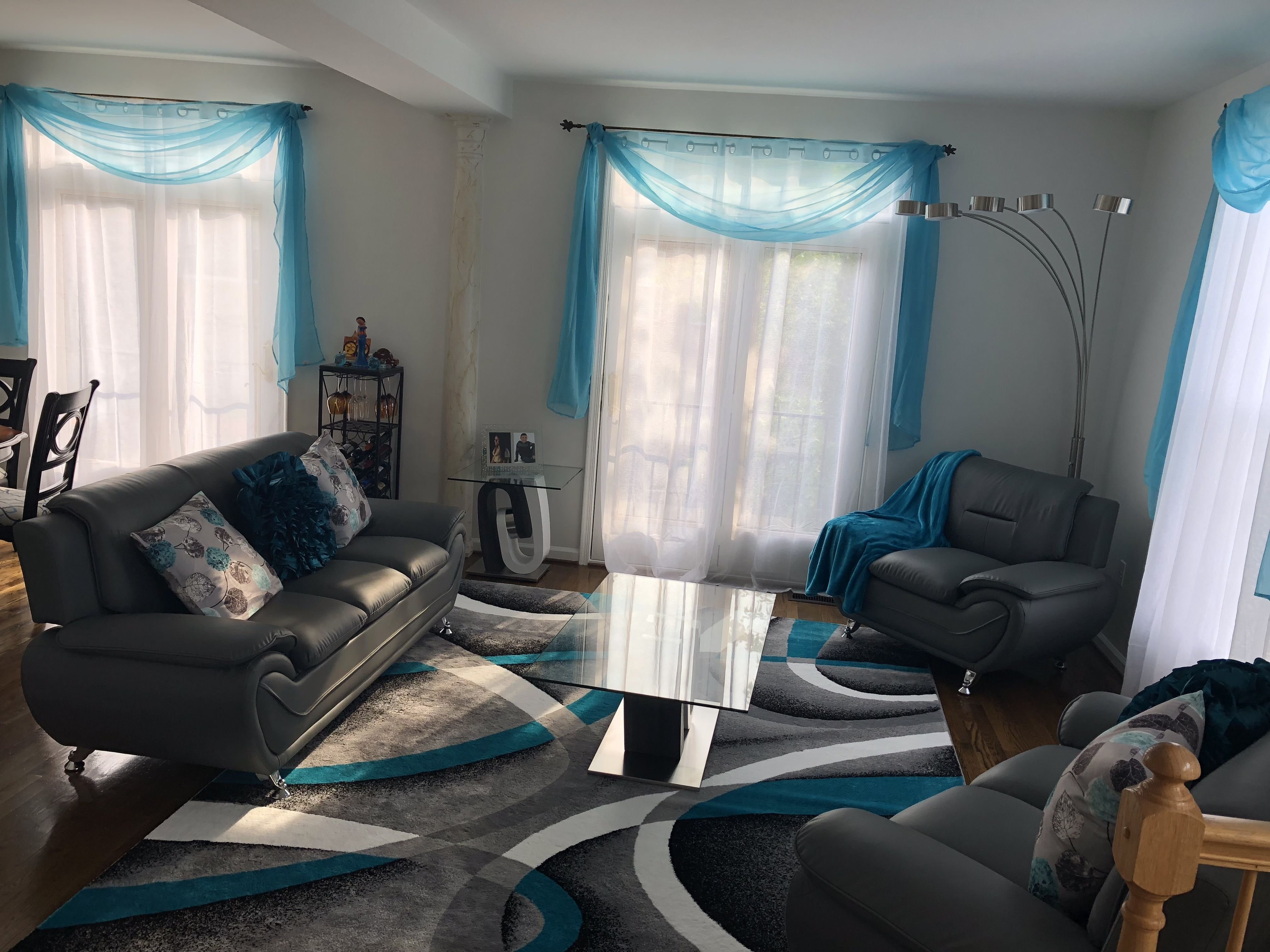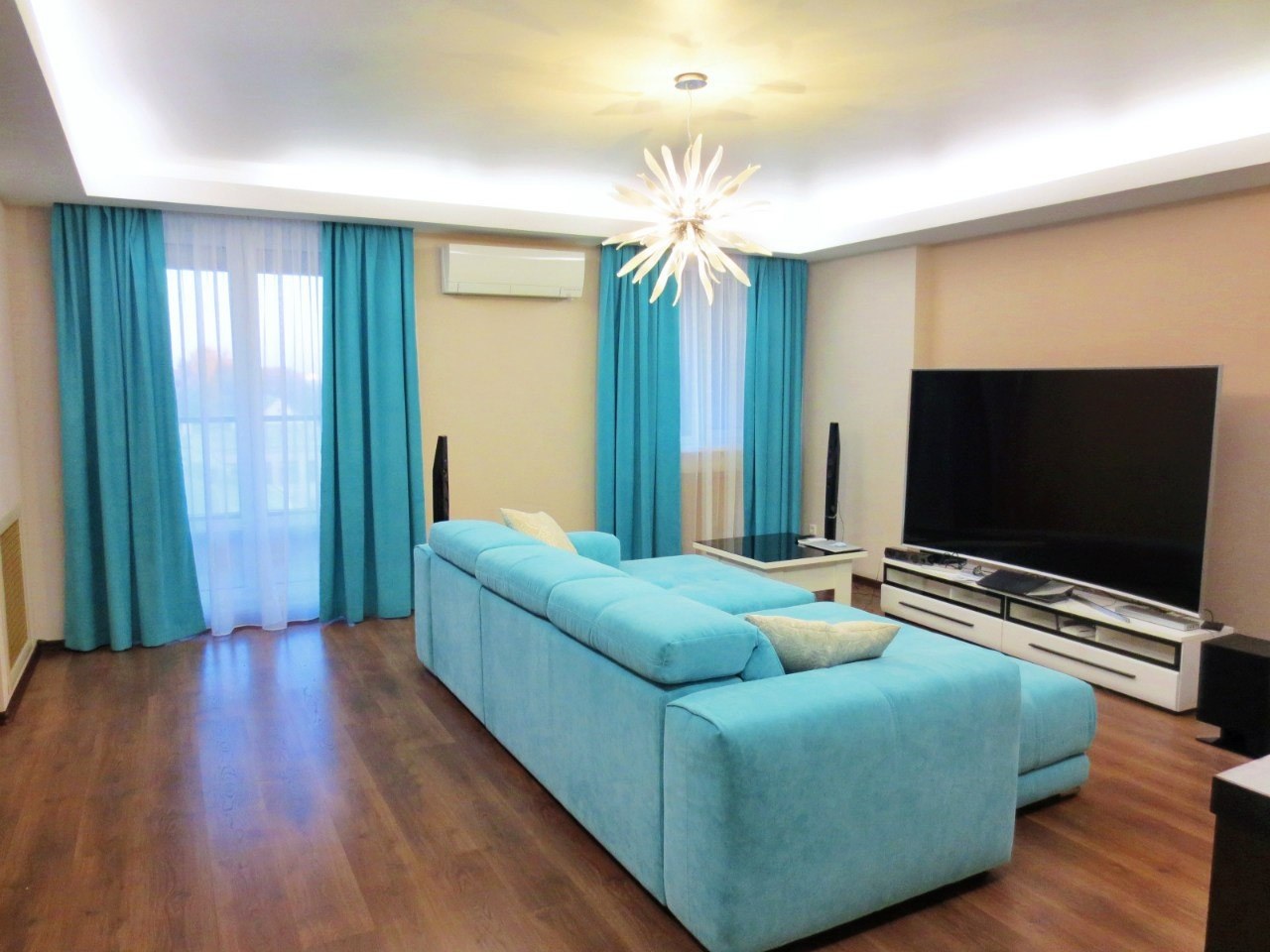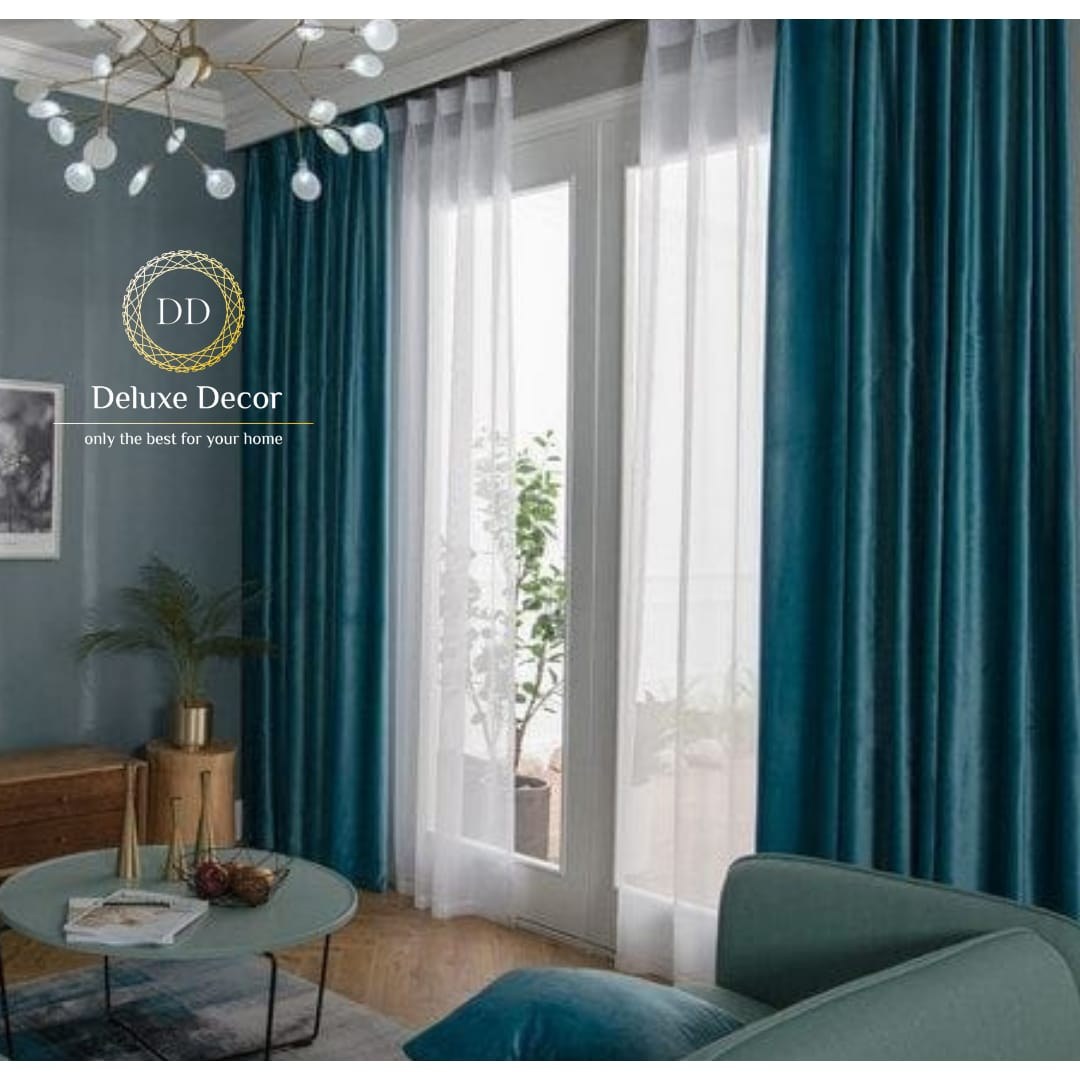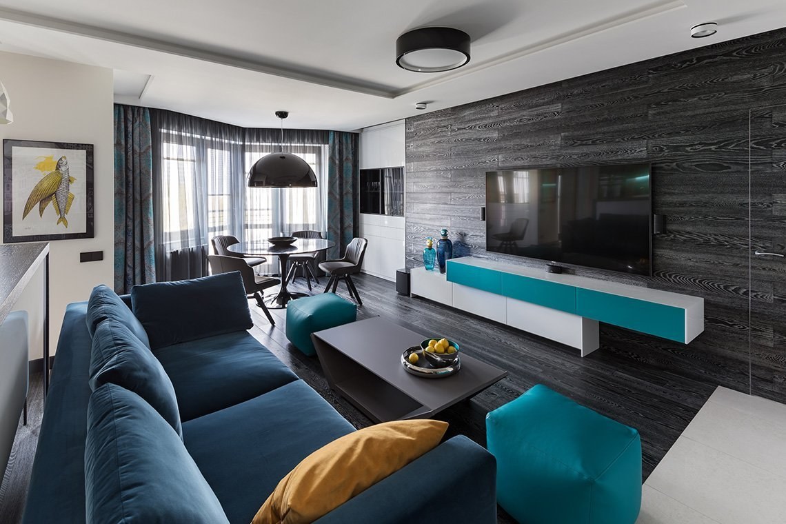 Бирюзовые шторы в гостиной с серым диваном (99 фото)