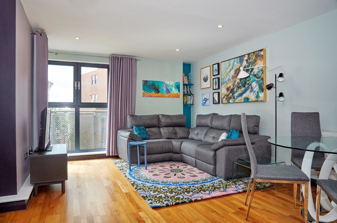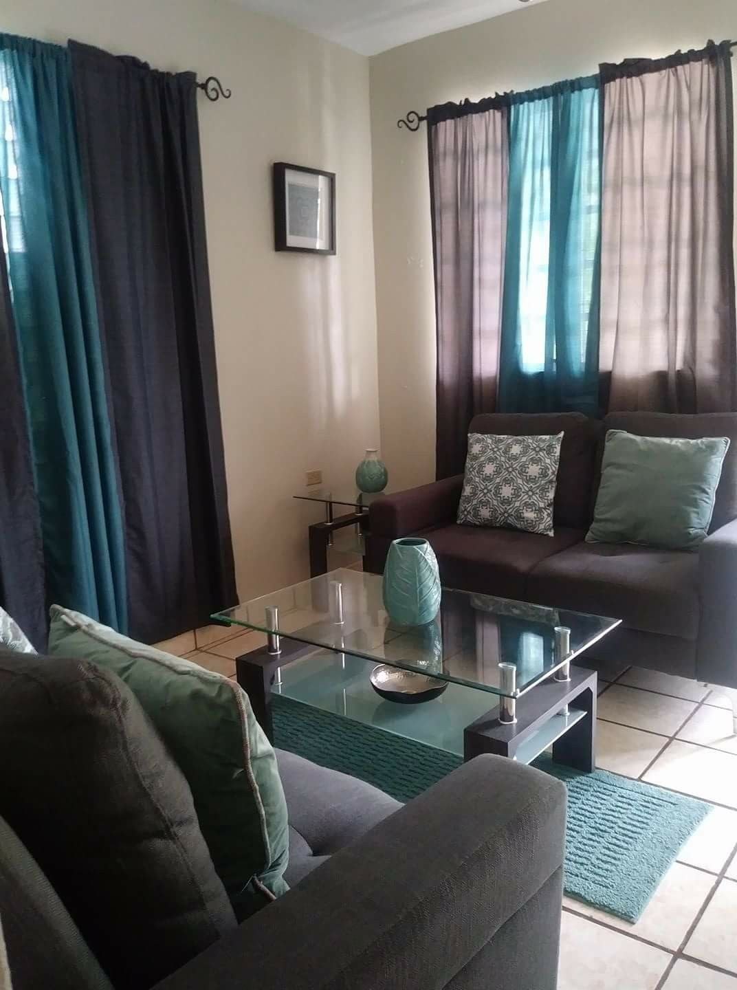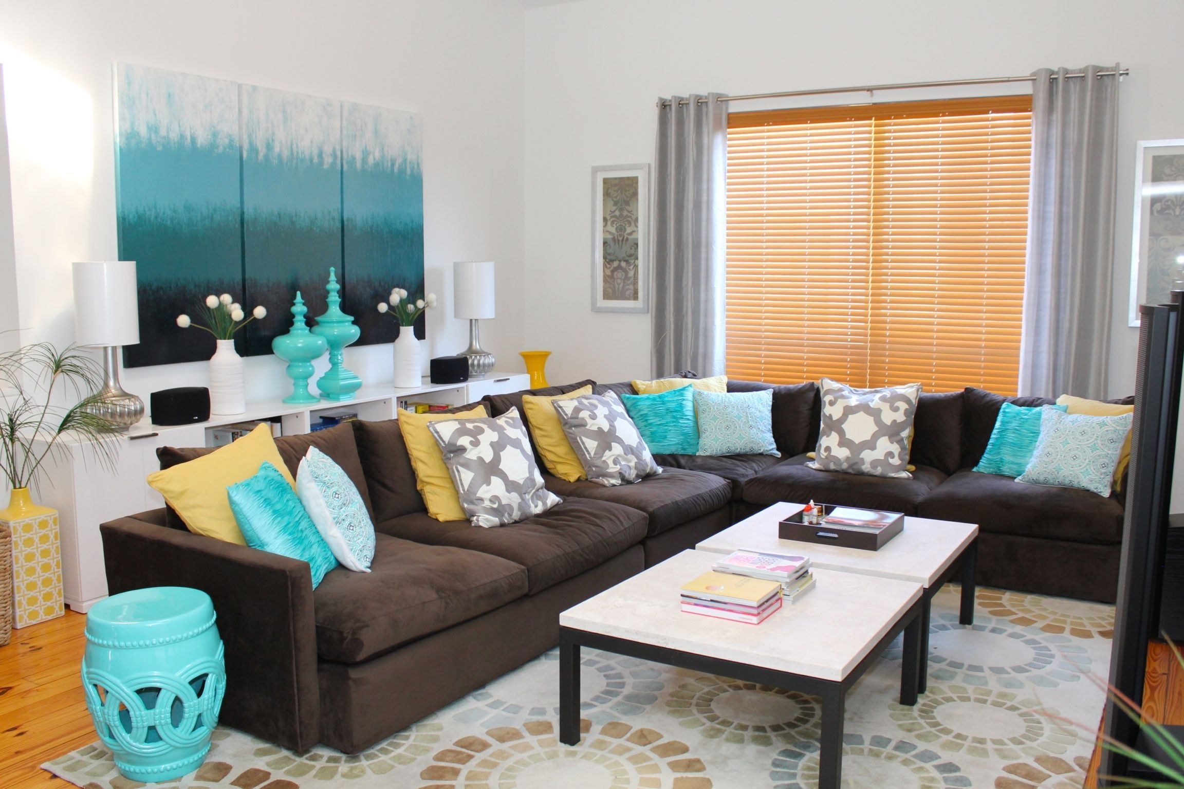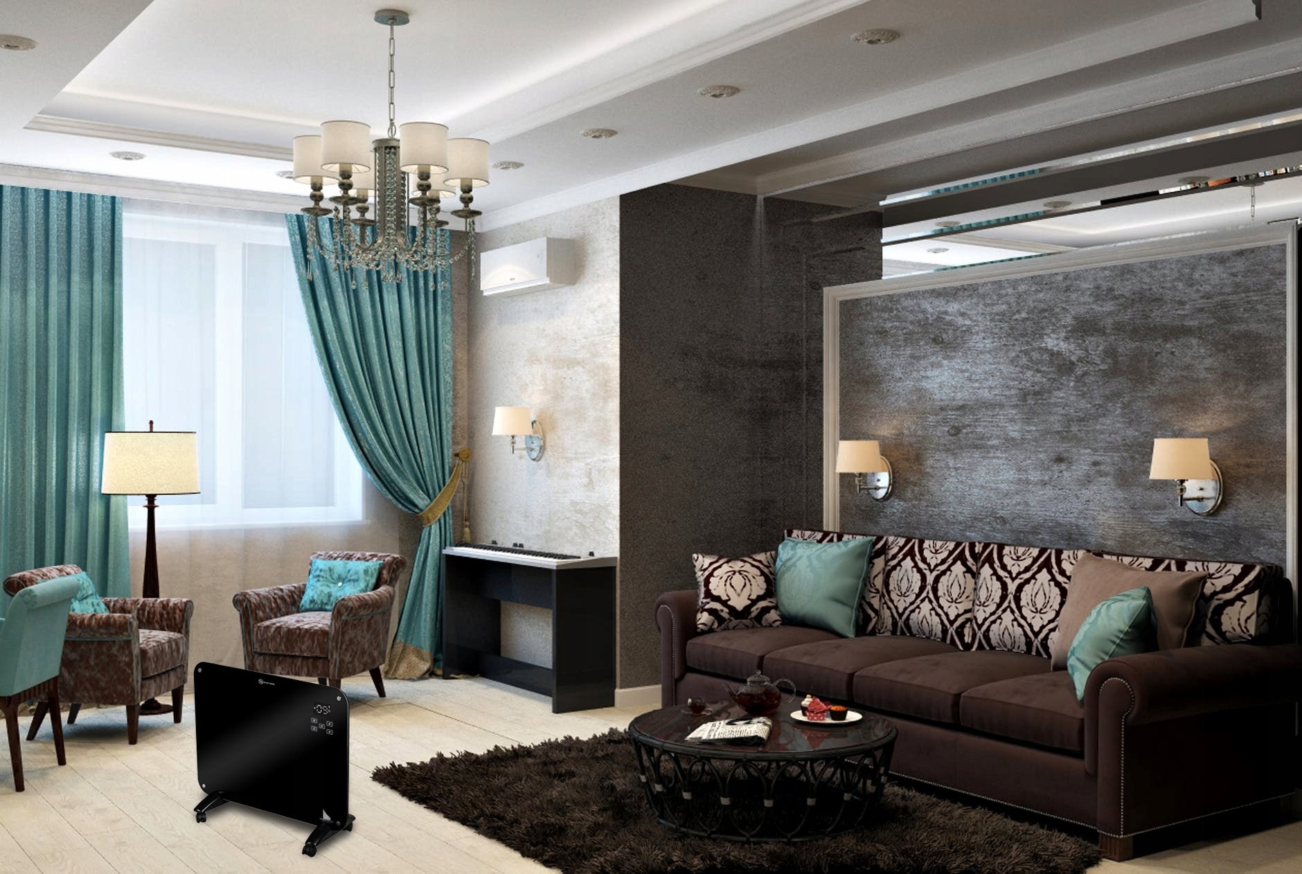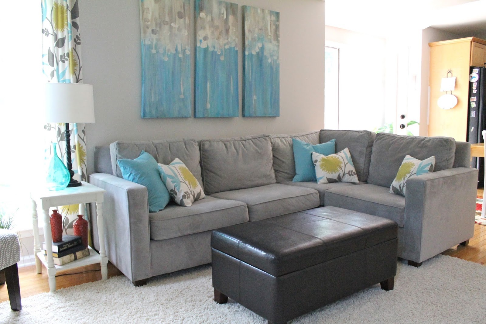 Бирюзовые шторы в гостиной с серым диваном (99 фото)
