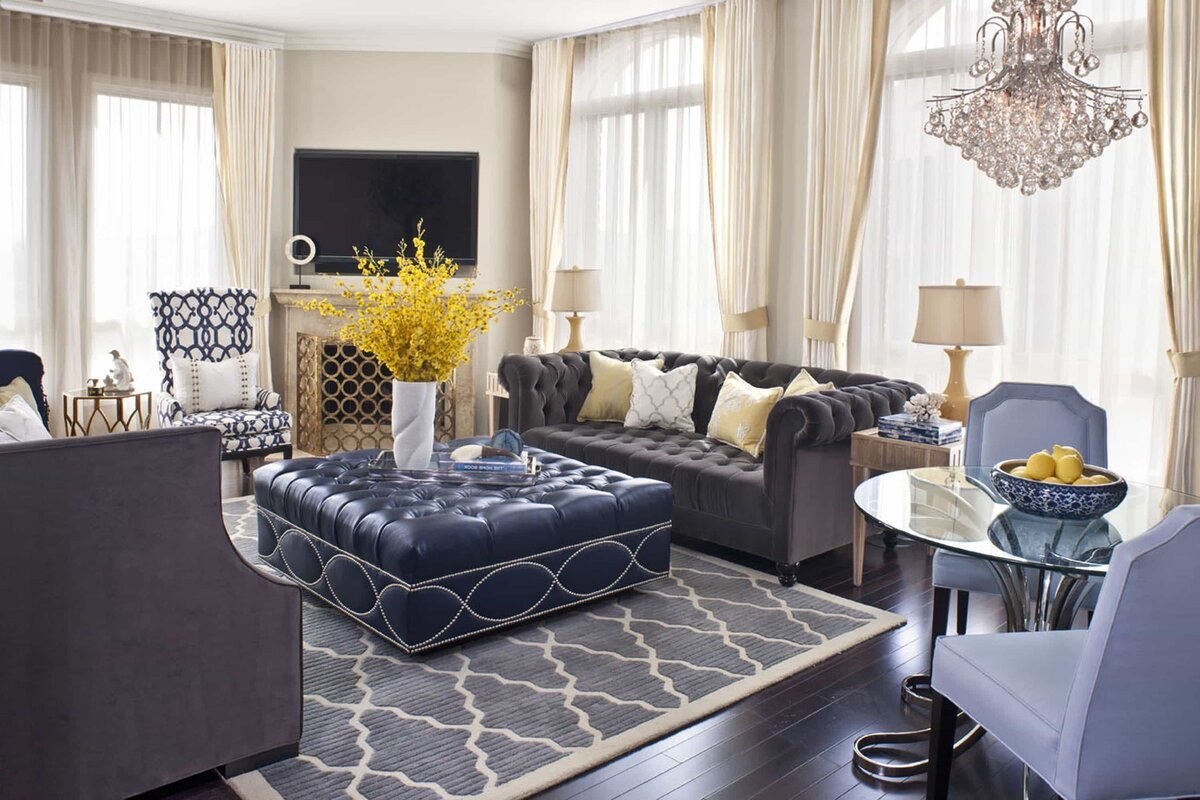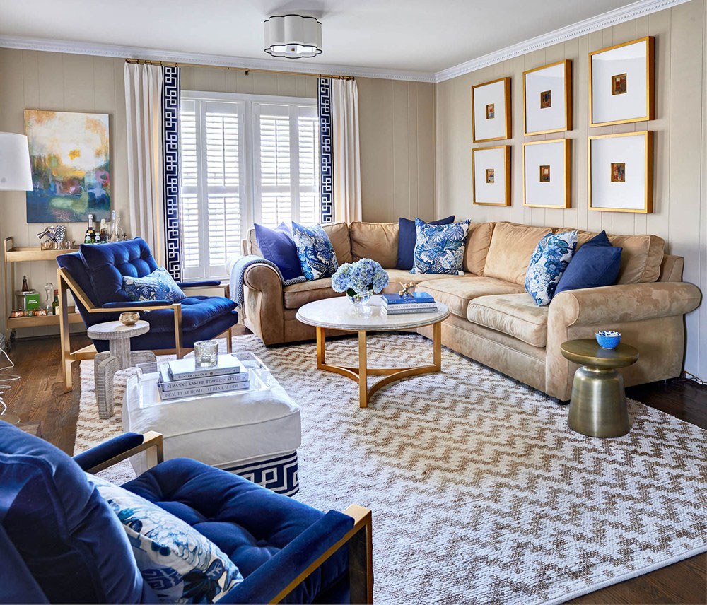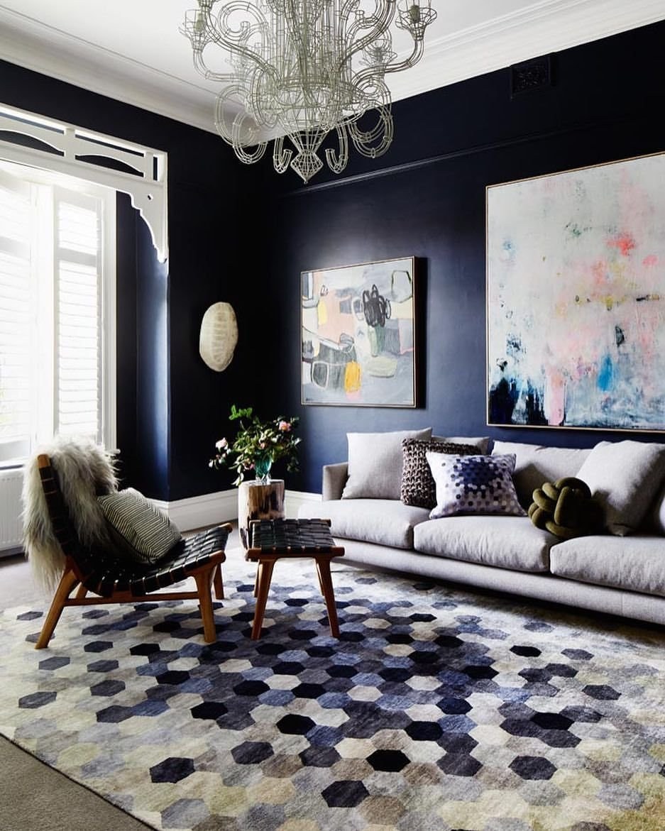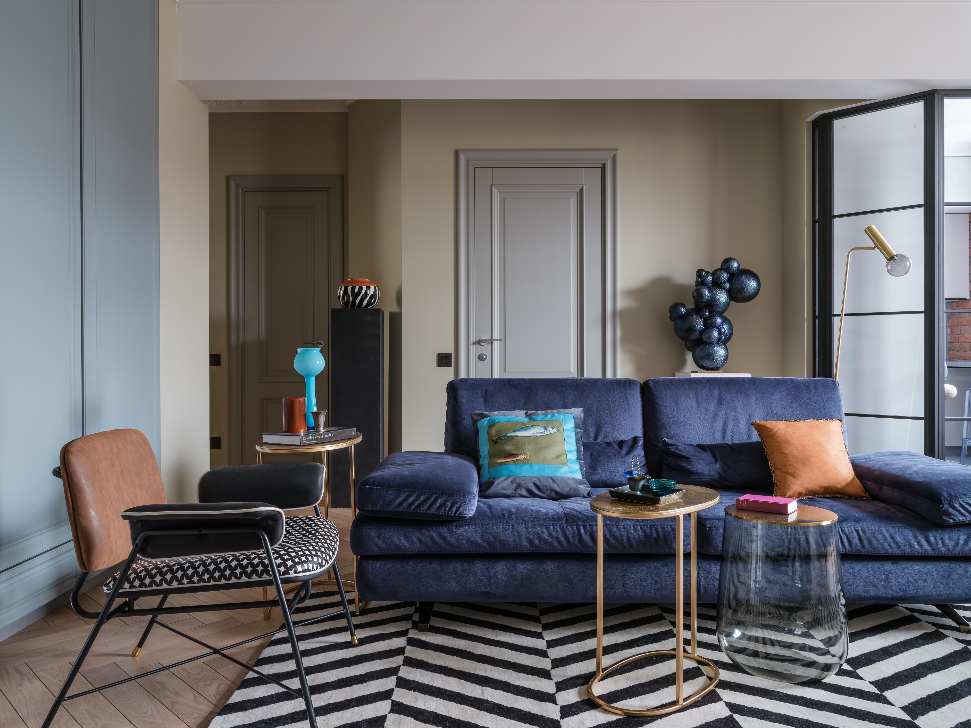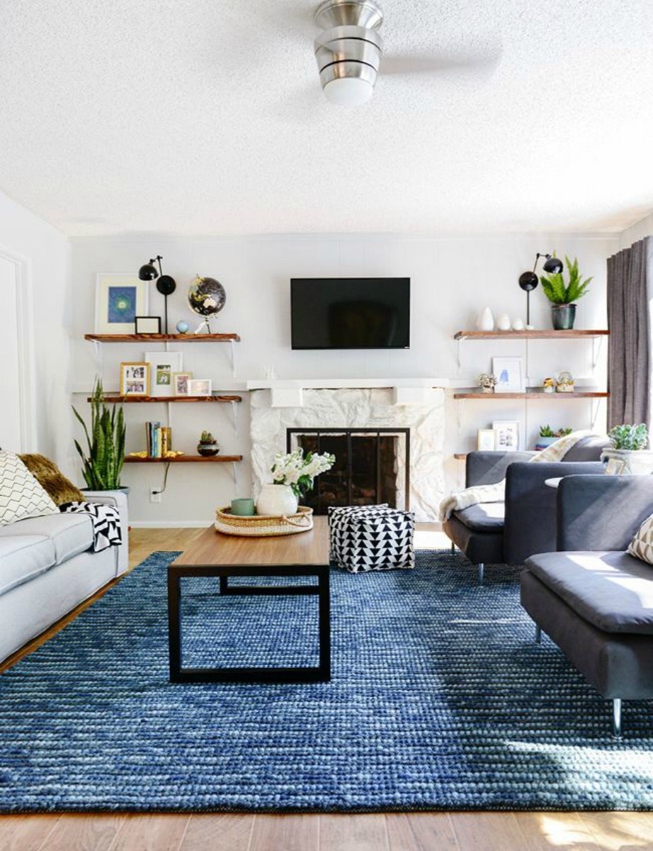 Синий ковер в интерьере гостиной