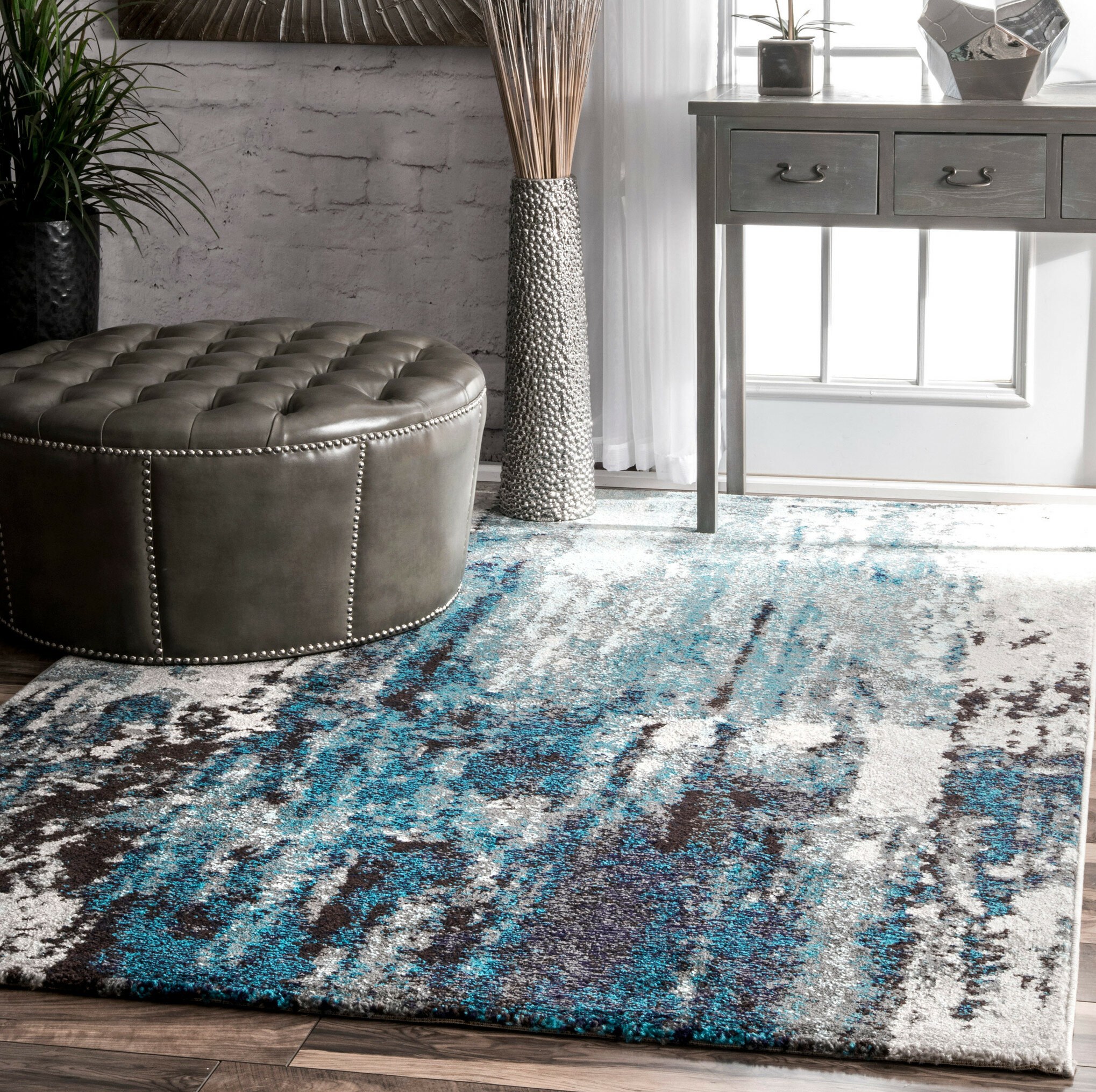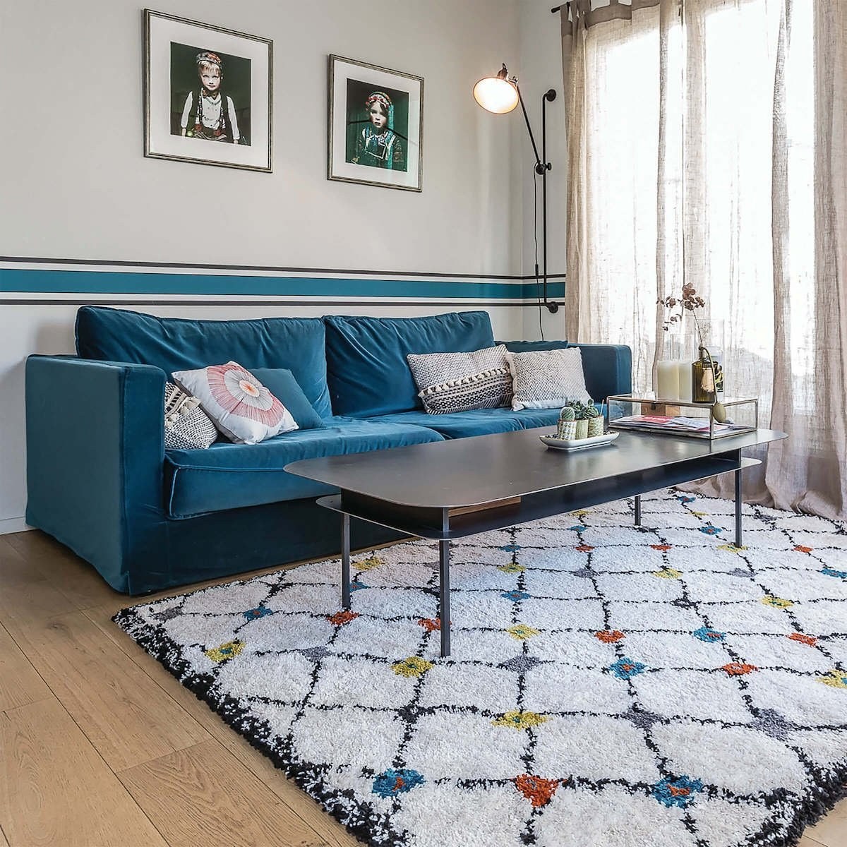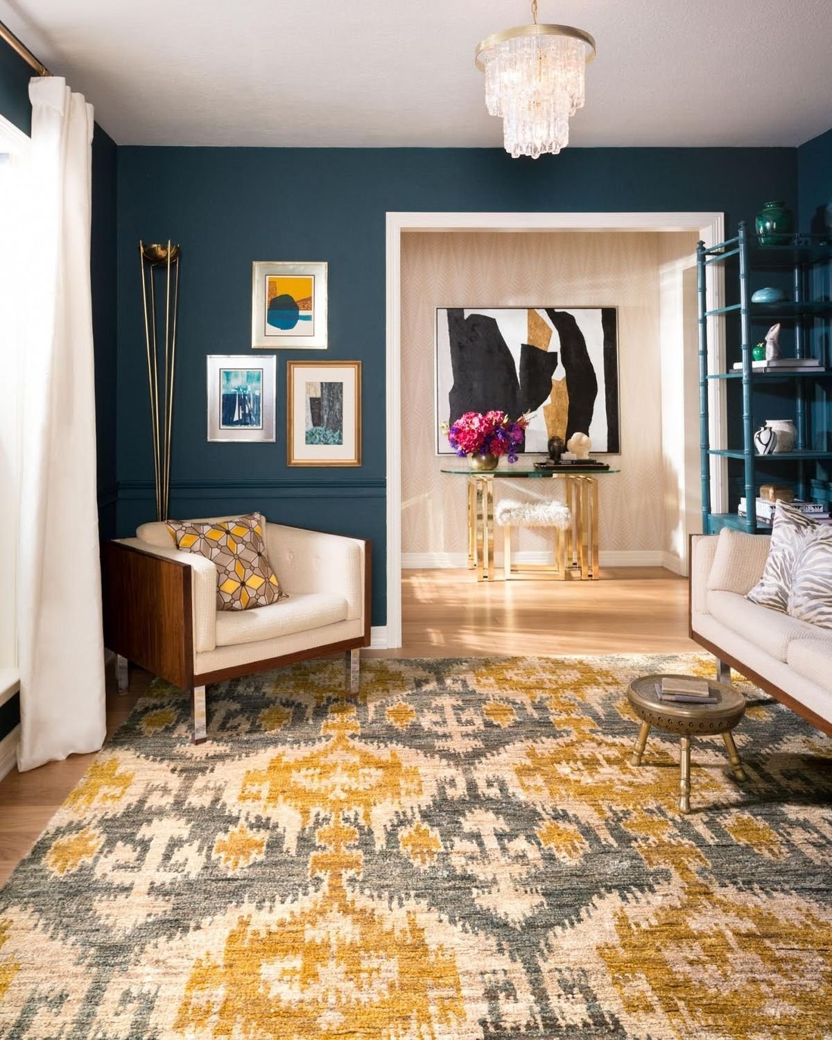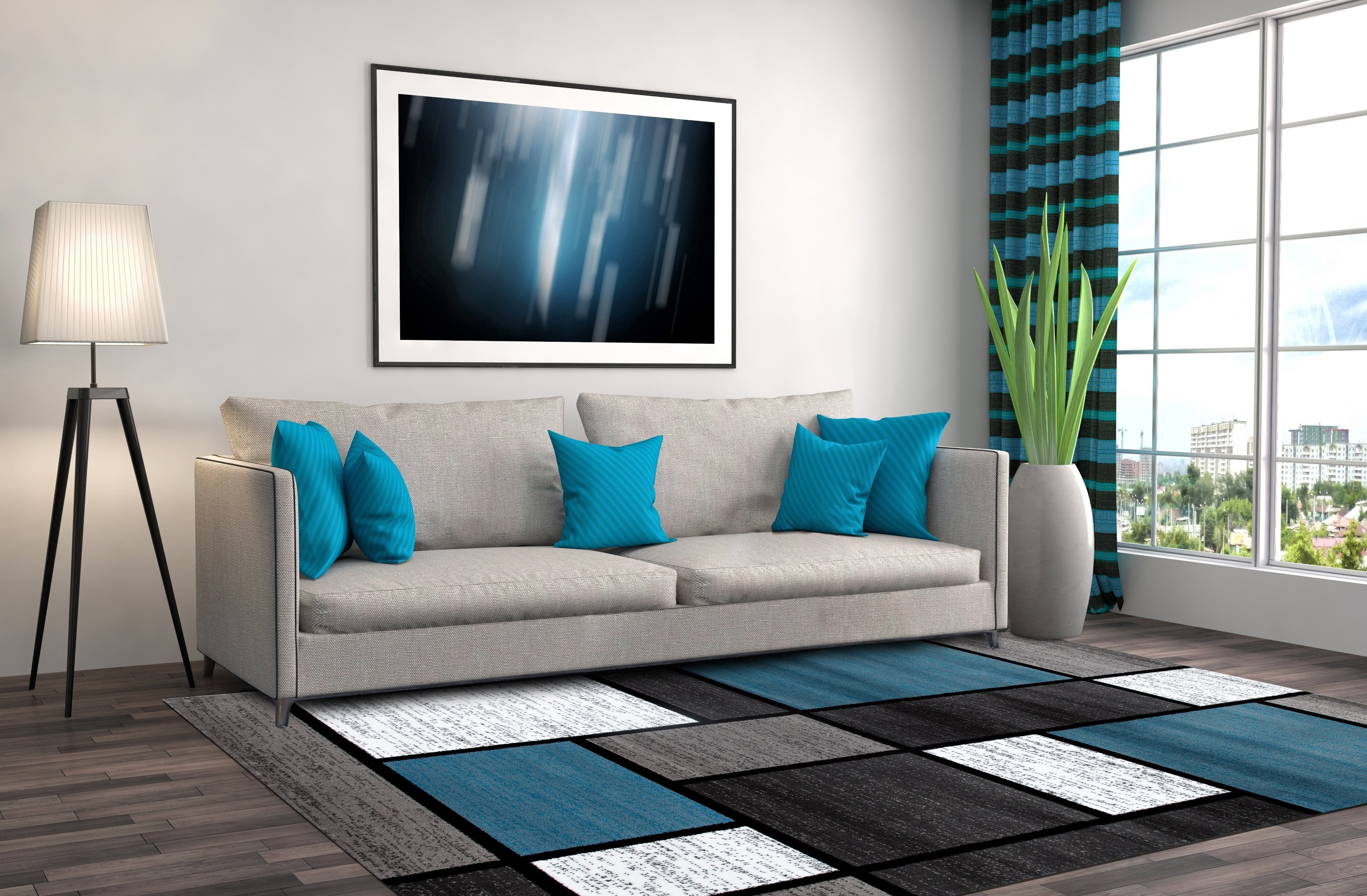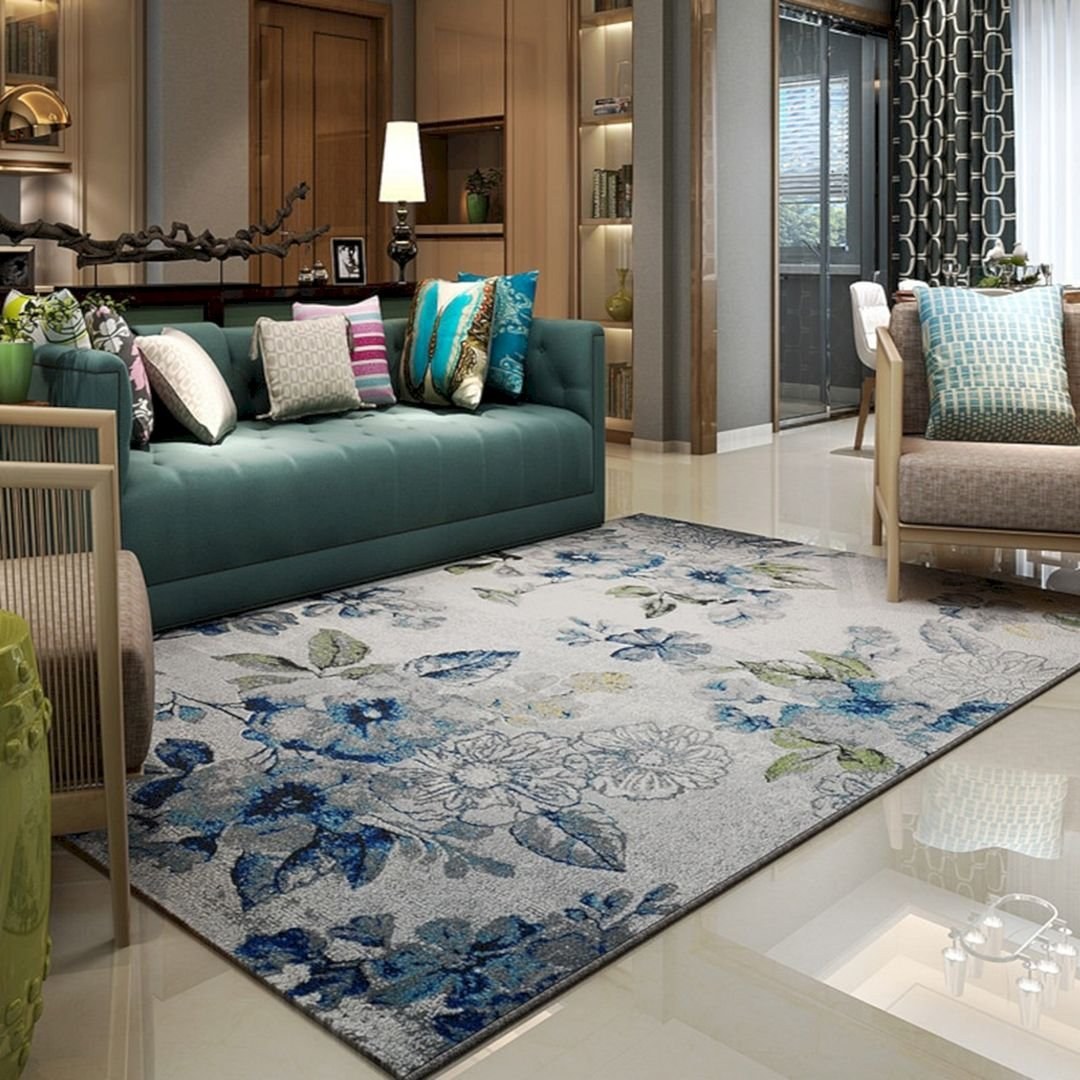 Бирюзовый ковер в интерьере гостиной