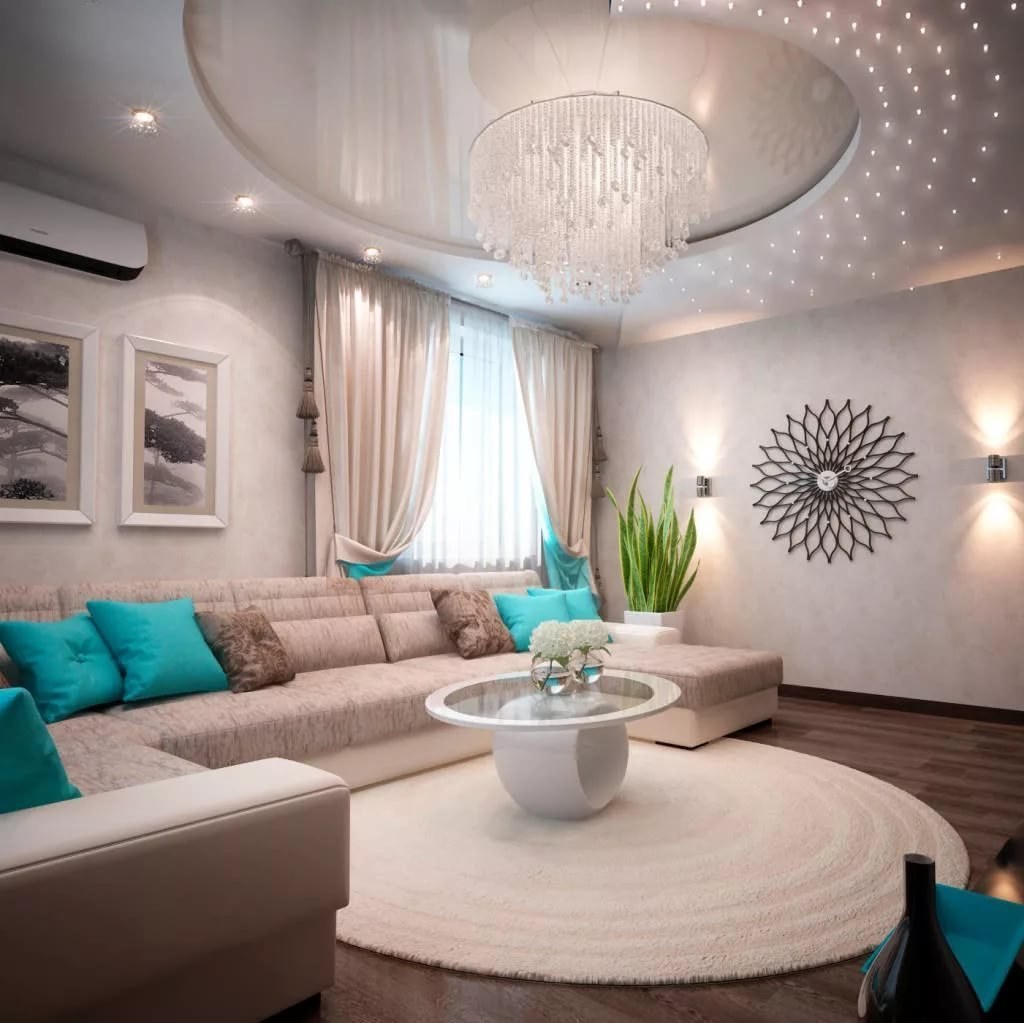 Гостиная в бело бирюзовых тонах
