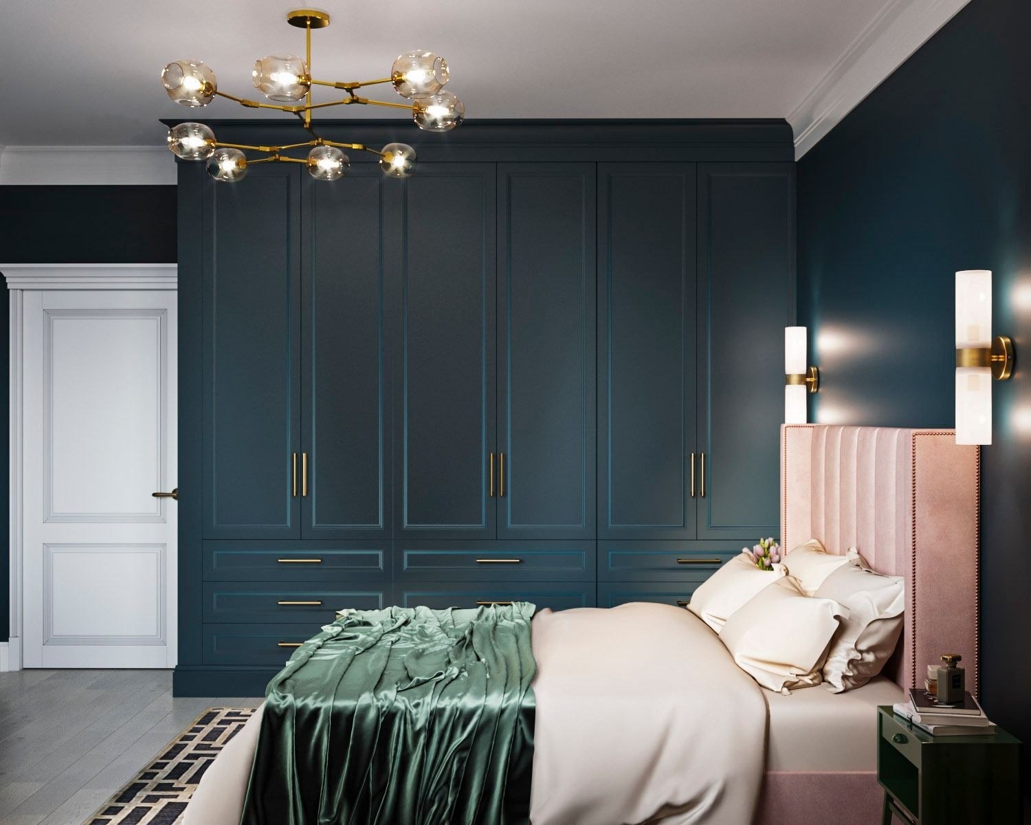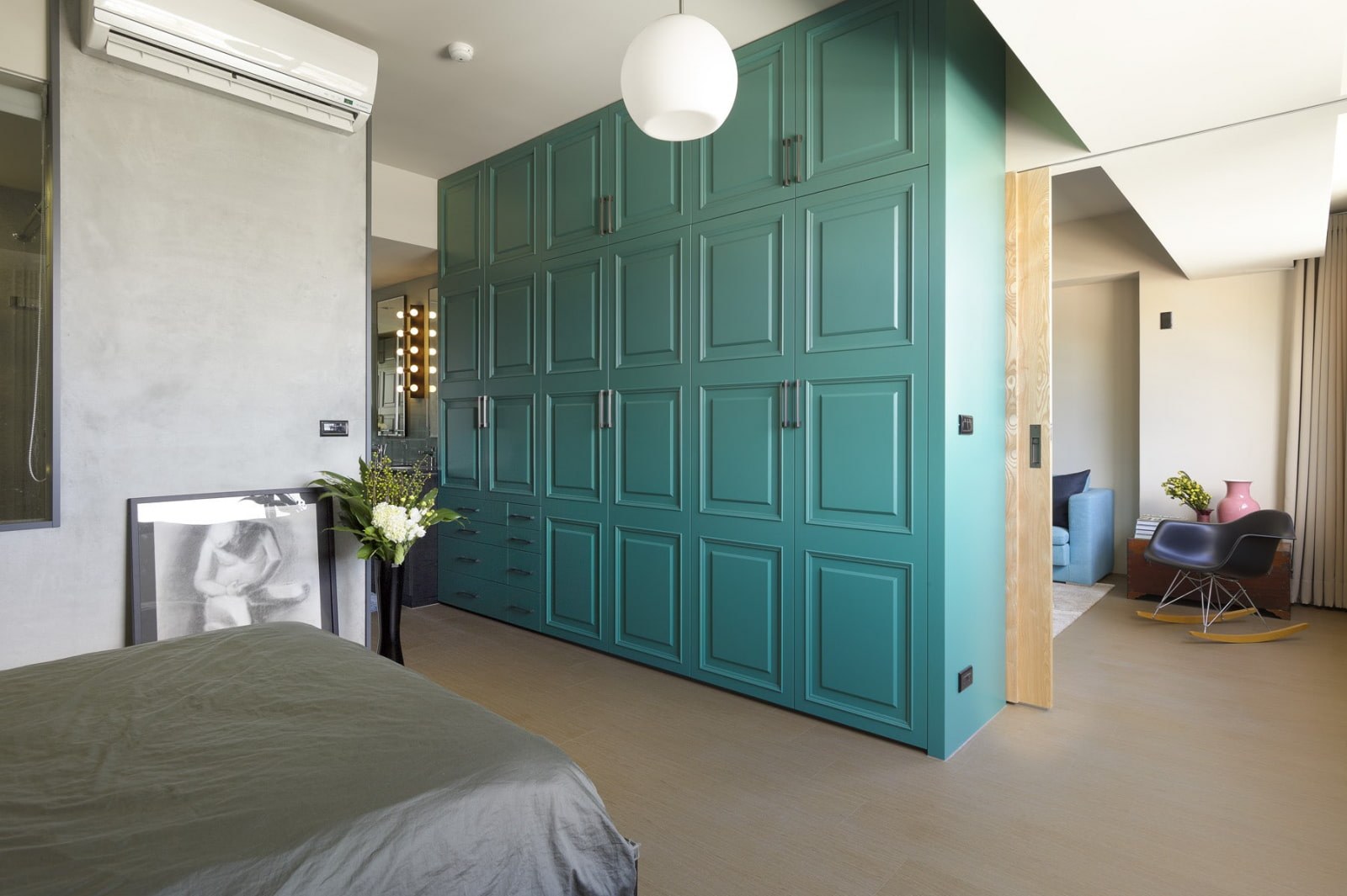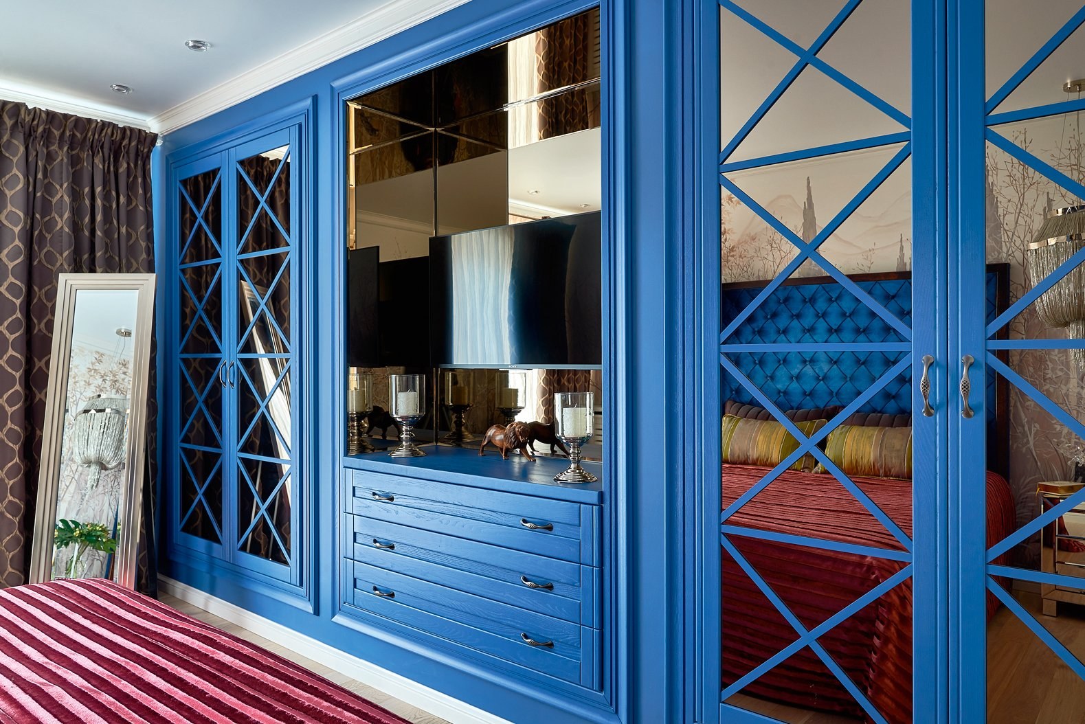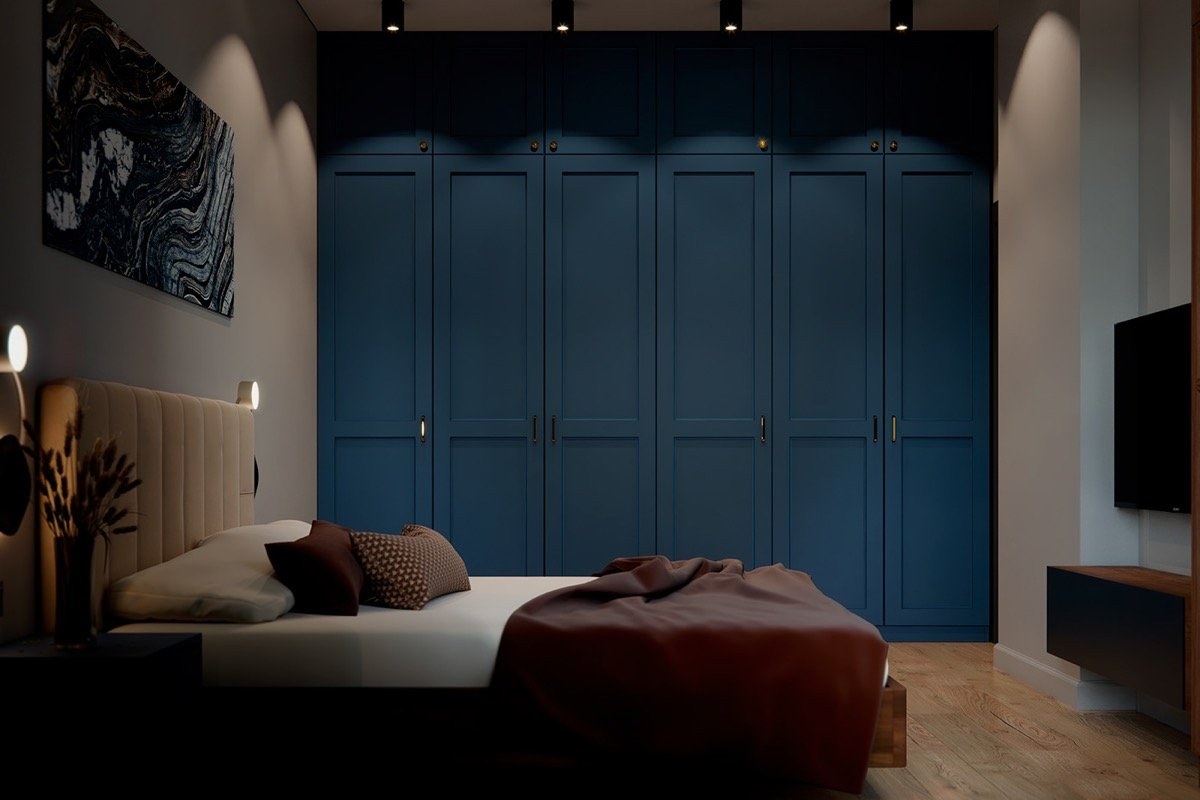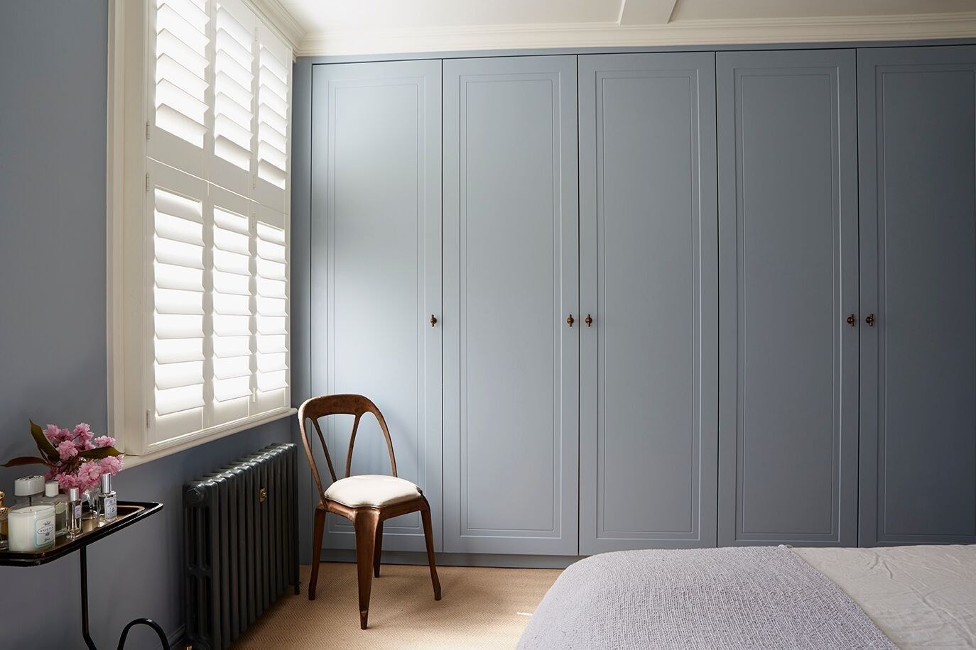 Шкаф с жалюзийными дверцами в интерьере спальни