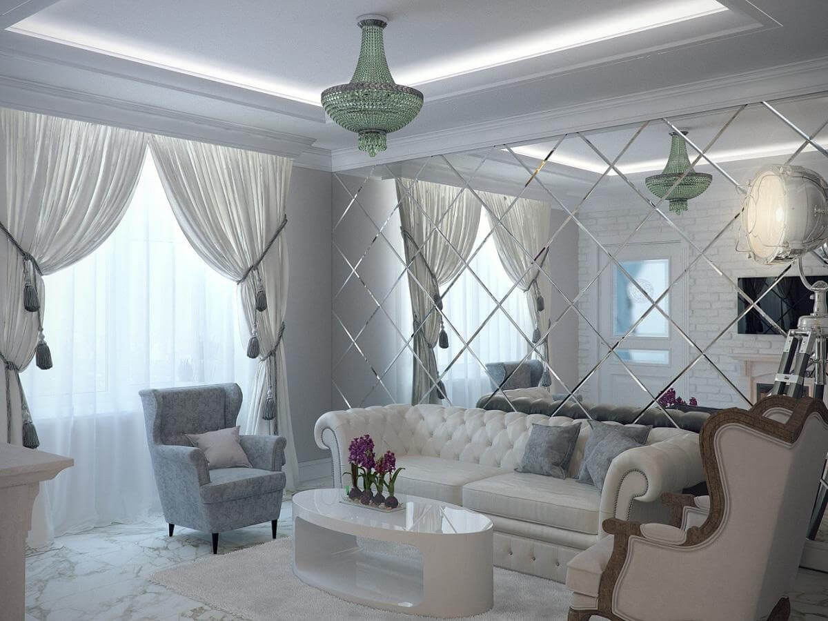 Зеркальная плитка в гостиной