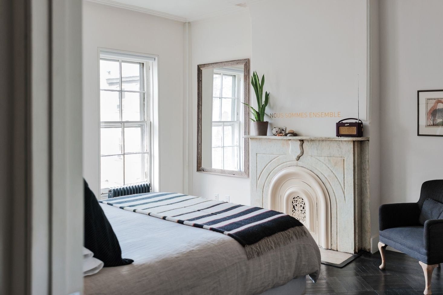 Кровать напротив окна в спальне