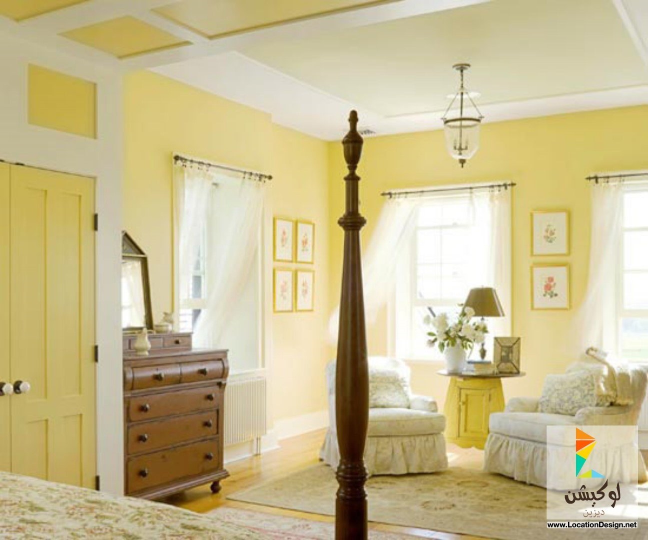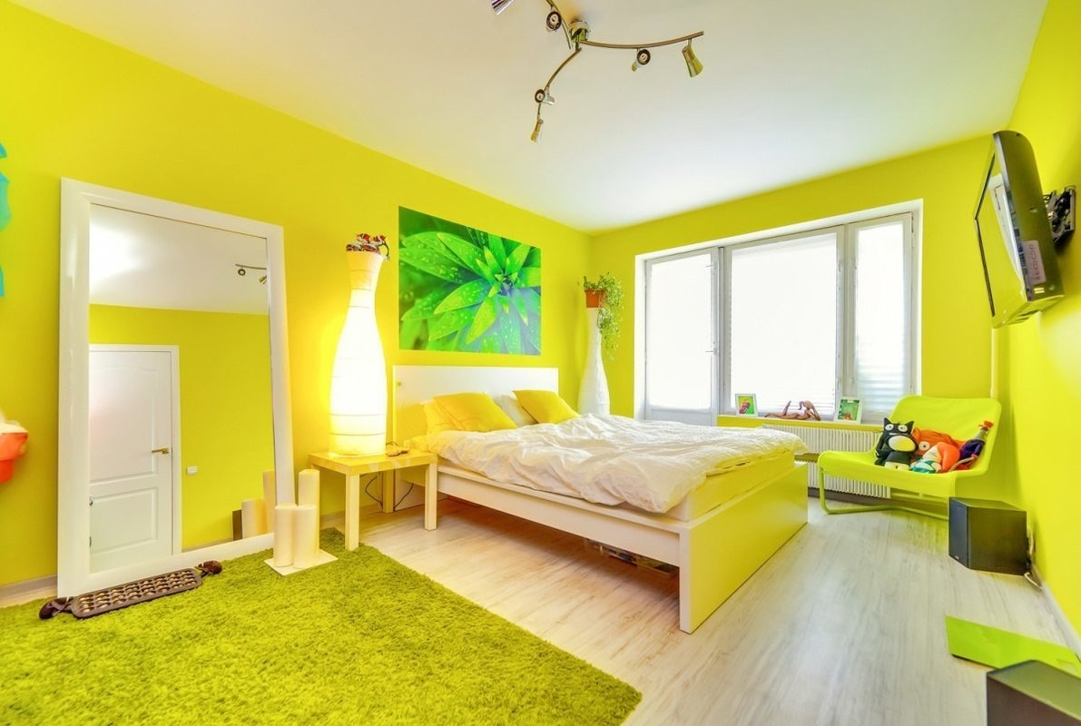 Лимонные стены в спальне