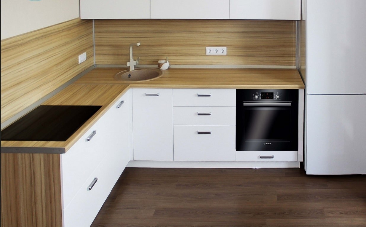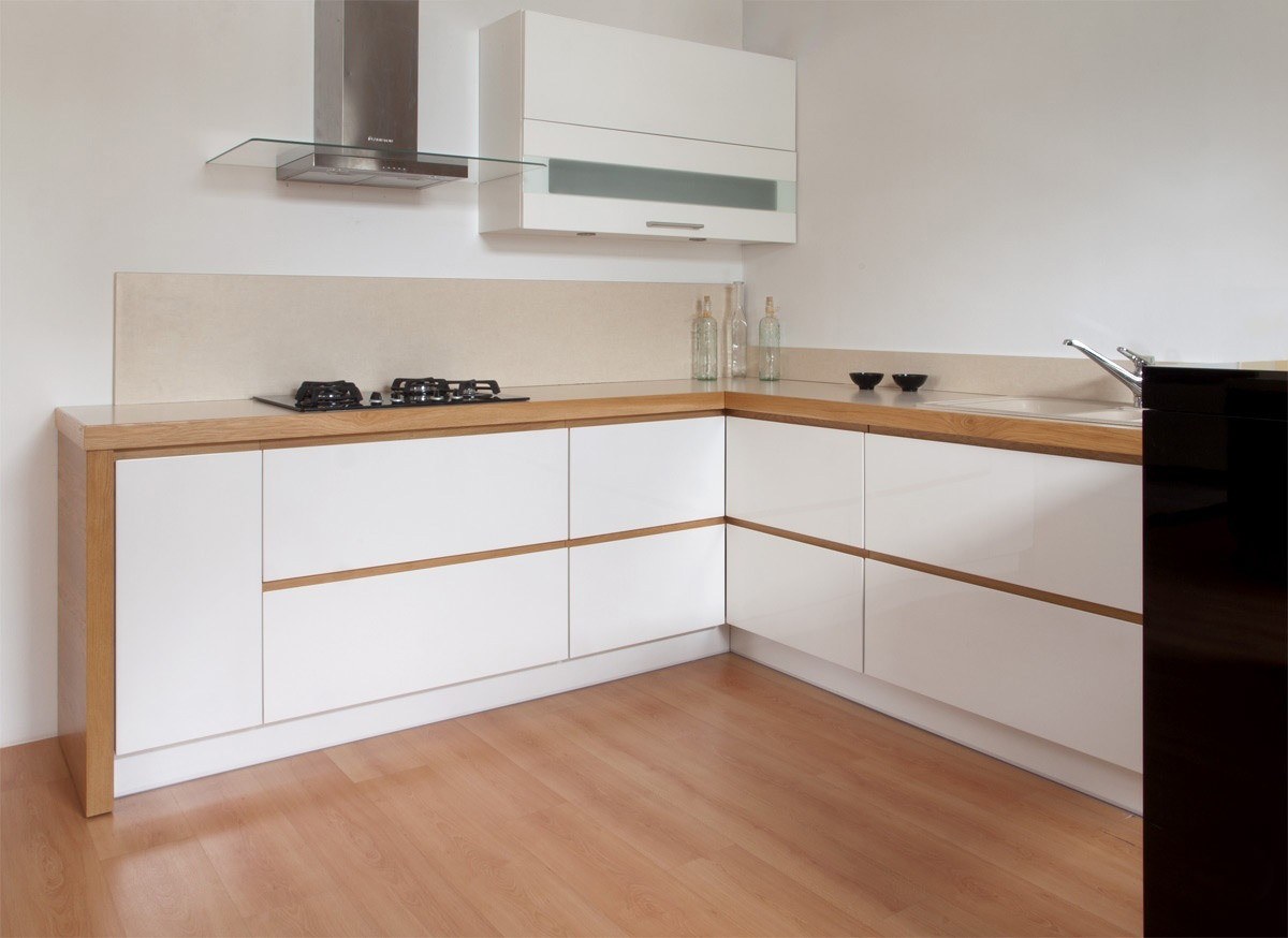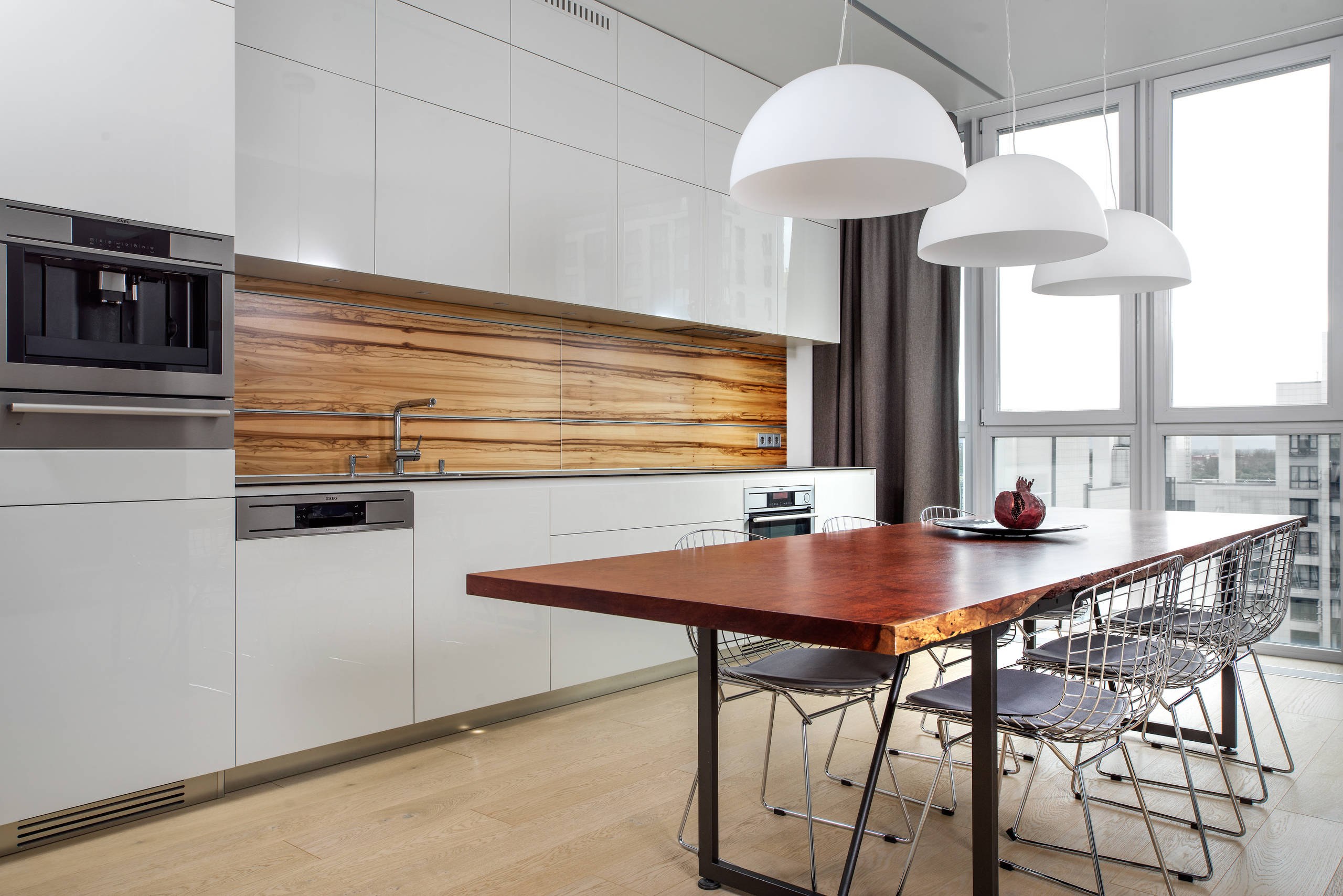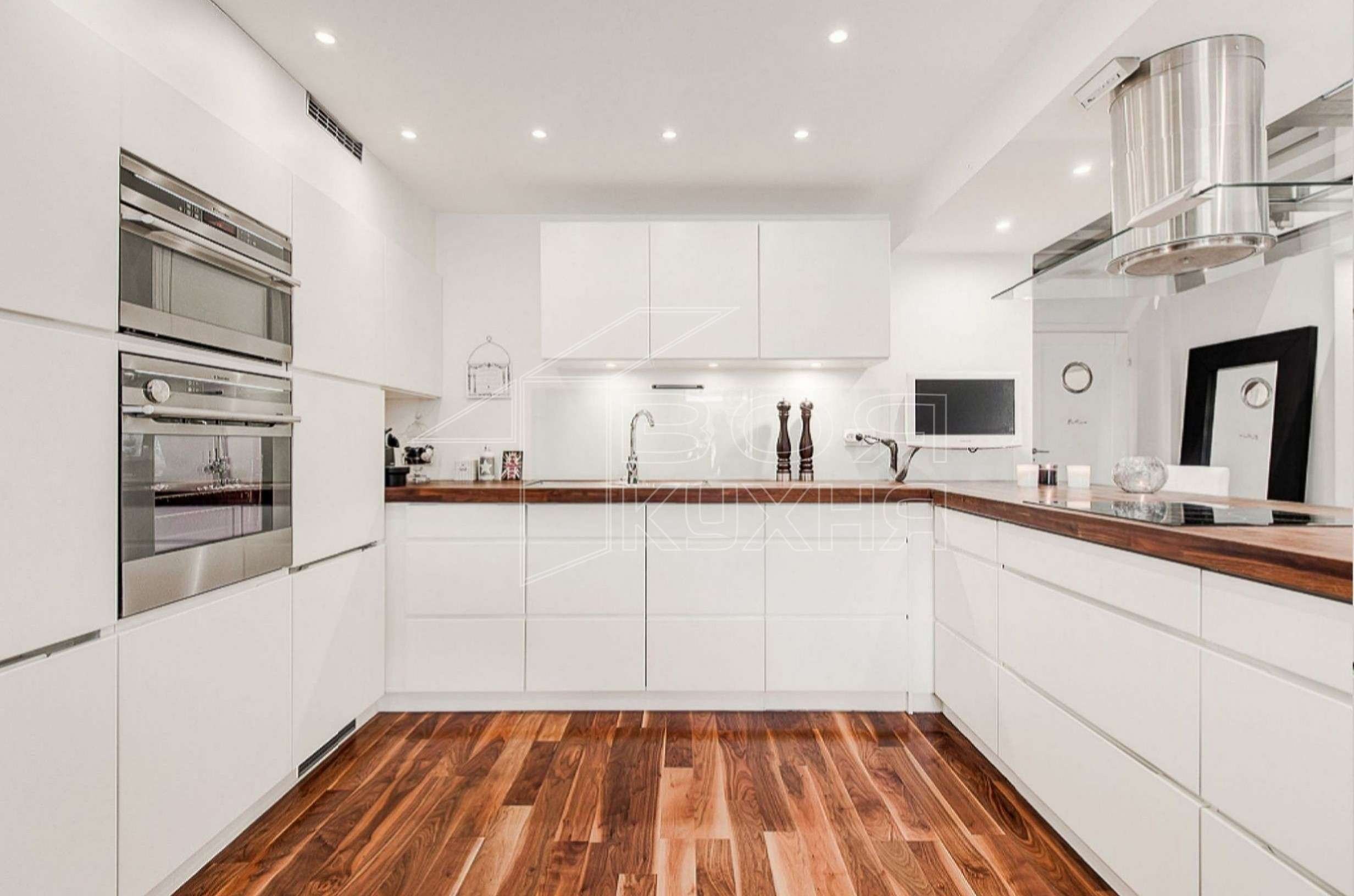 Белые кухни в современном стиле с деревянной столешницей (94 фото)