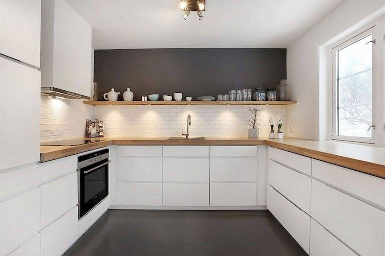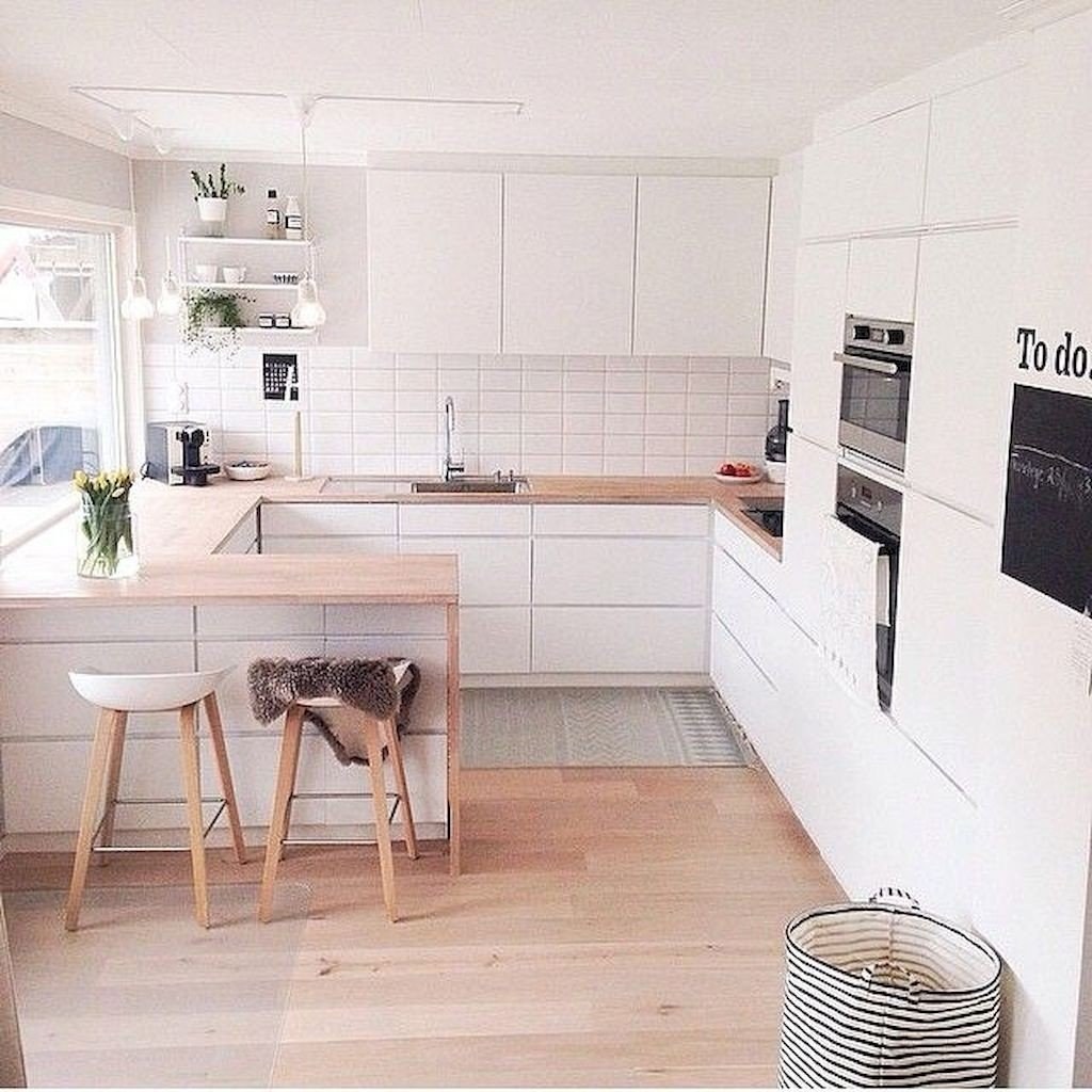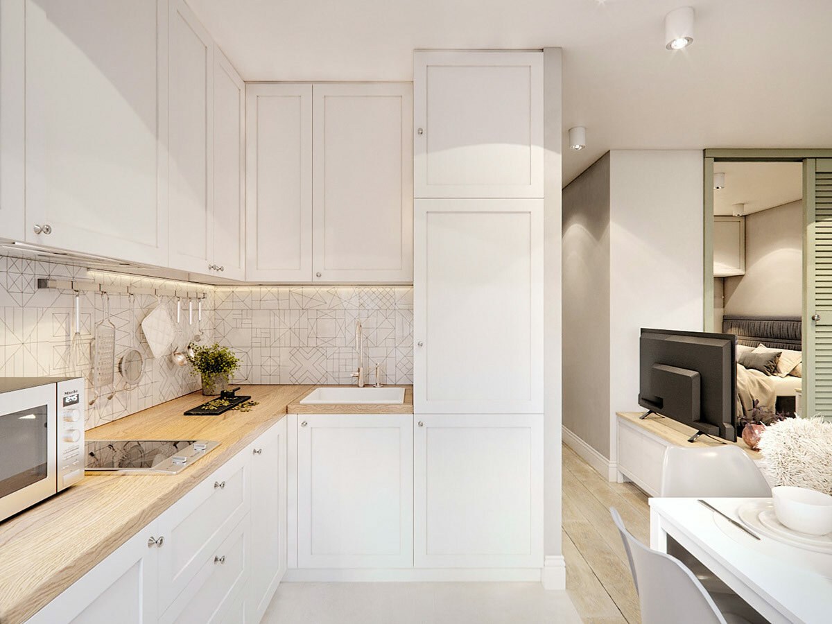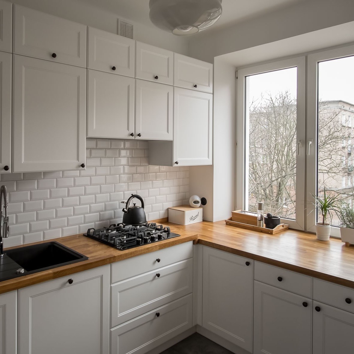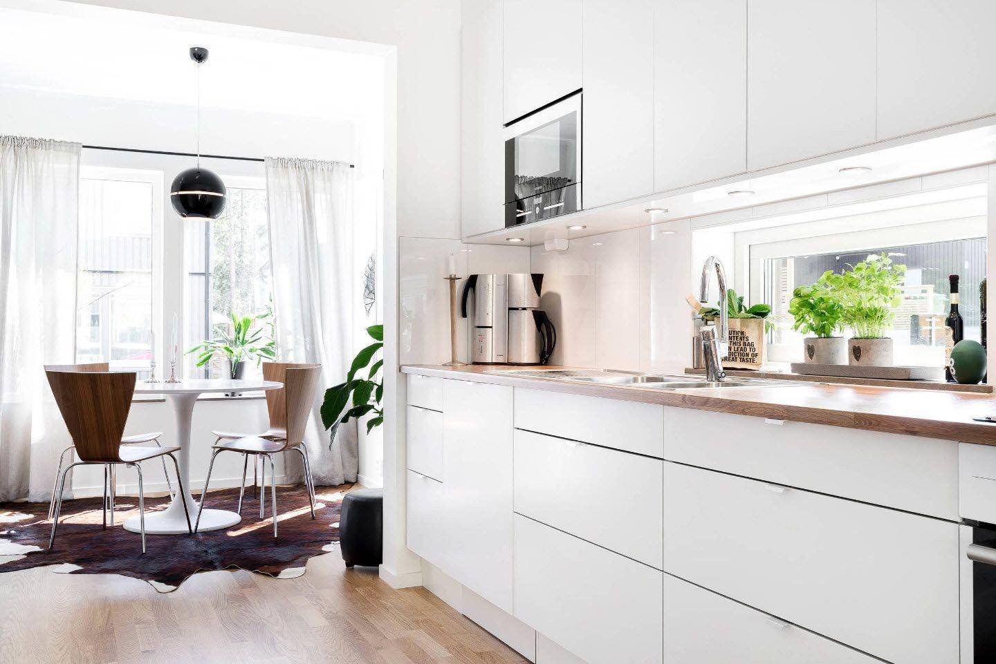 Белая кухня с деревянной столешницей в скандинавском стиле
