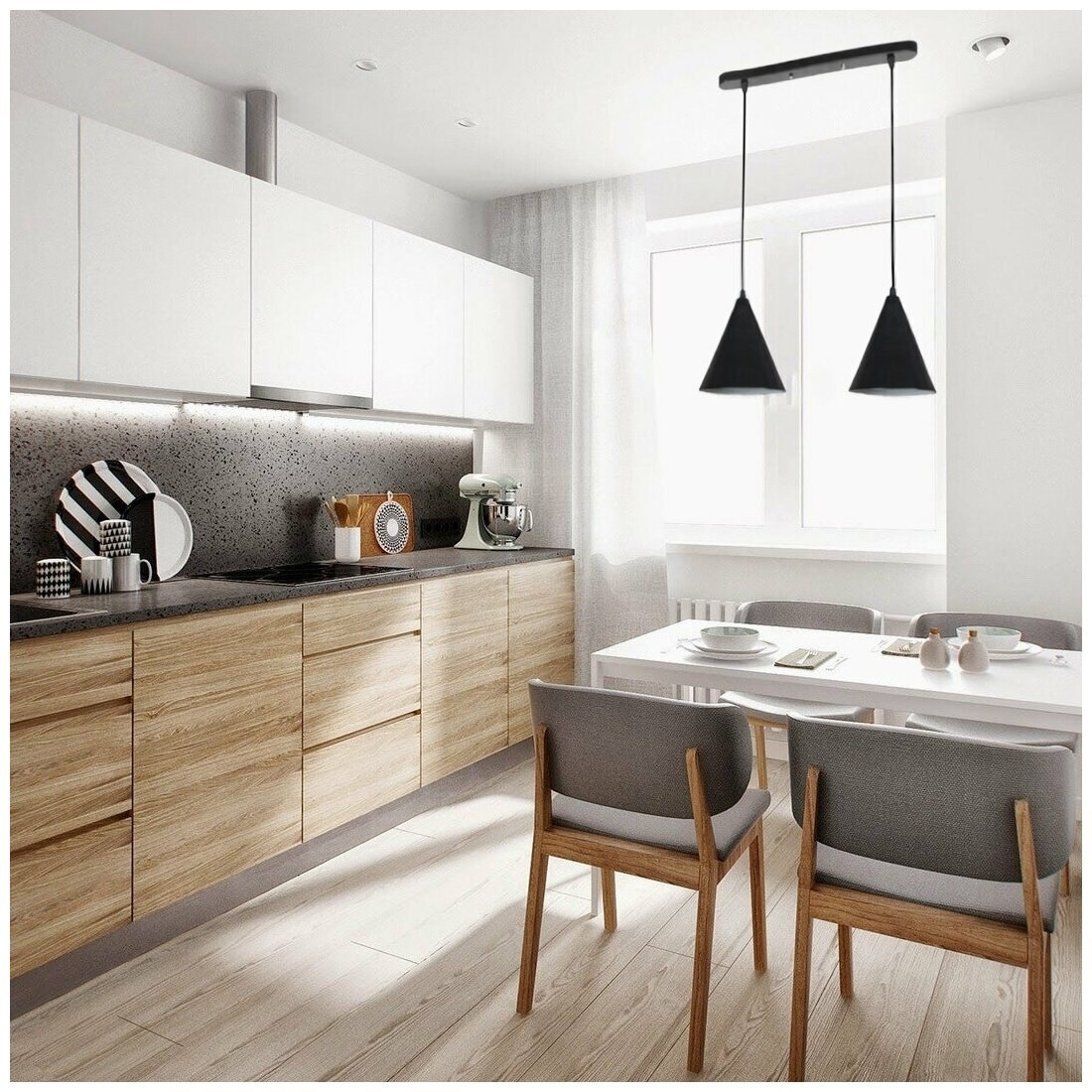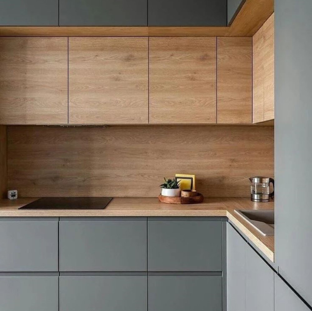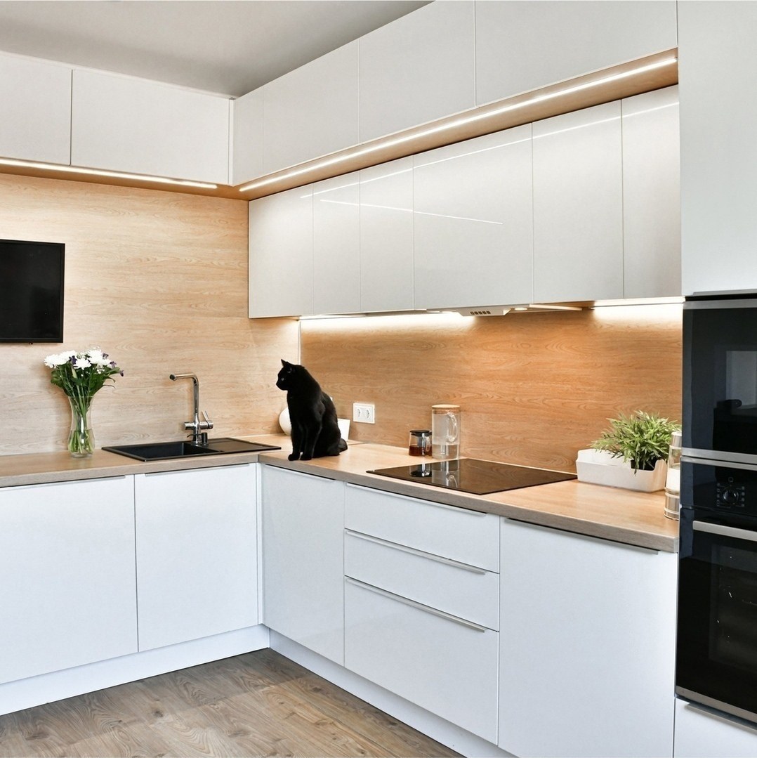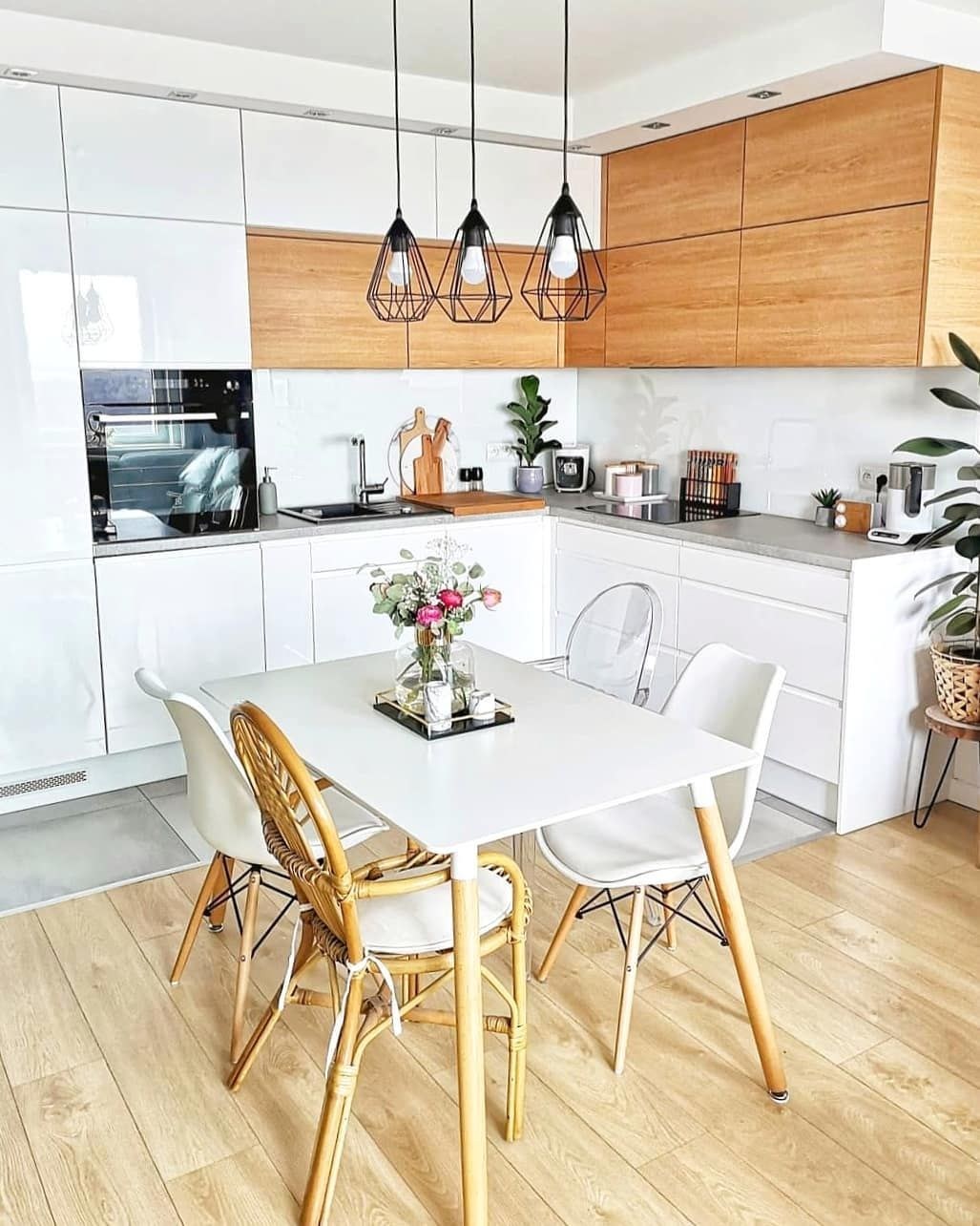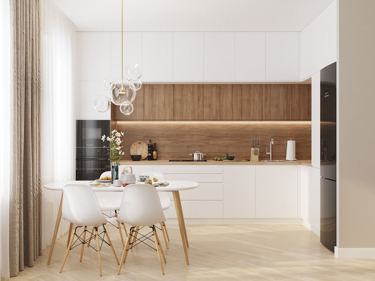 Белая кухня с деревянной столешницей в скандинавском стиле
