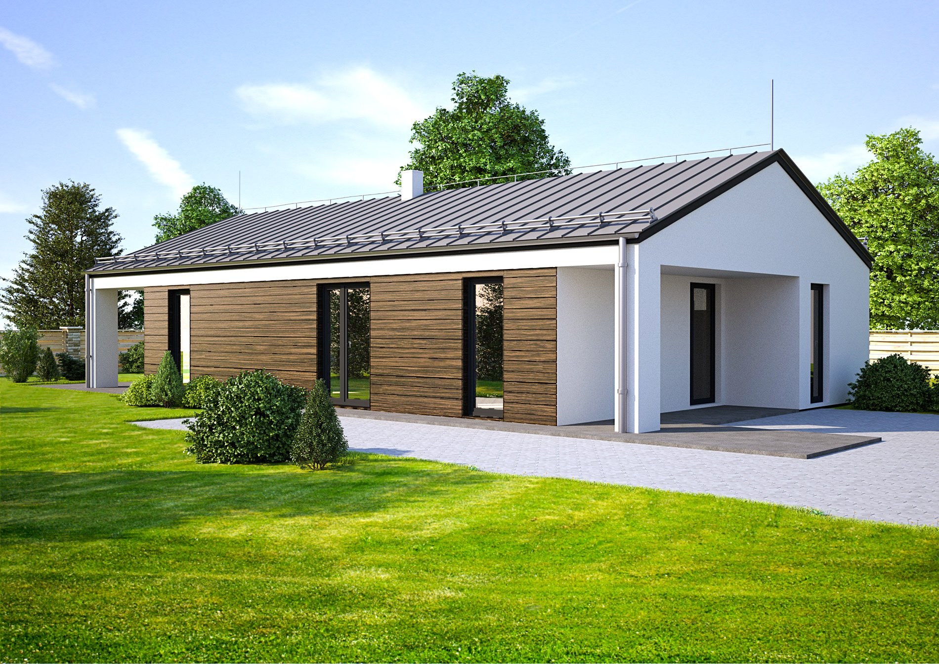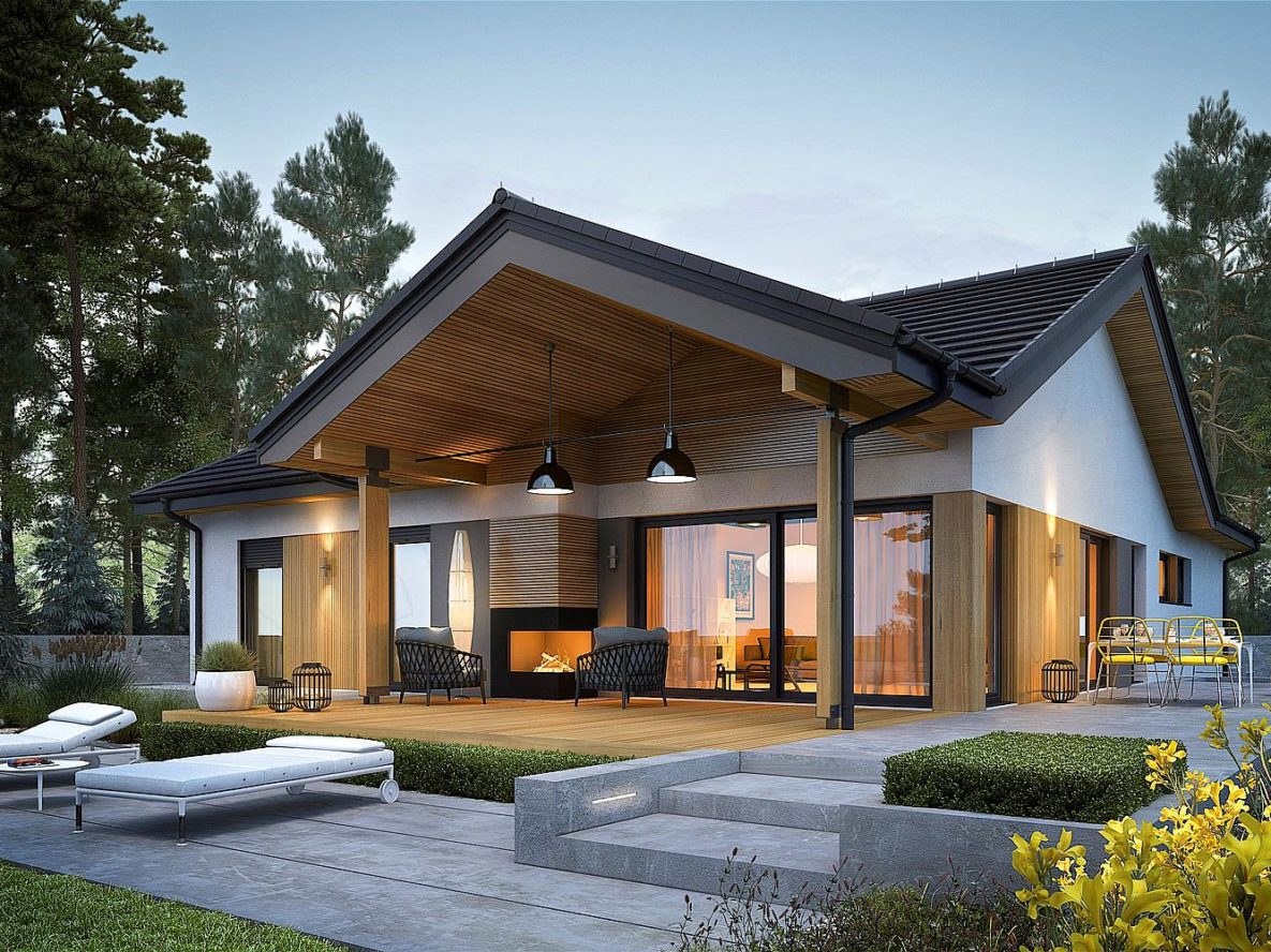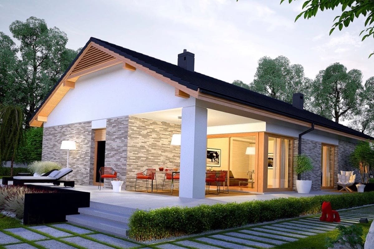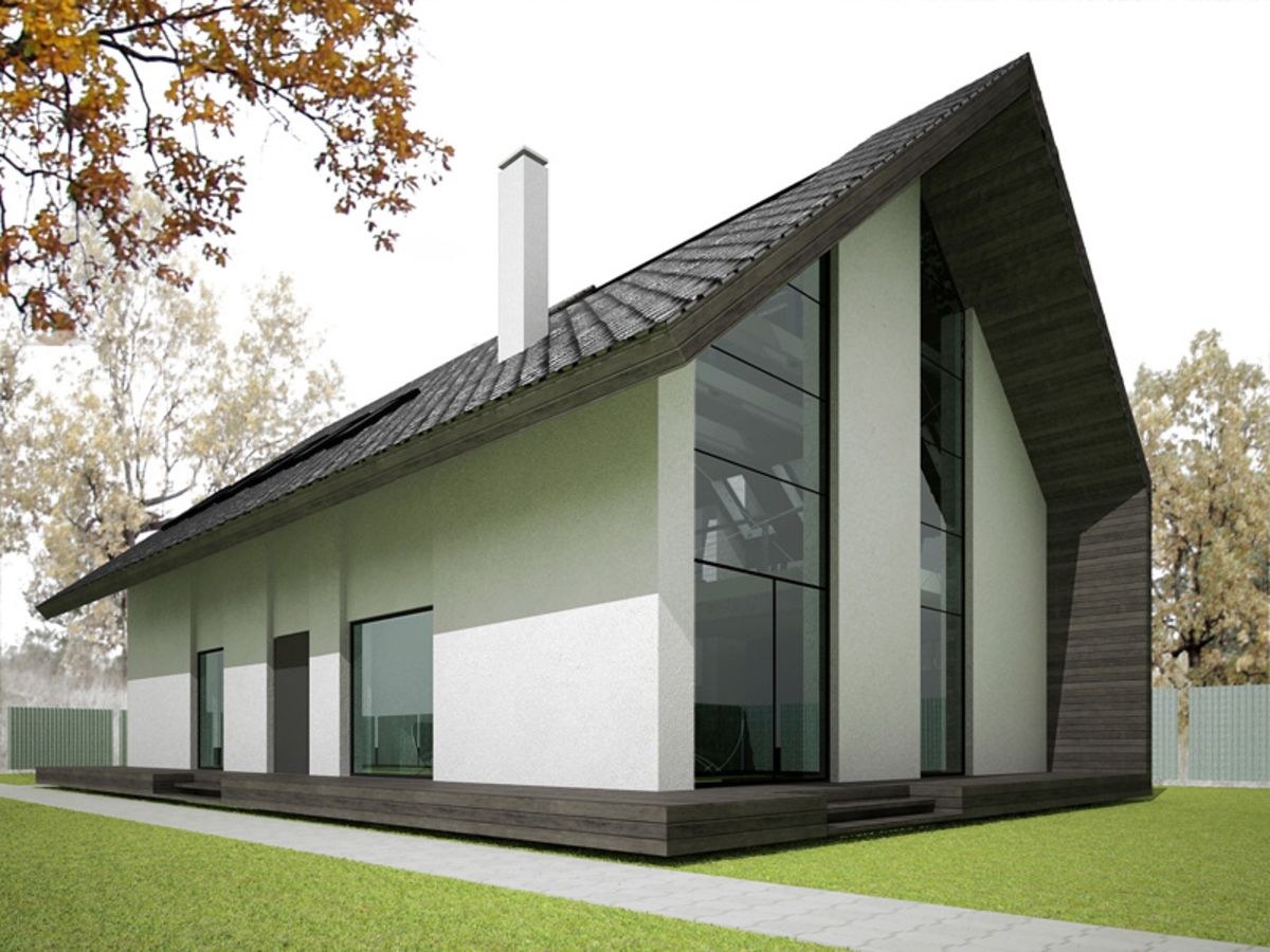 Одноэтажный дом с двухскатной крышей в современном стиле (94 фото)