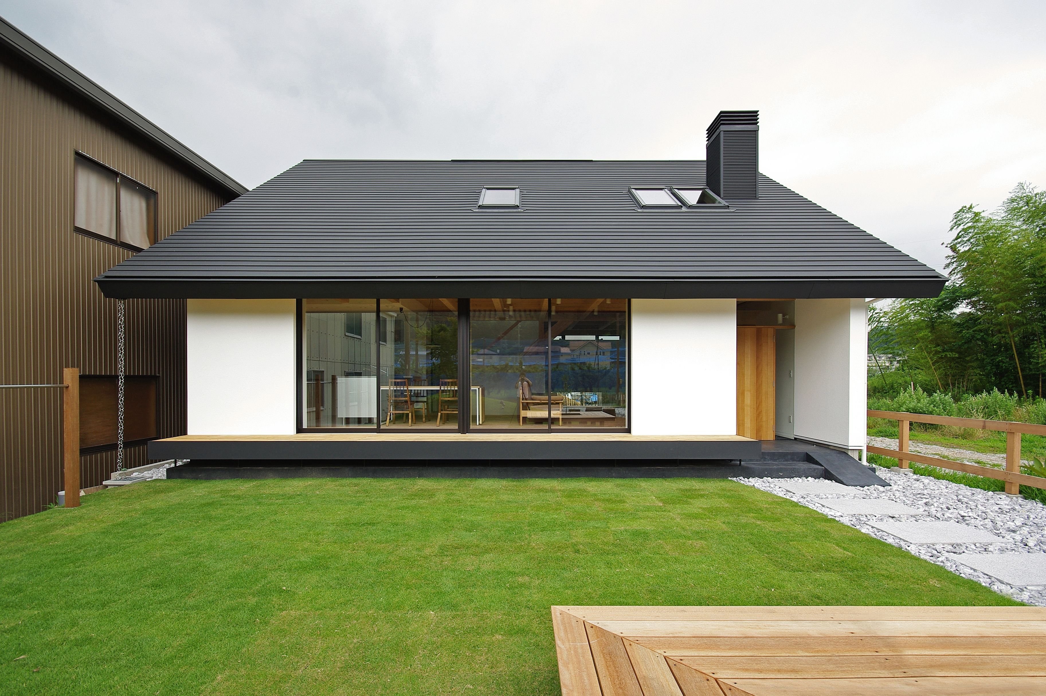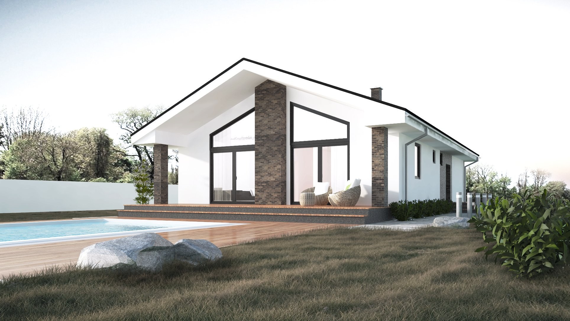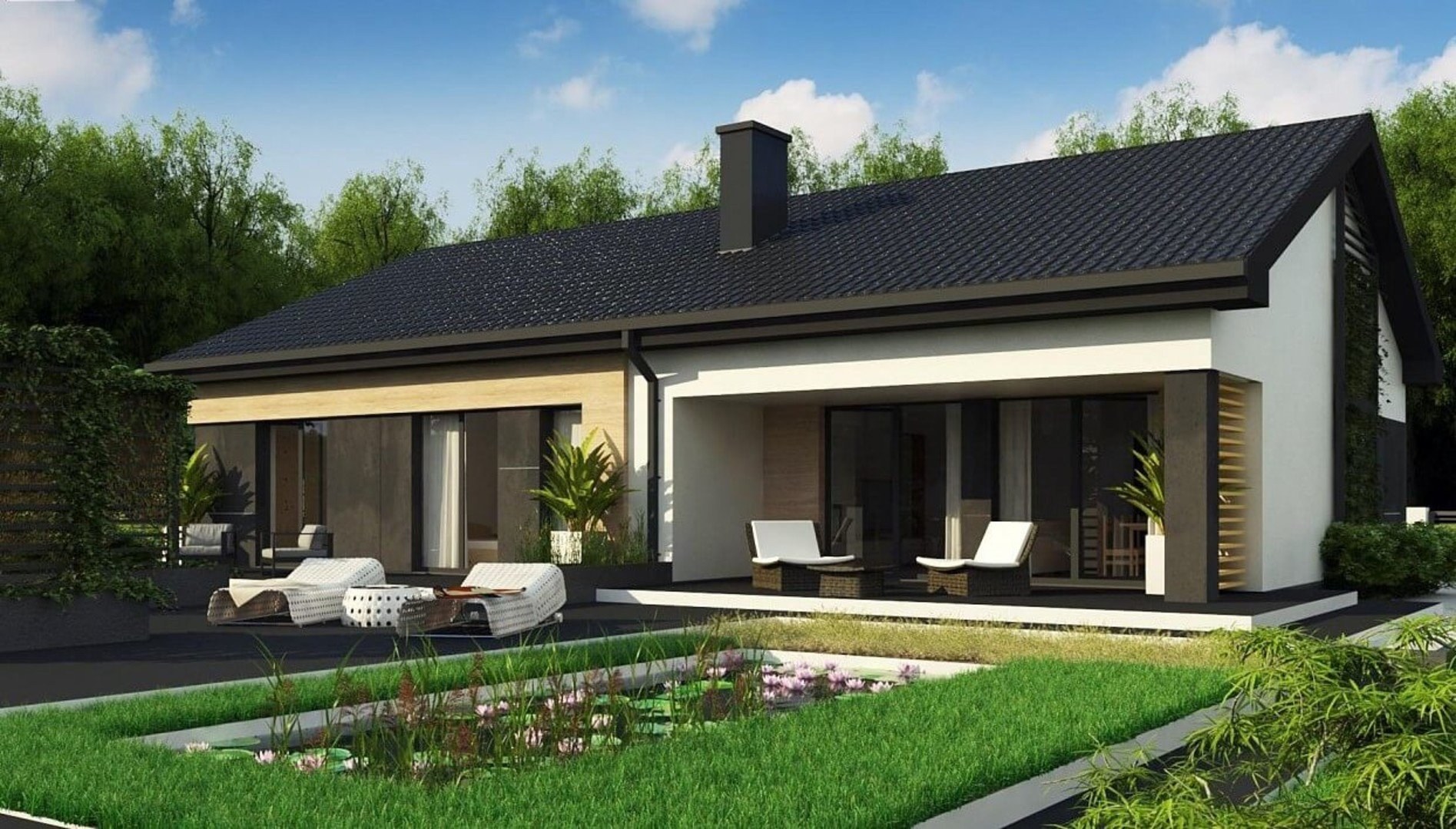 Одноэтажный дом с двухскатной крышей в современном стиле (94 фото)