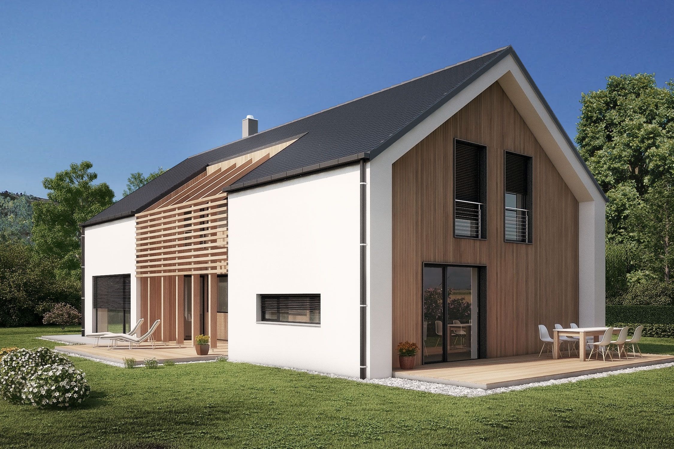 Дом с двухскатной крышей и террасой