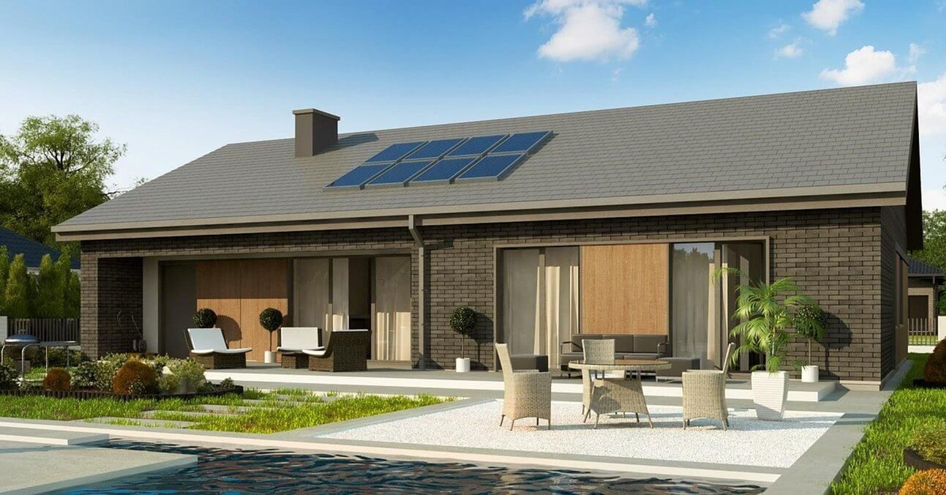 Современный одноэтажный дом с панорамными окнами
