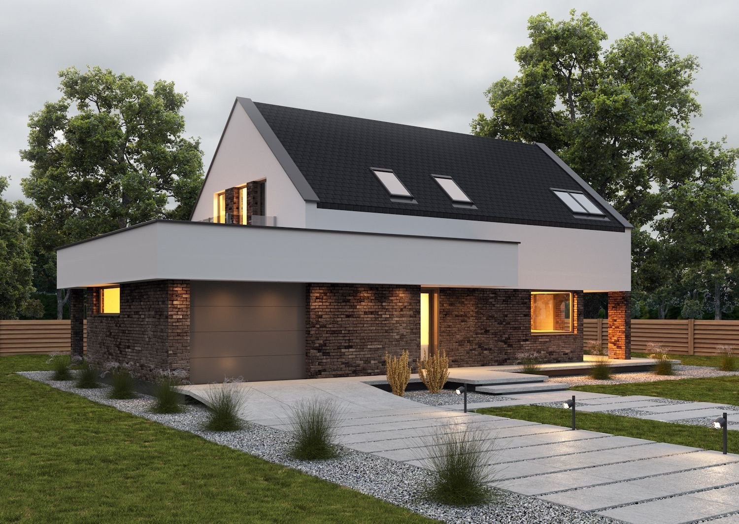 Одноэтажный дом с гаражом с двускатной крышей