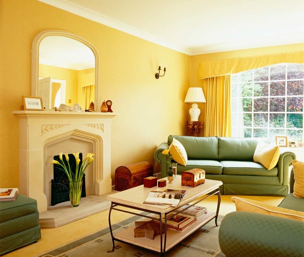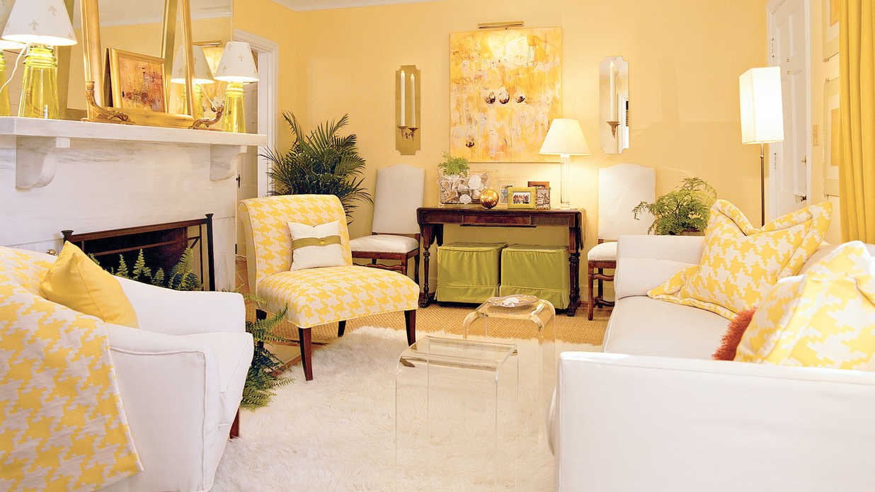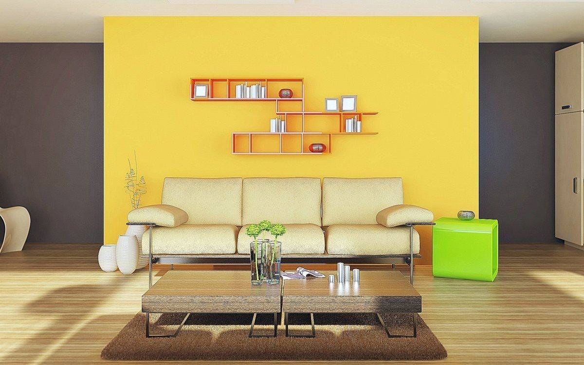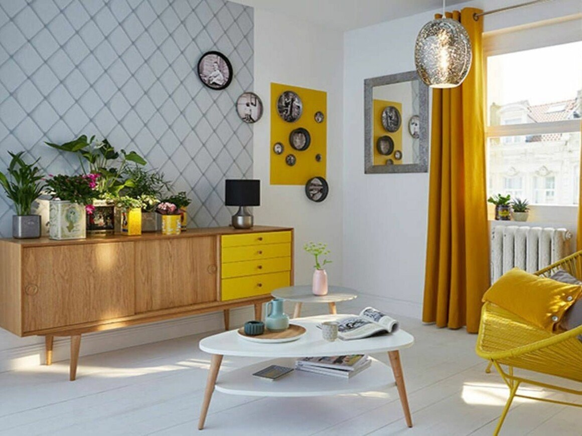 Желтая стена в интерьере гостиной с чем сочетается (95 фото)