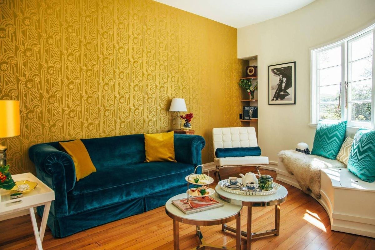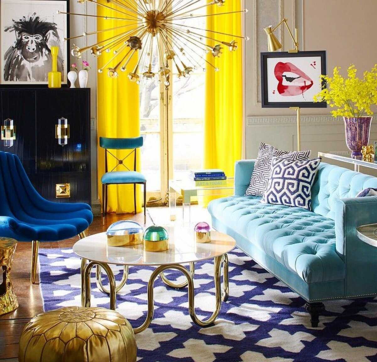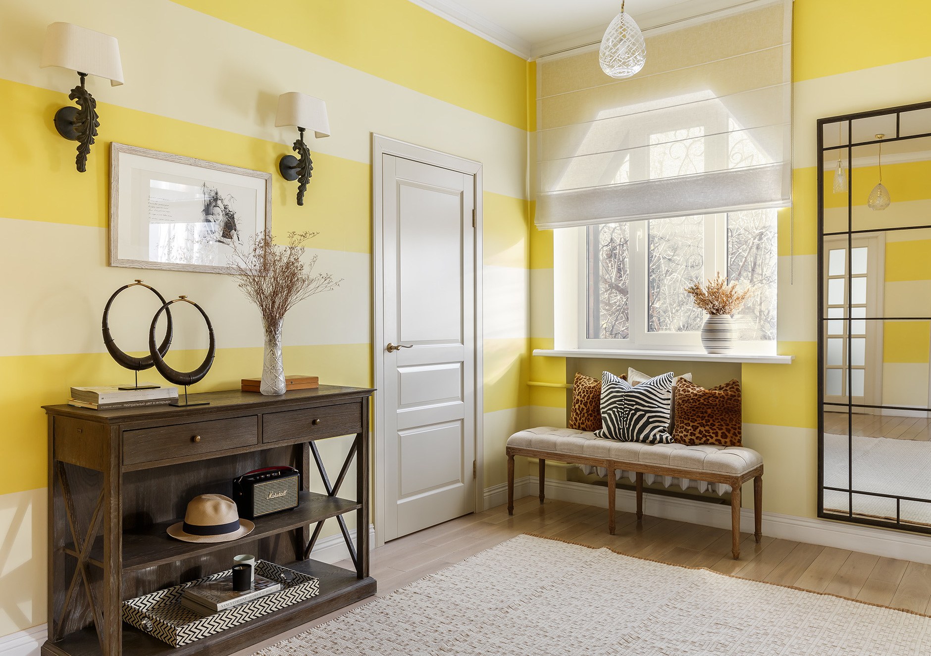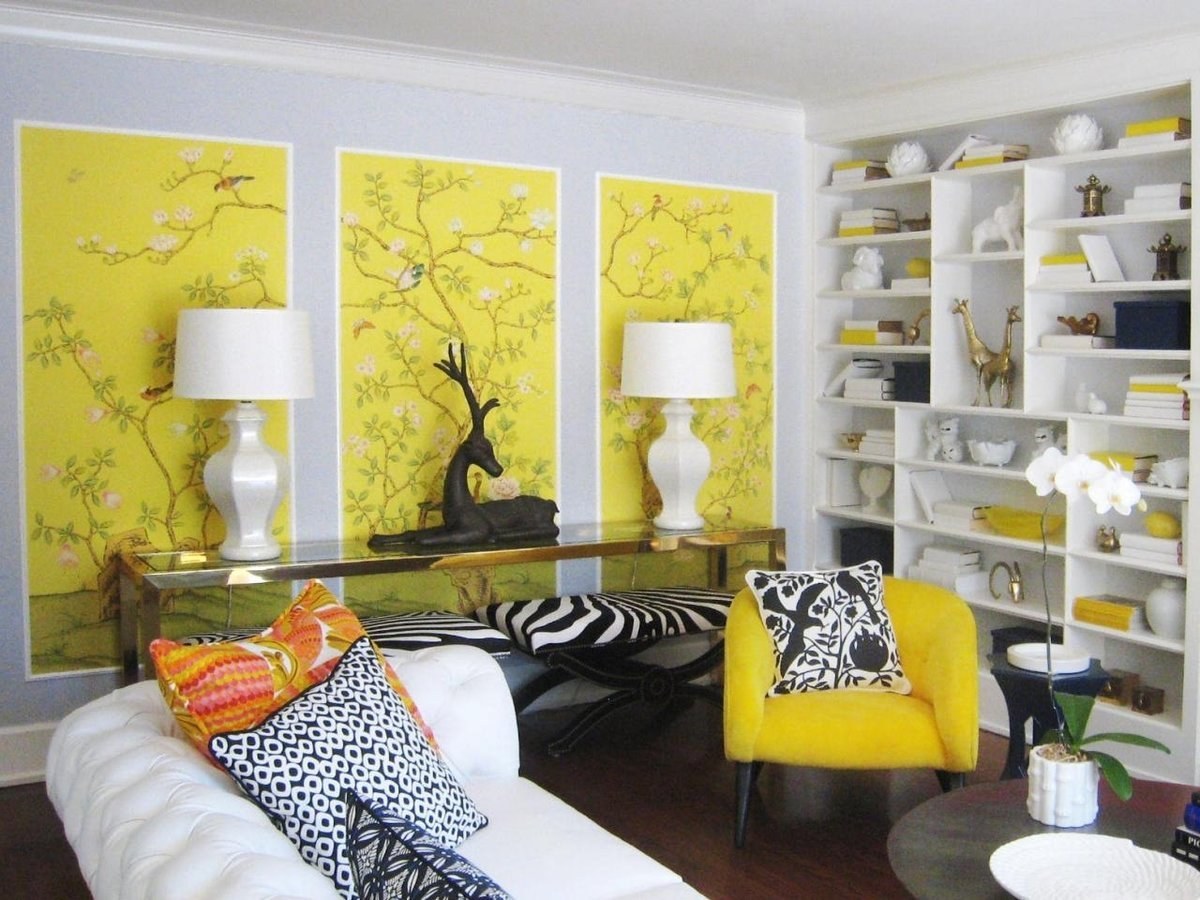 Желтая стена в интерьере гостиной с чем сочетается (95 фото)