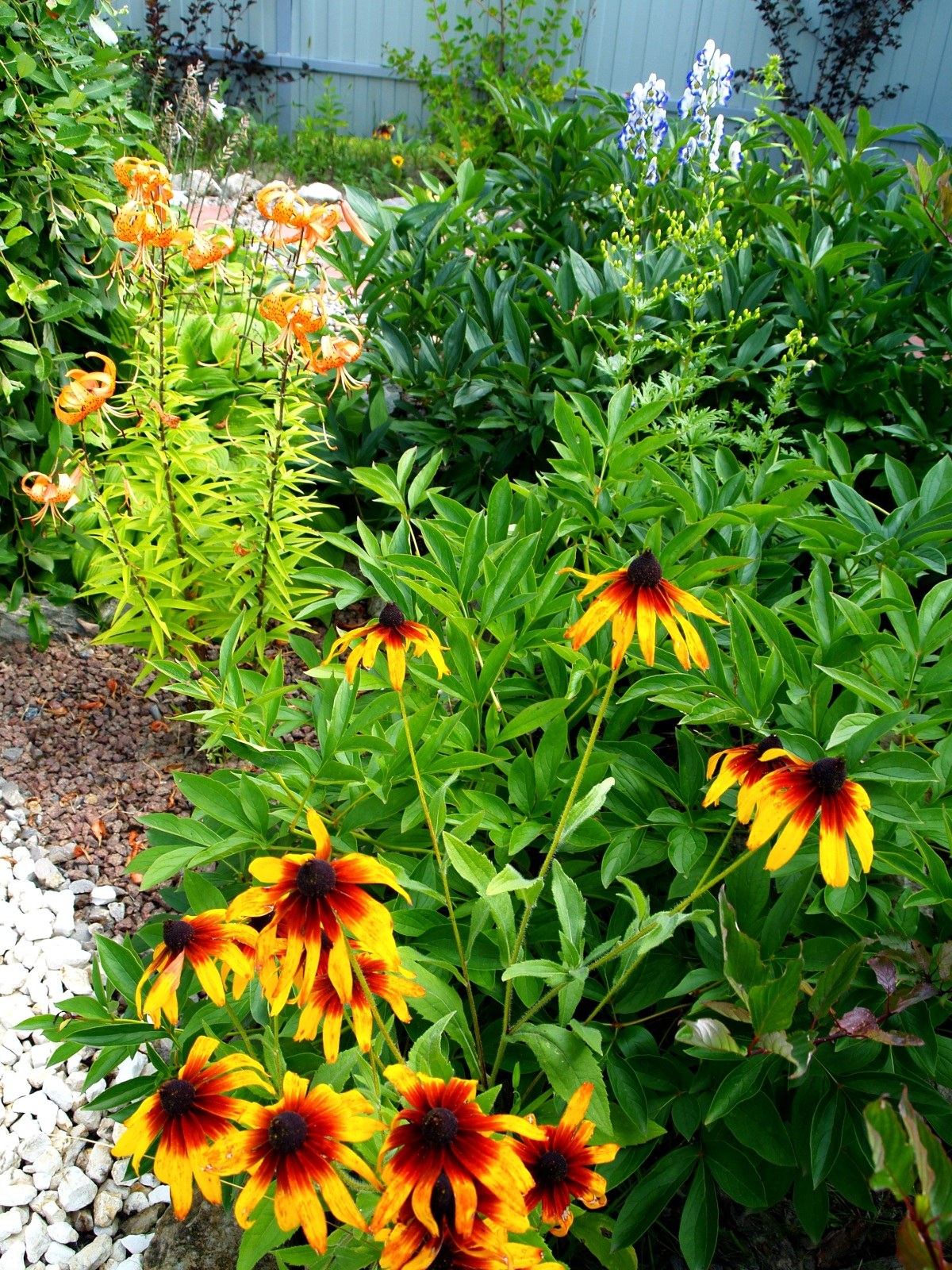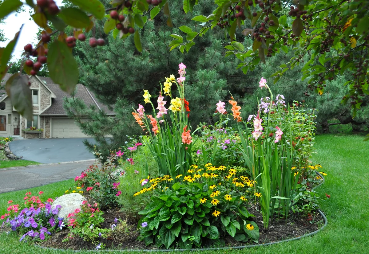 Рудбекия и ирисы в клумбе
