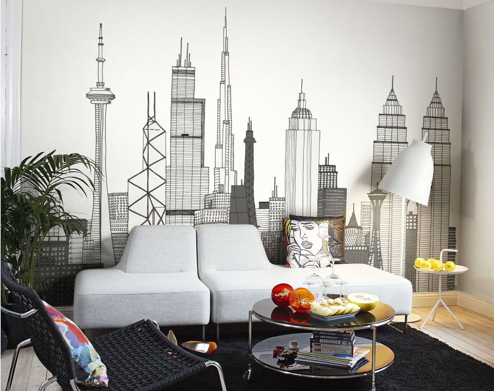 Фрески на стену в интерьере гостиной