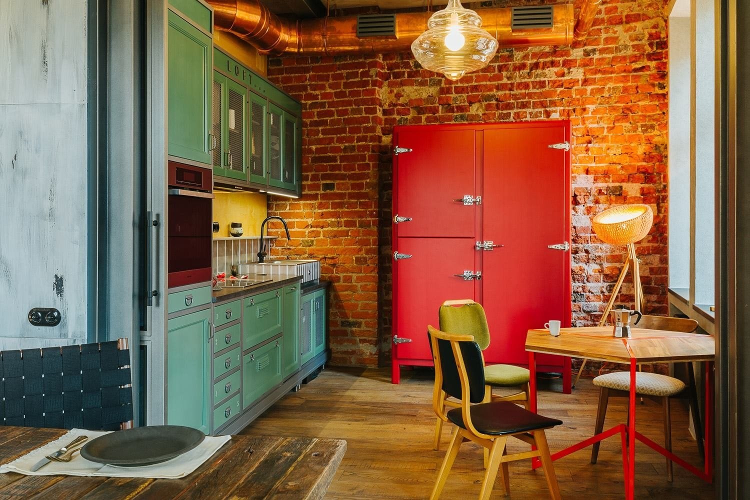 Кухня в стиле лофт с красным кирпичом