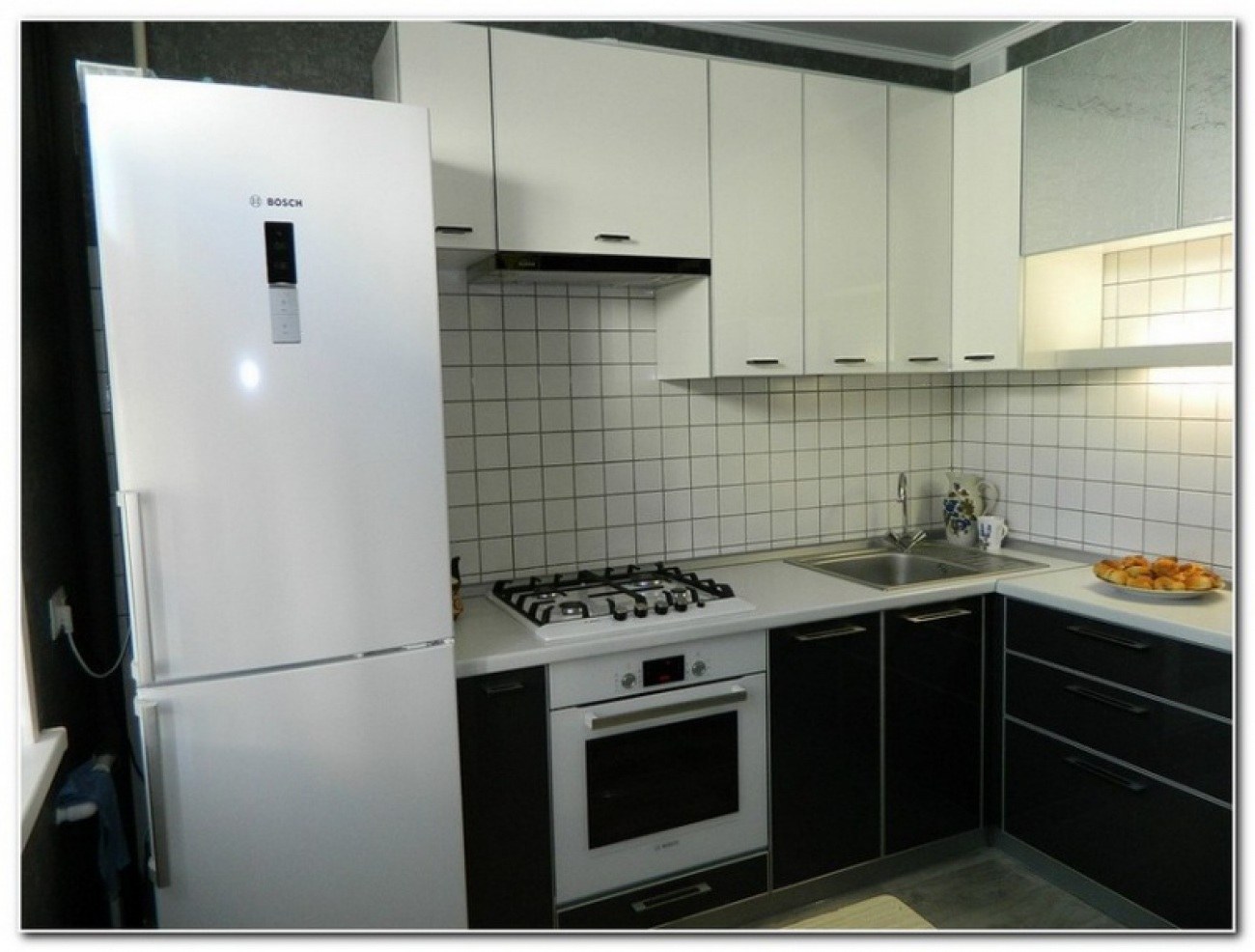 Маленькая угловая кухня с холодильником