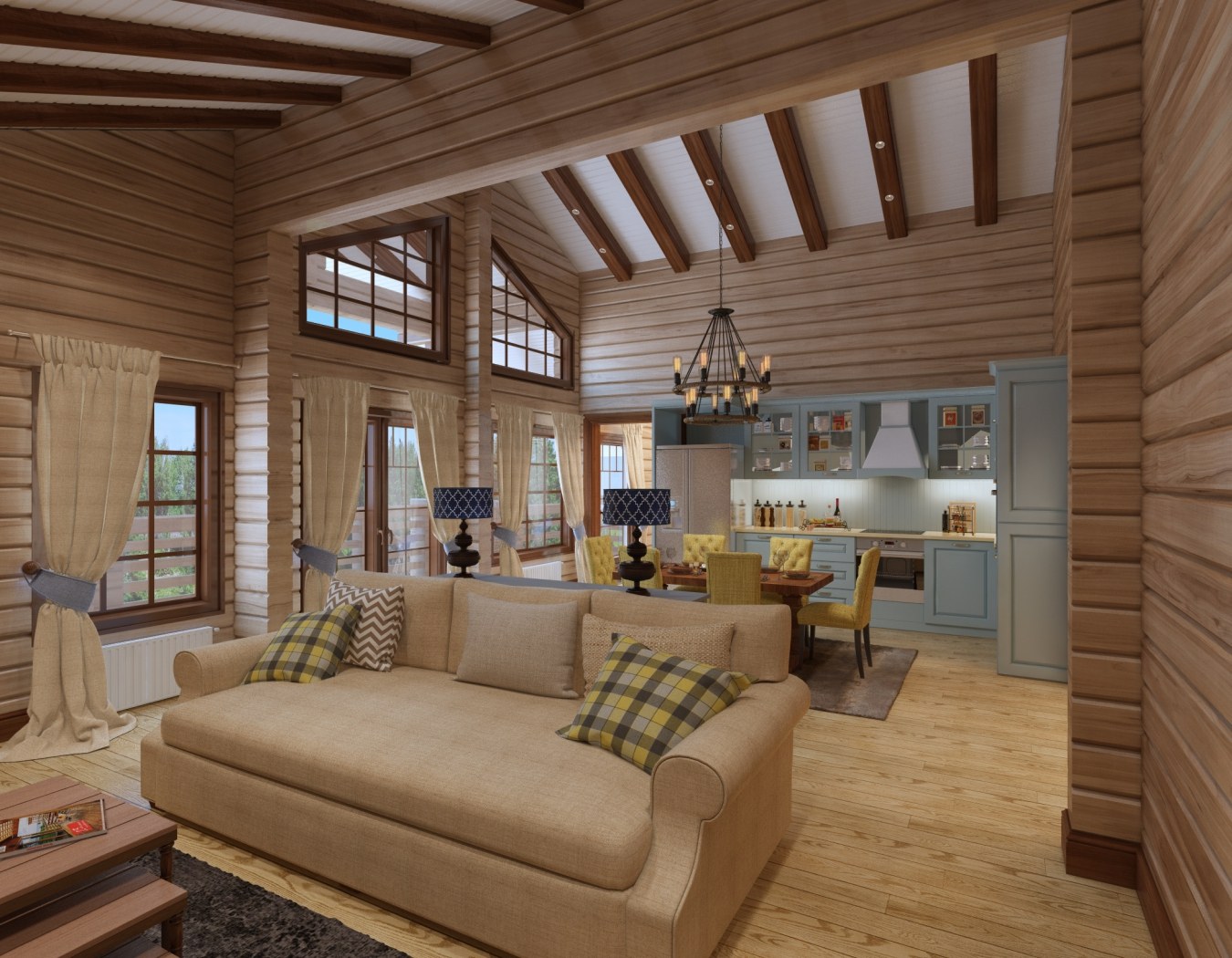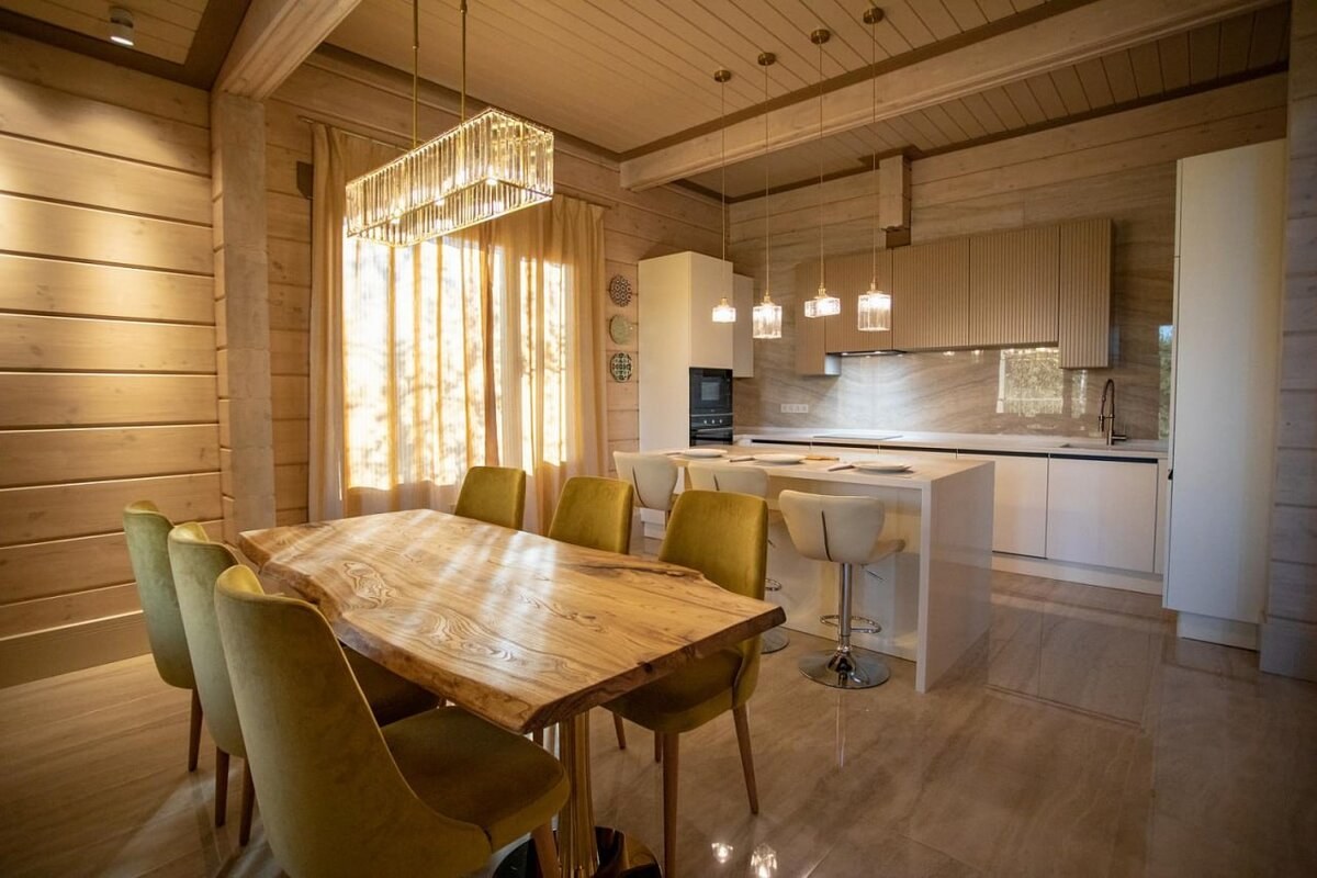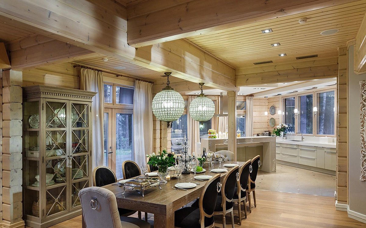 Интерьер кухни гостиной в доме из клееного бруса