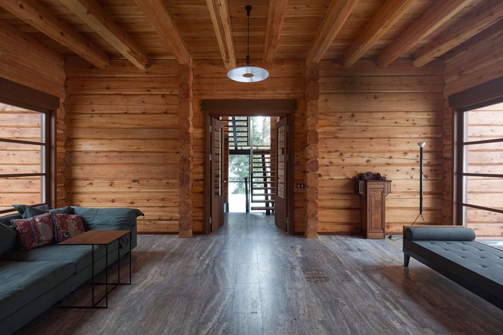 Современный интерьер в доме из бревна