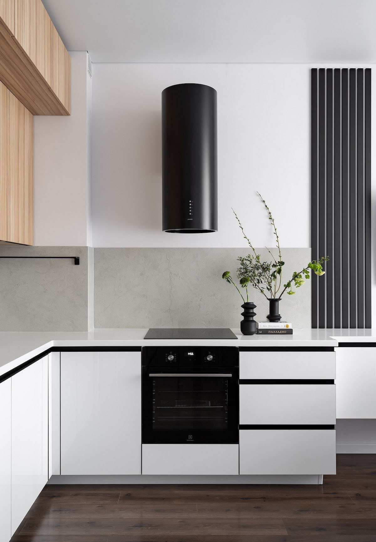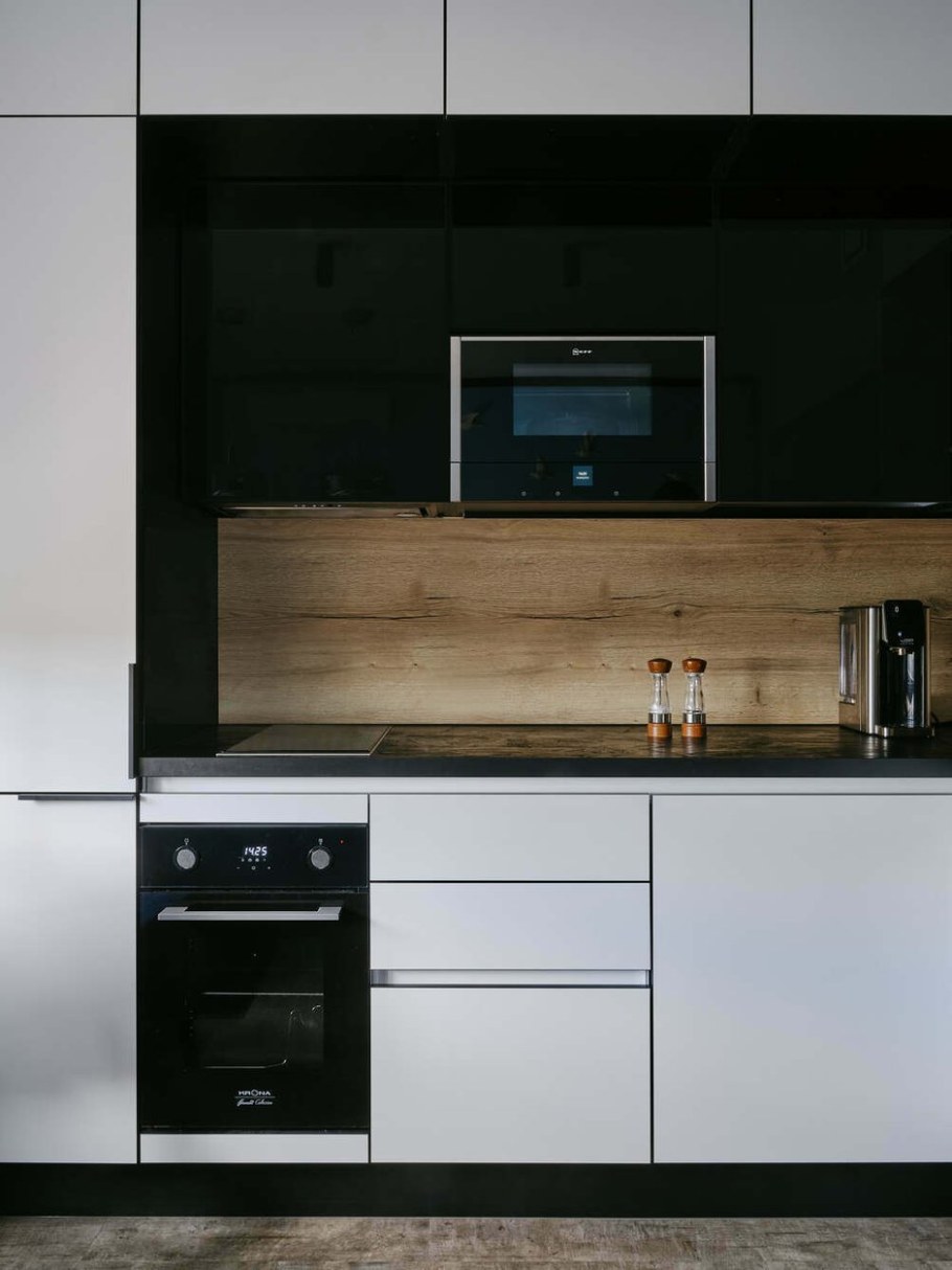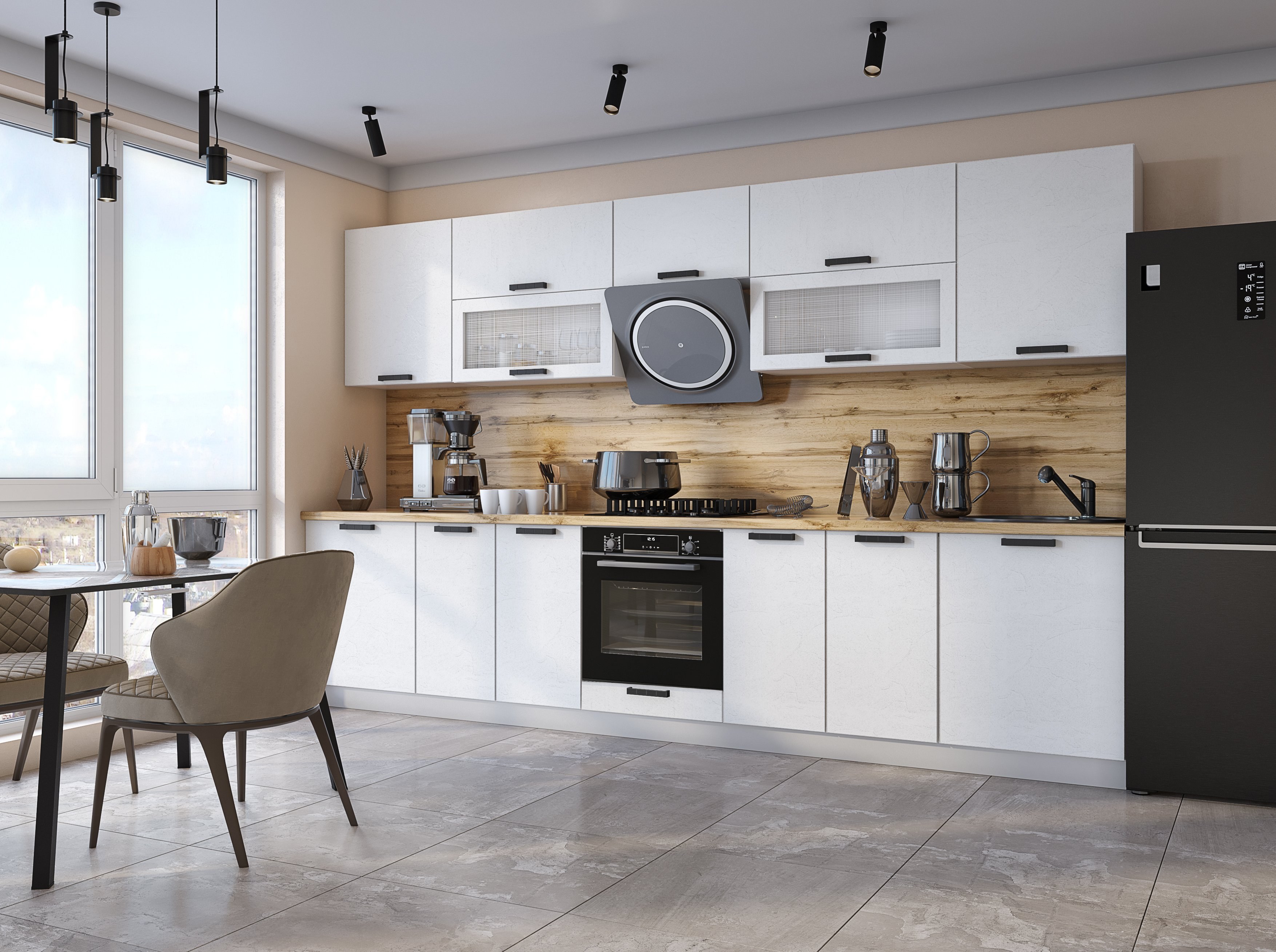 Белая кухня с черным холодильником