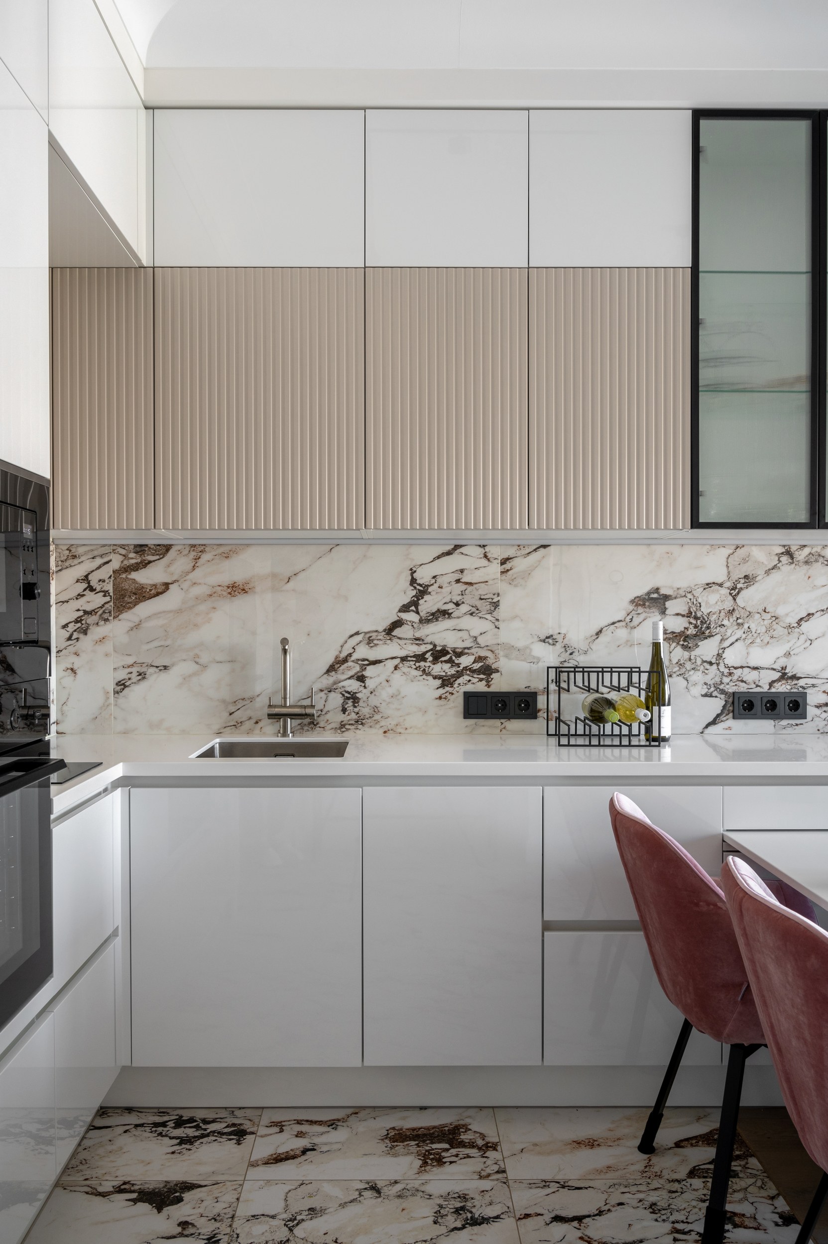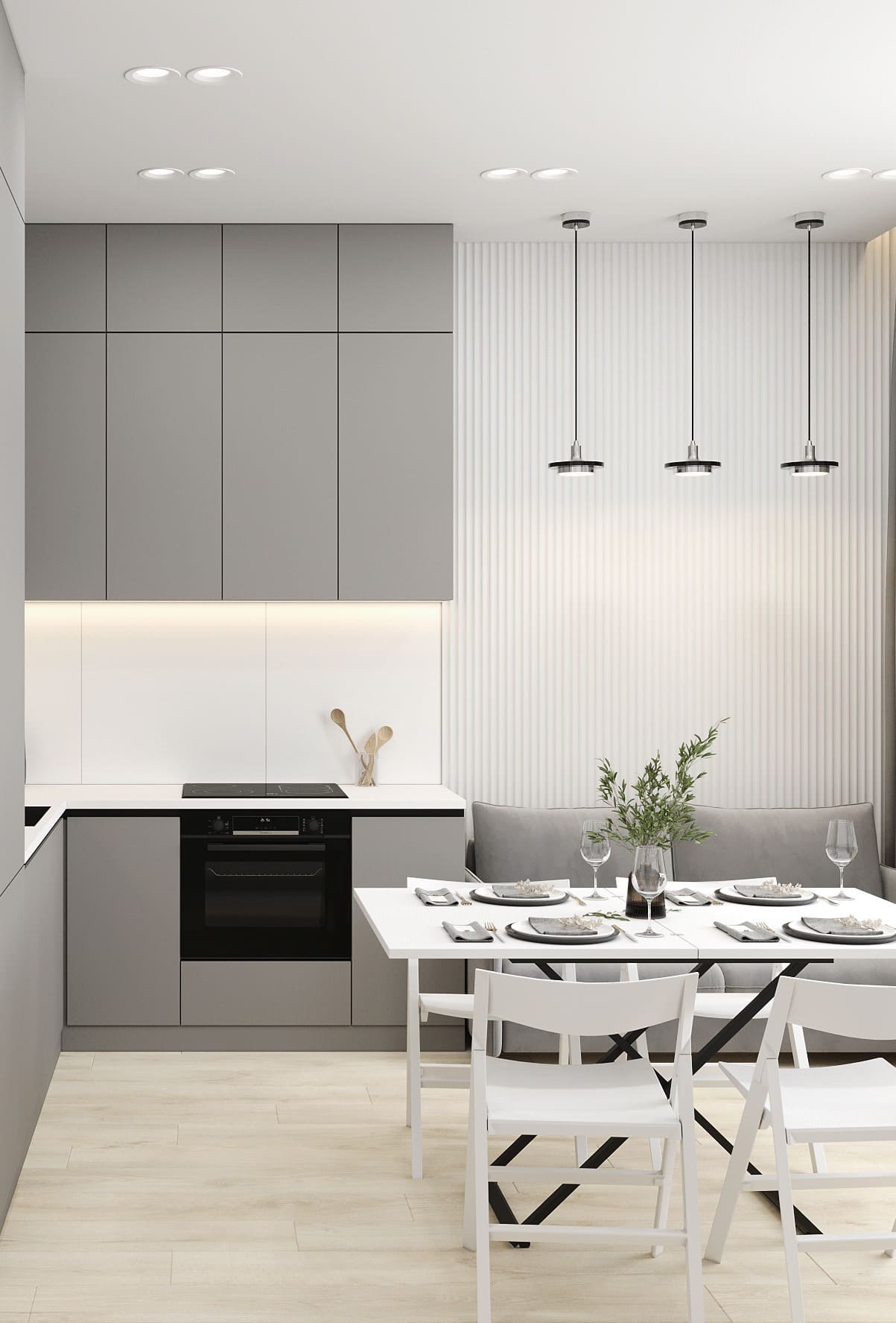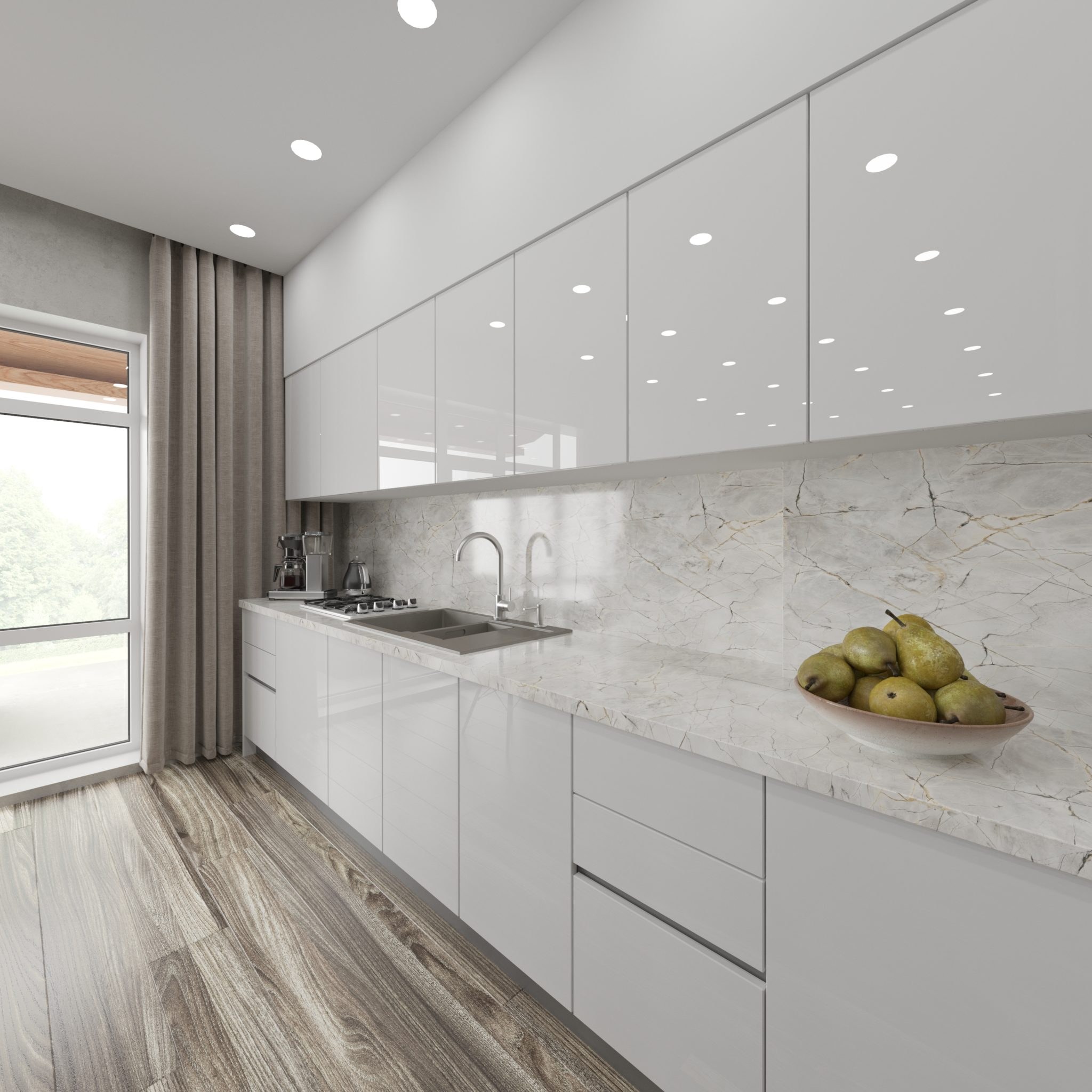 Кухня белая под потолок с серой столешницей