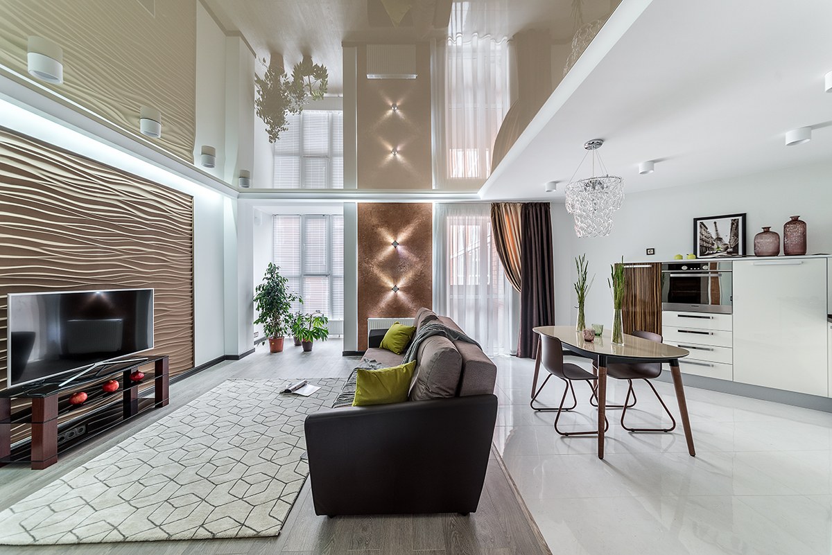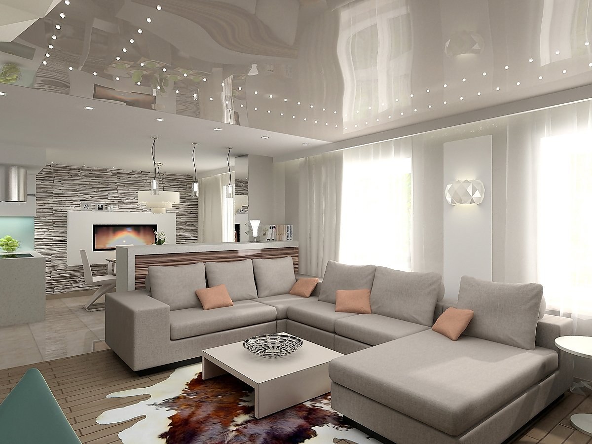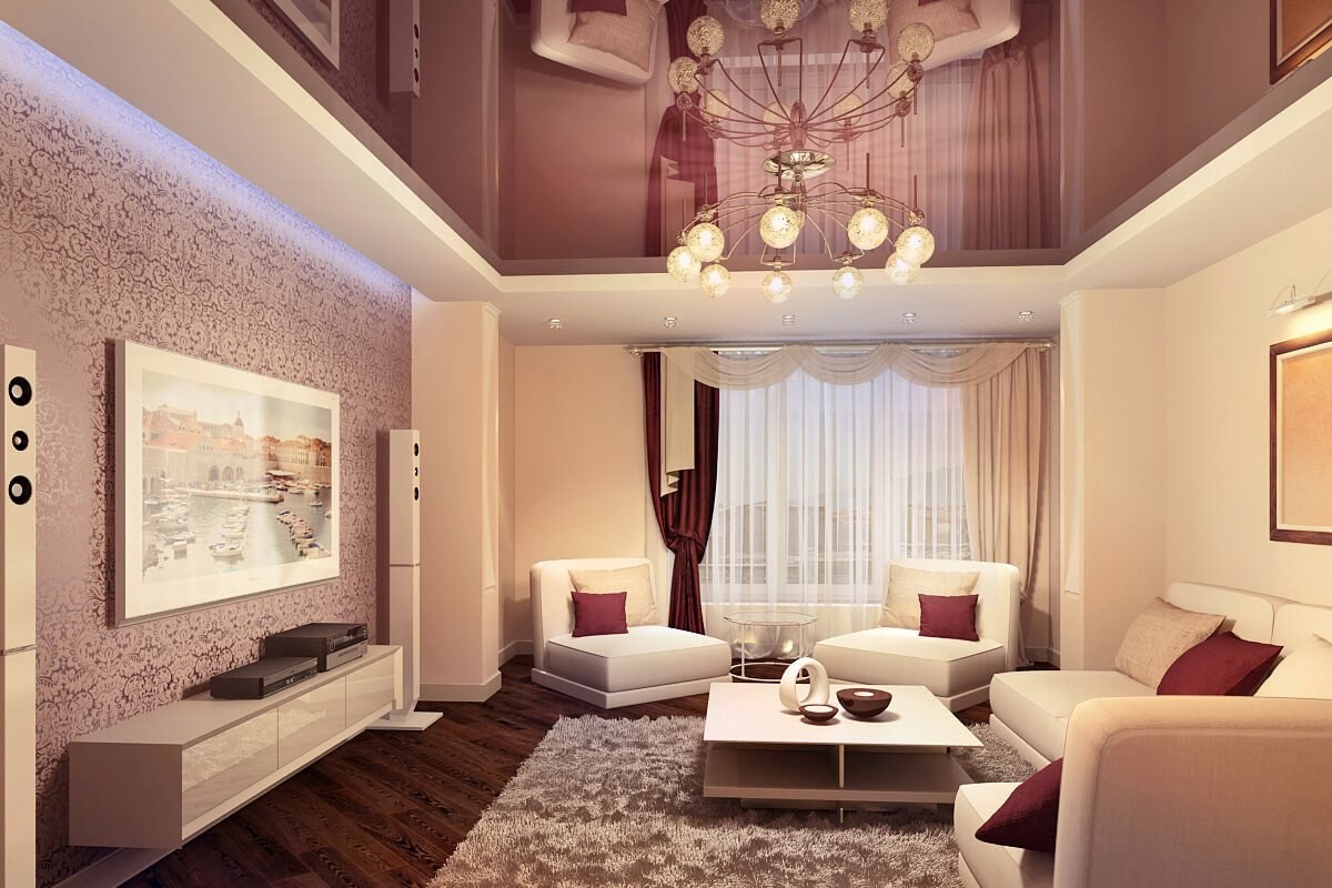 Глянцевый потолок в гостиной