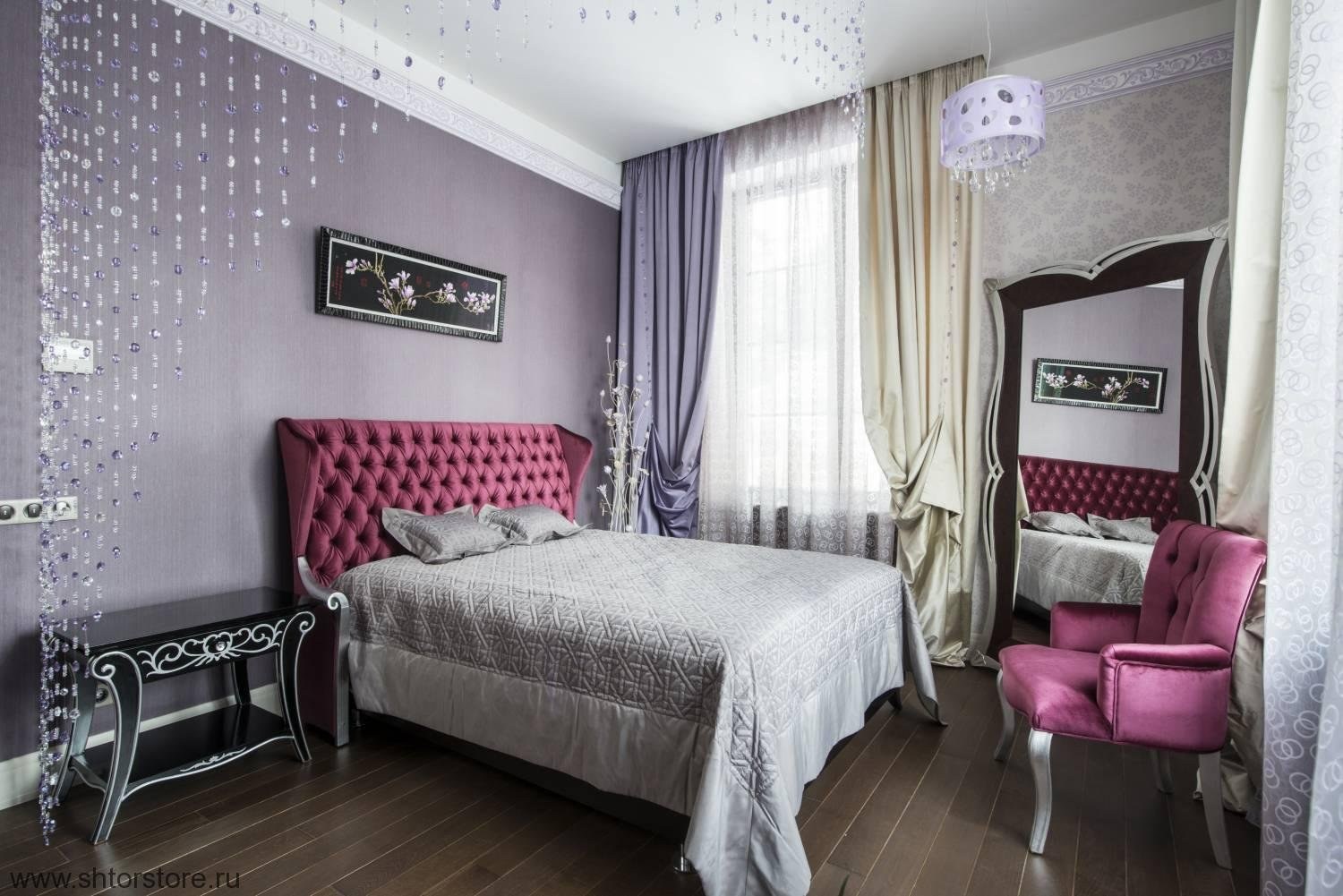 Фиолетовые шторы в интерьере спальни
