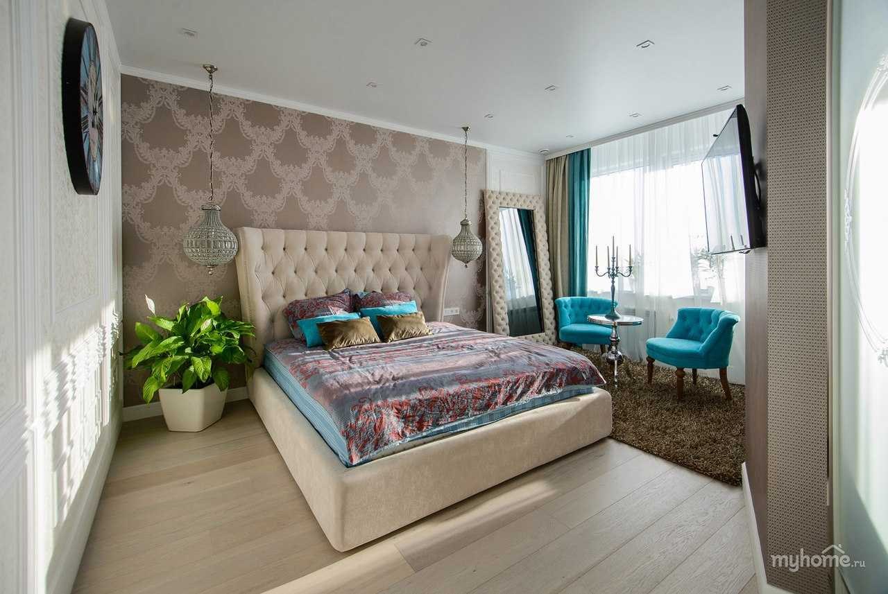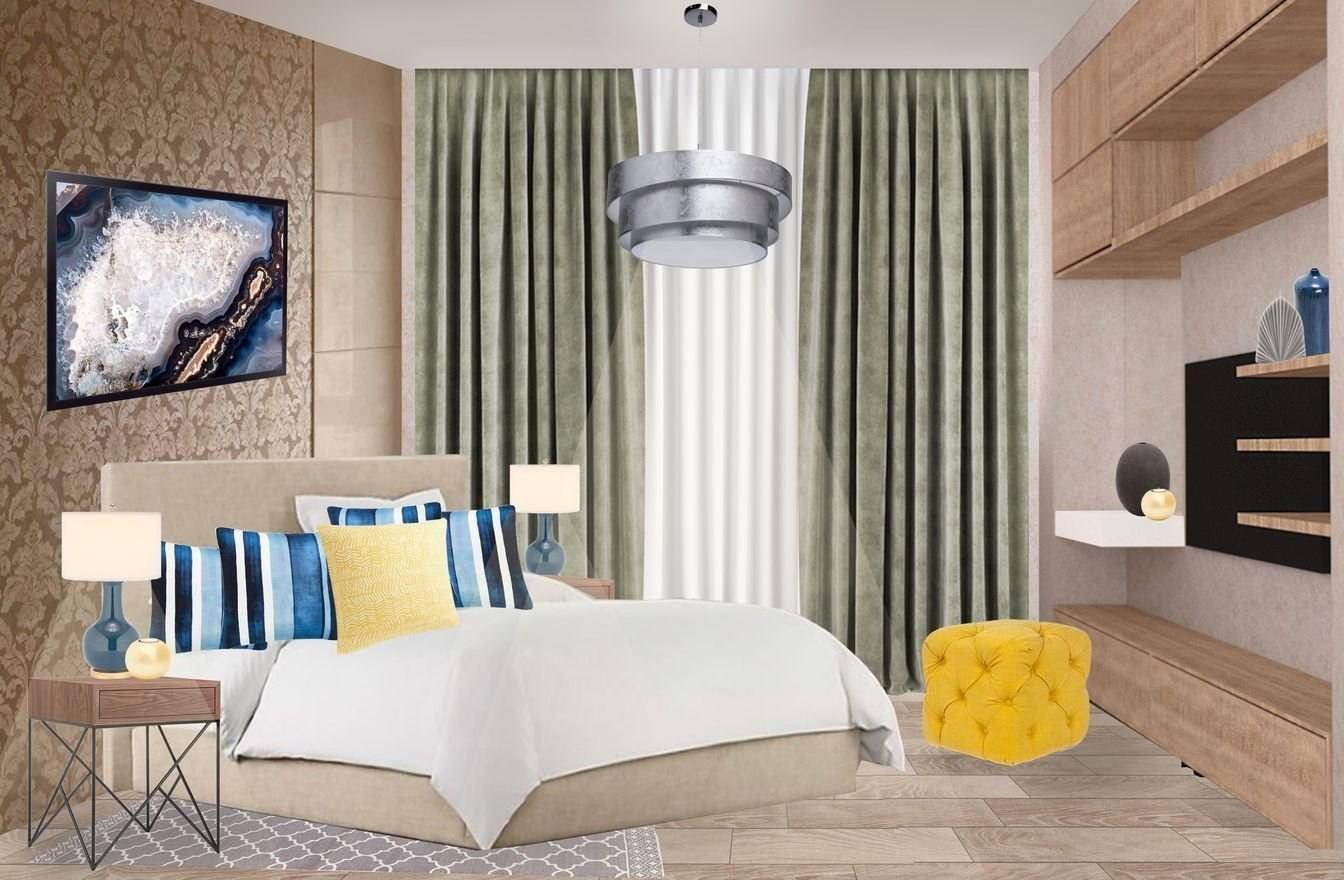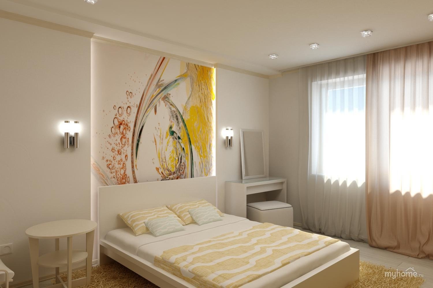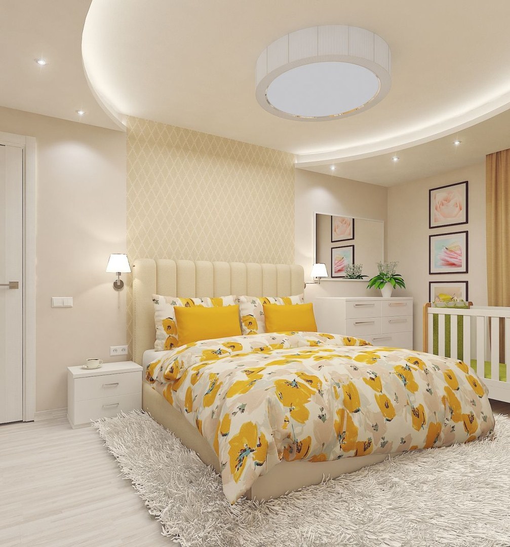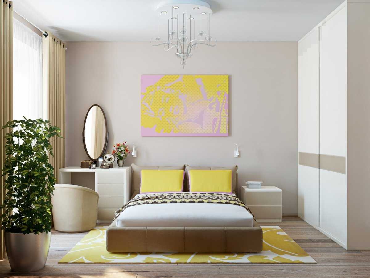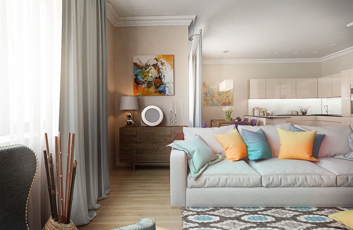Интерьер гостиной в бежевых тонах с яркими акцентами