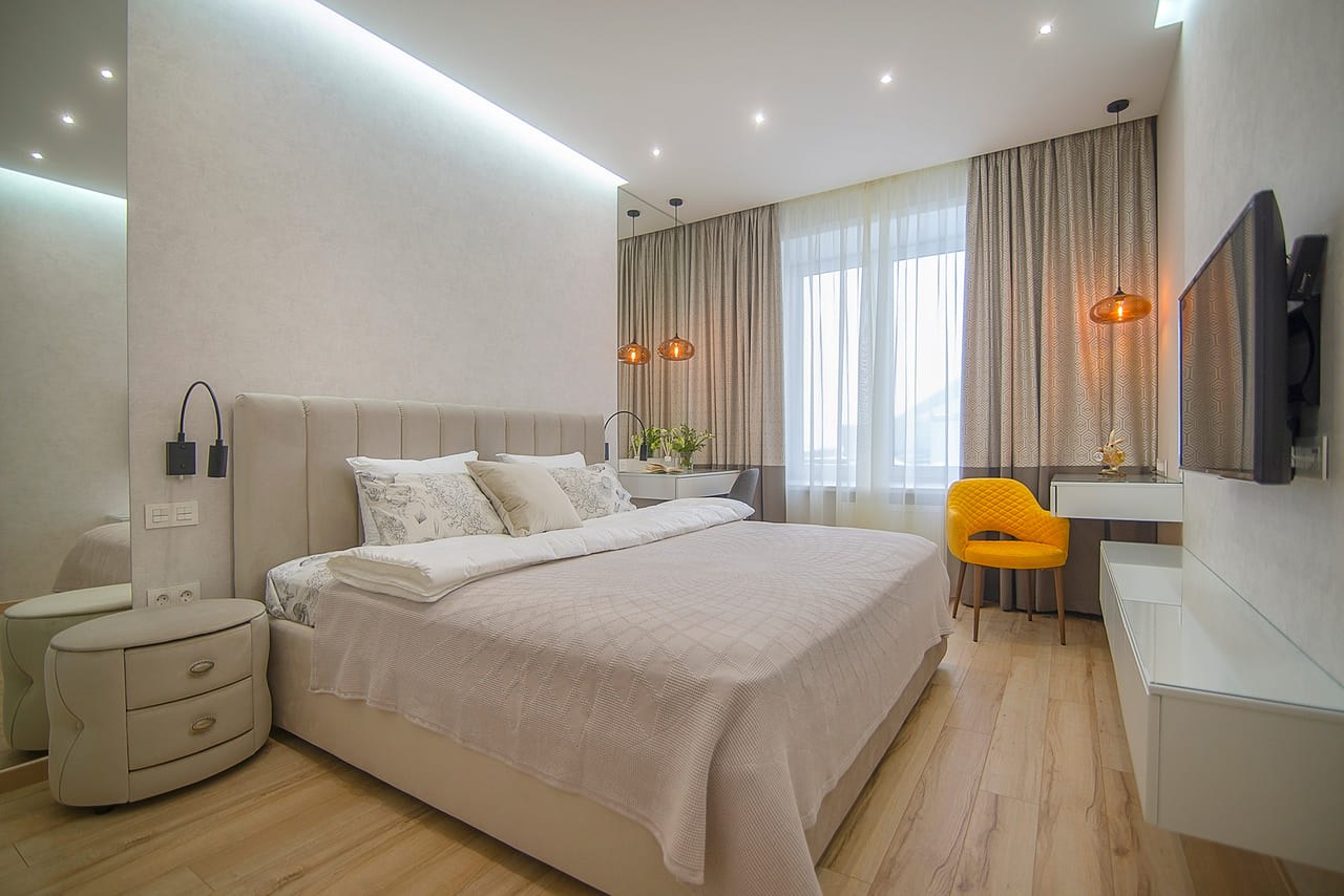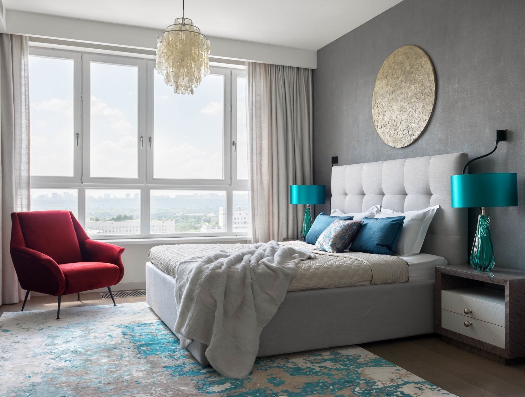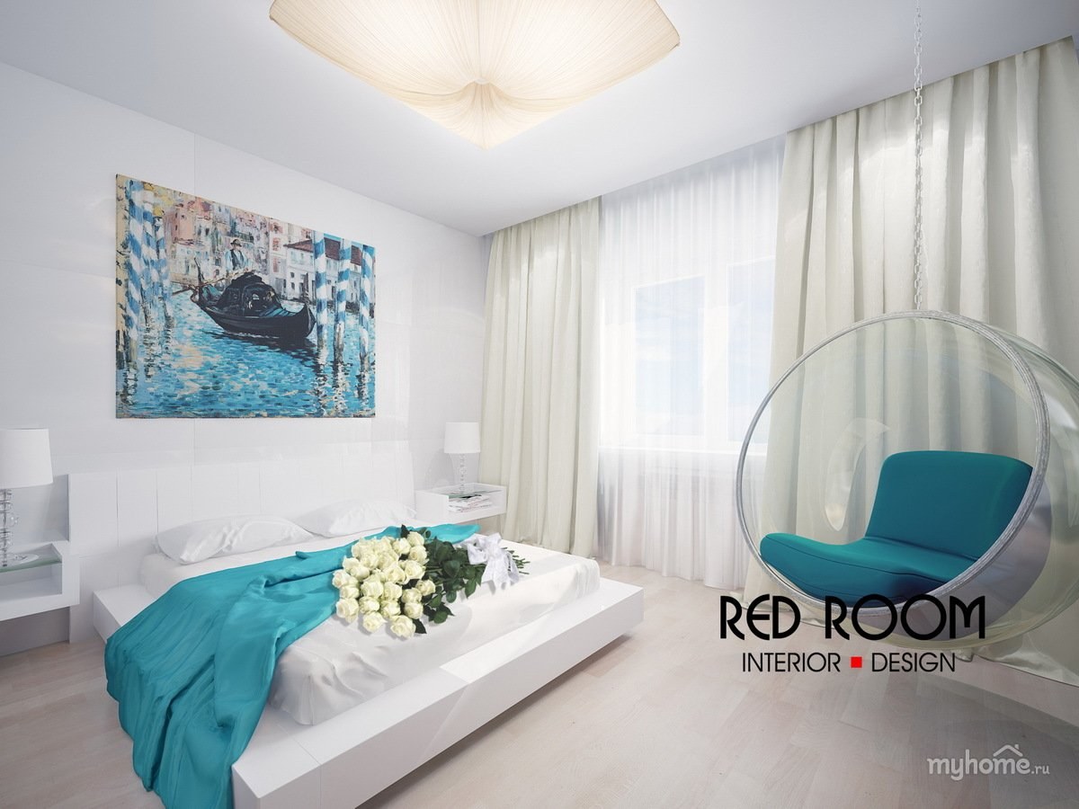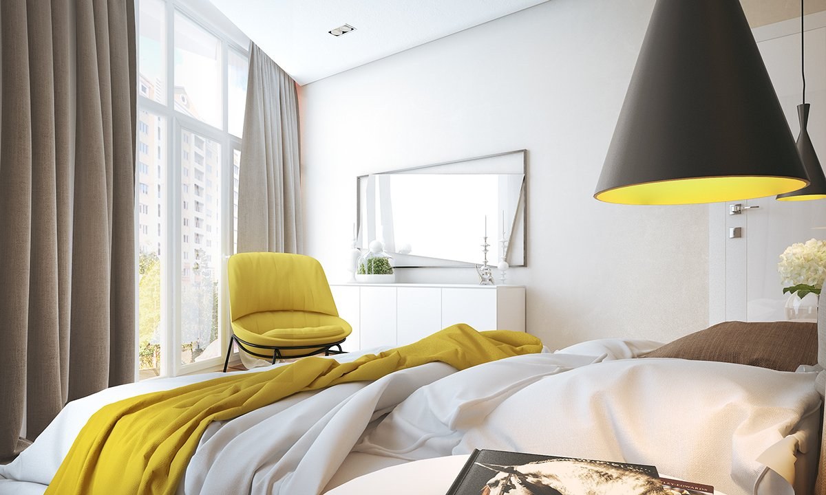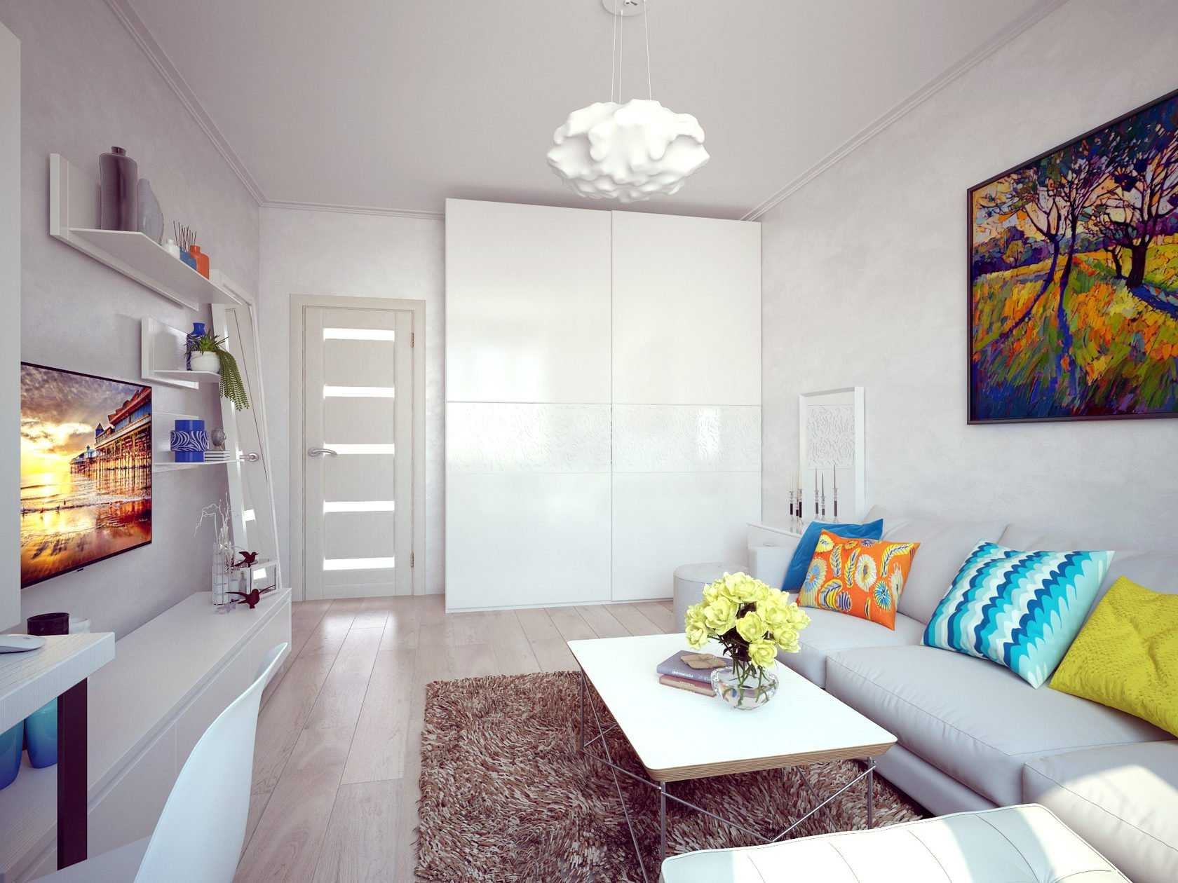 Интерьер гостиной в светлых тонах с яркими акцентами