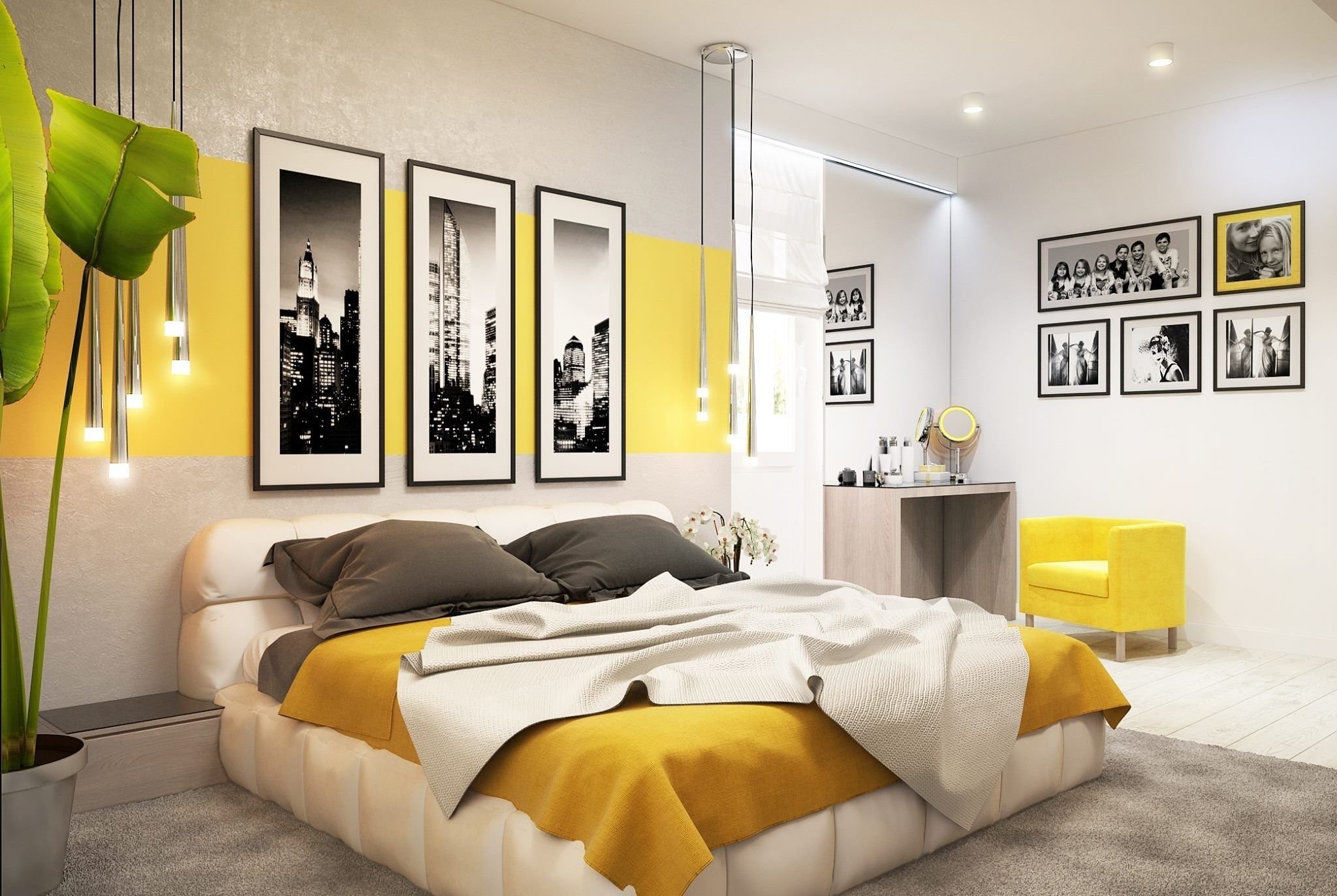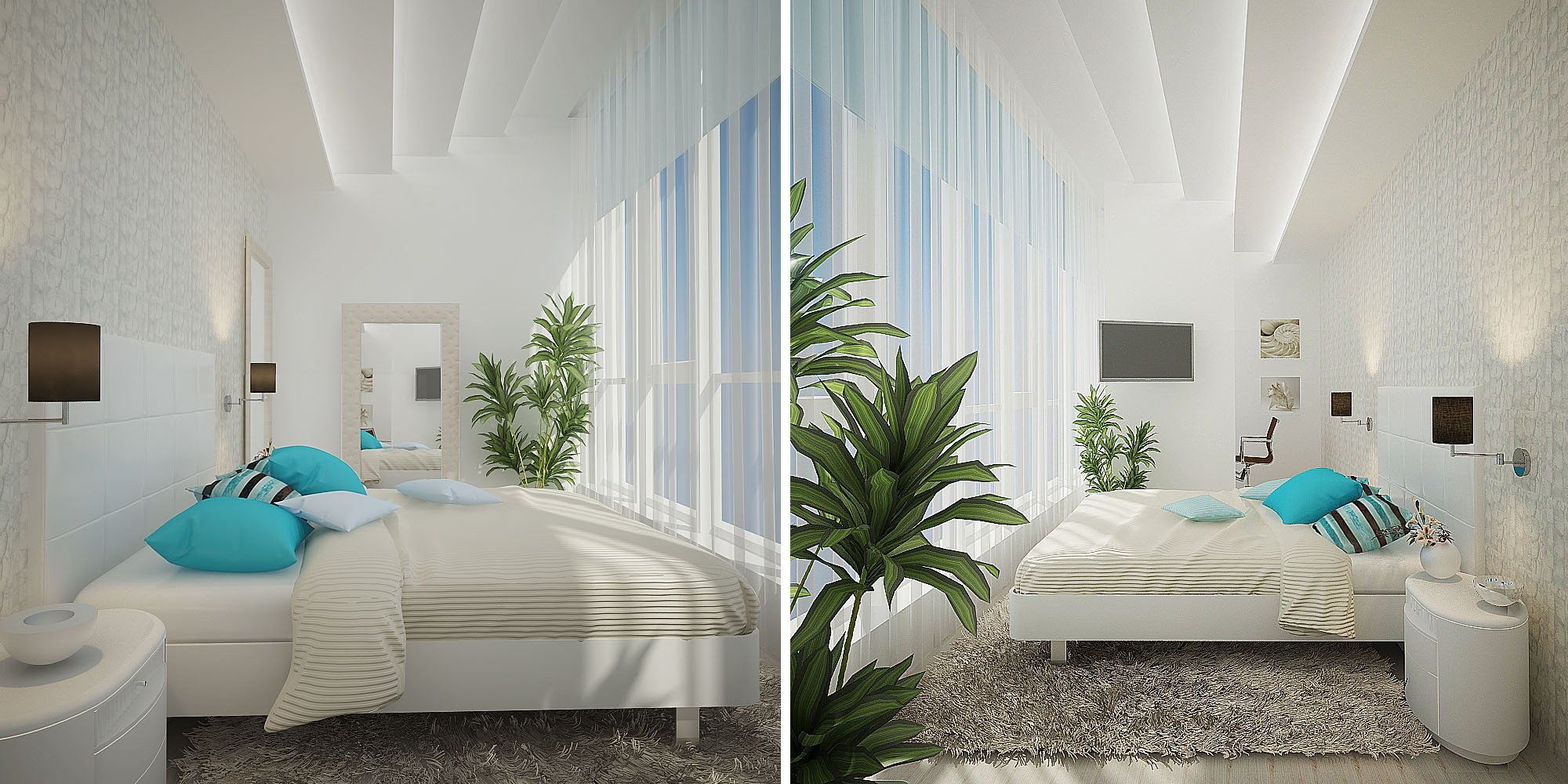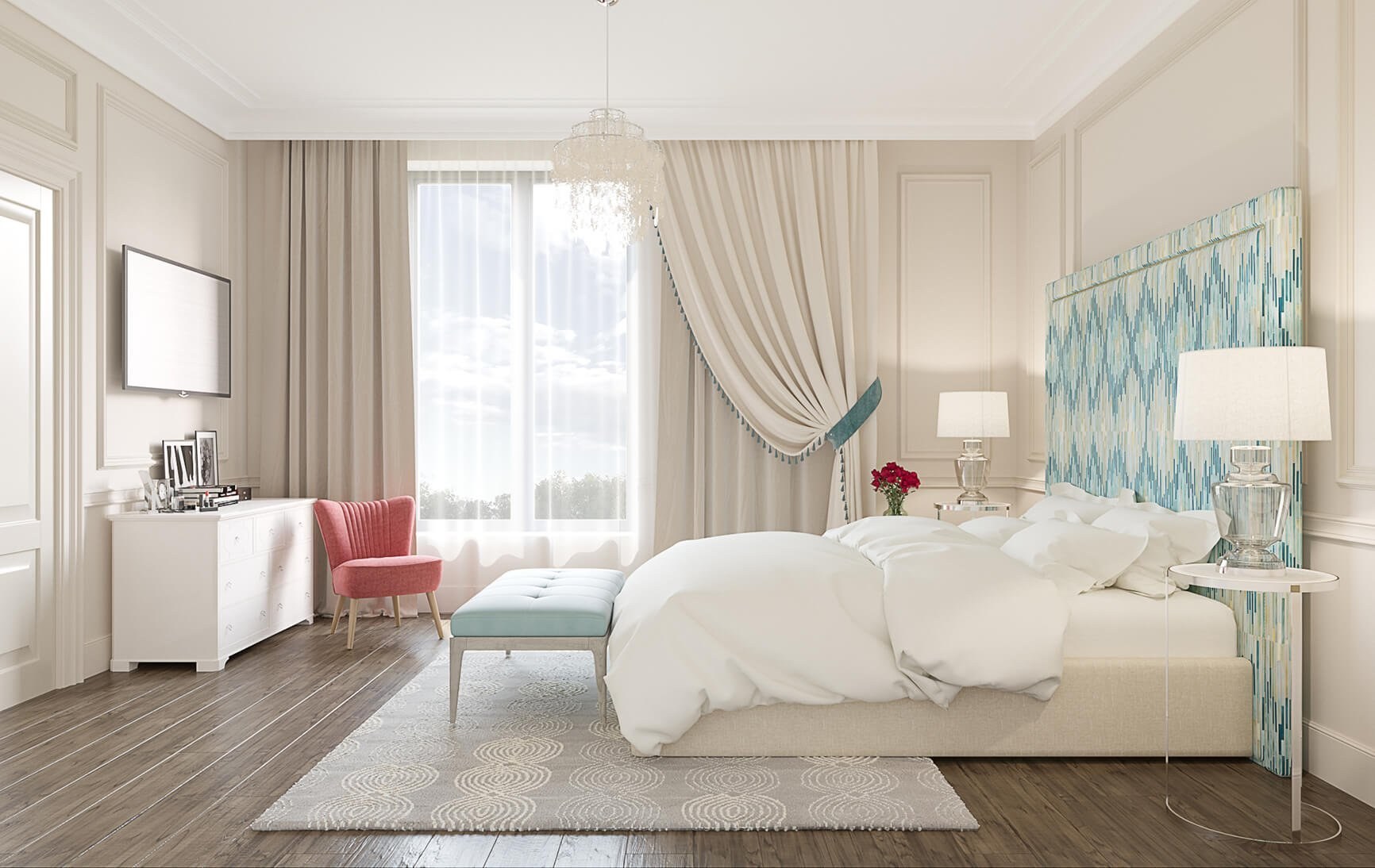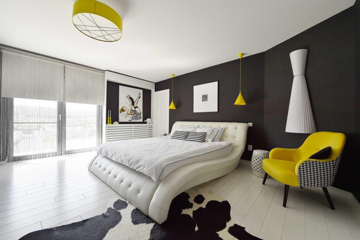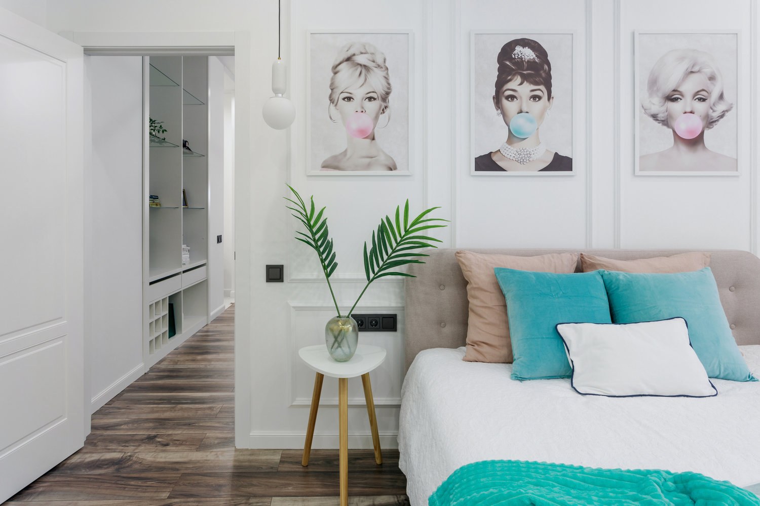 Интерьер гостиной в светлых тонах с яркими акцентами
