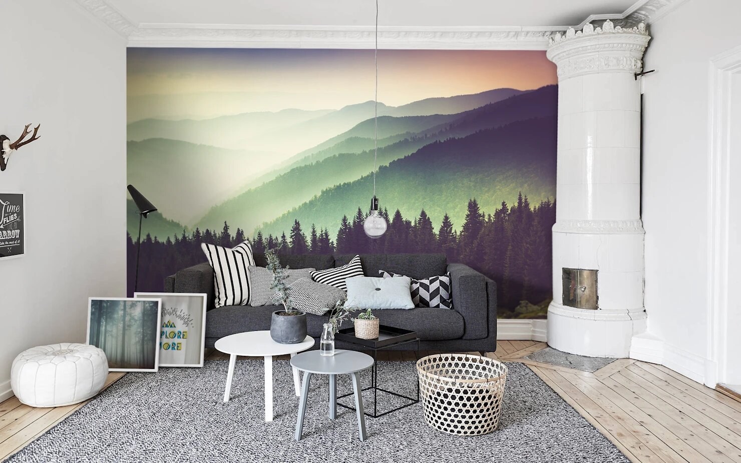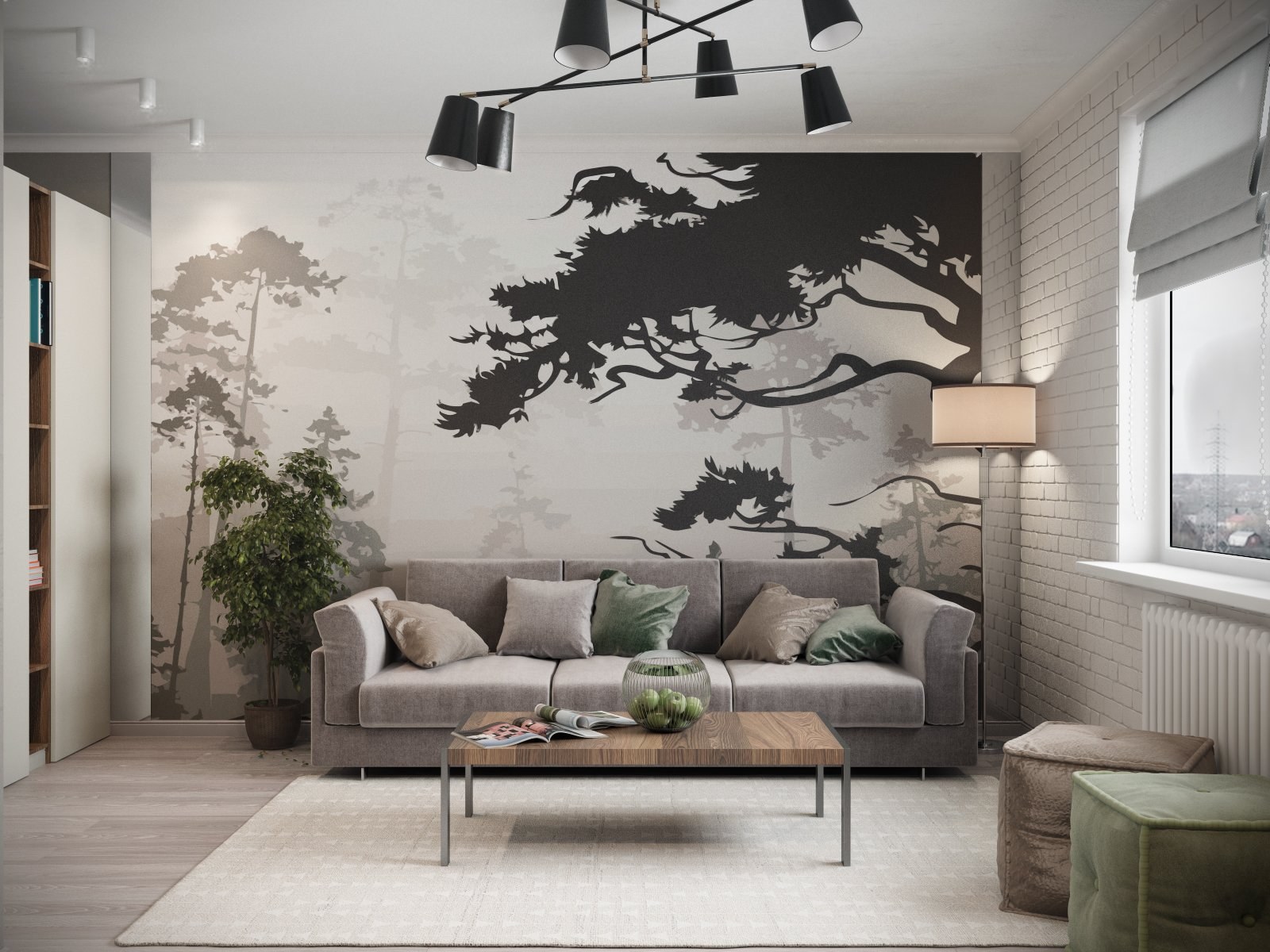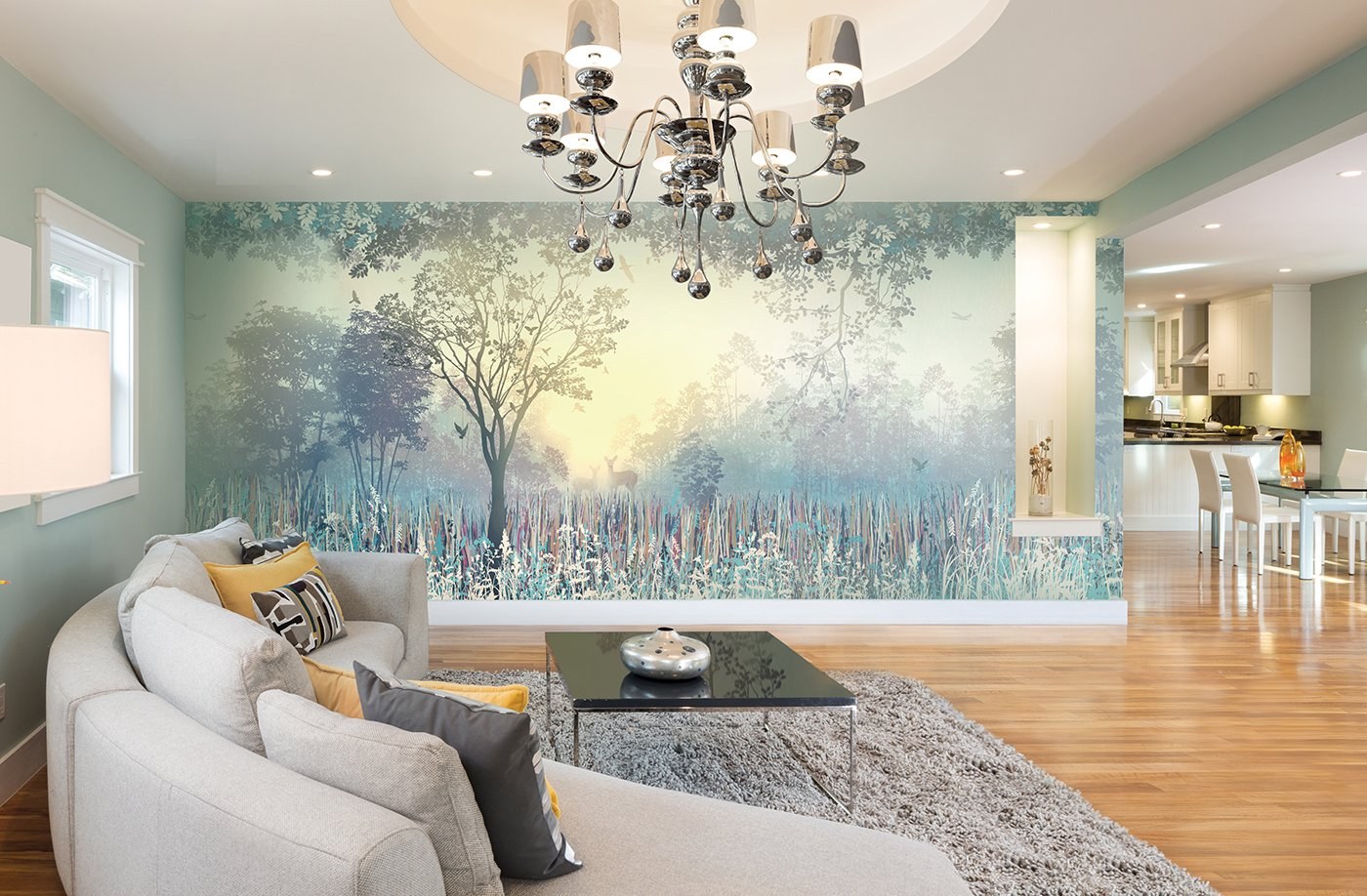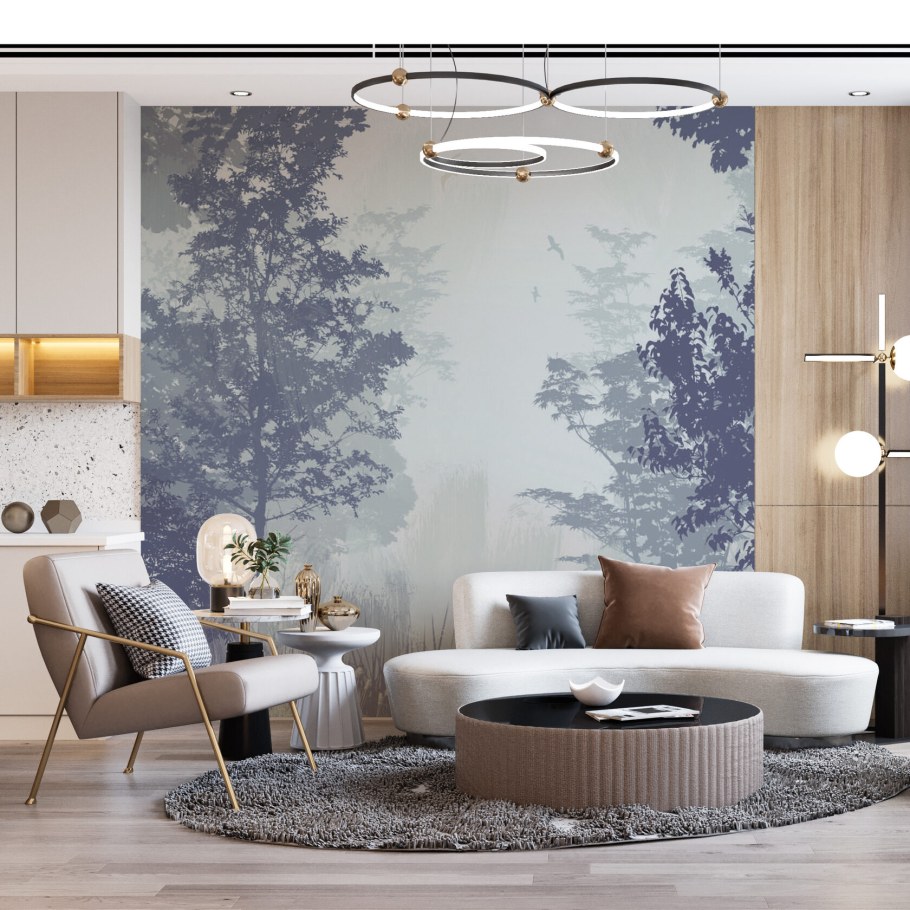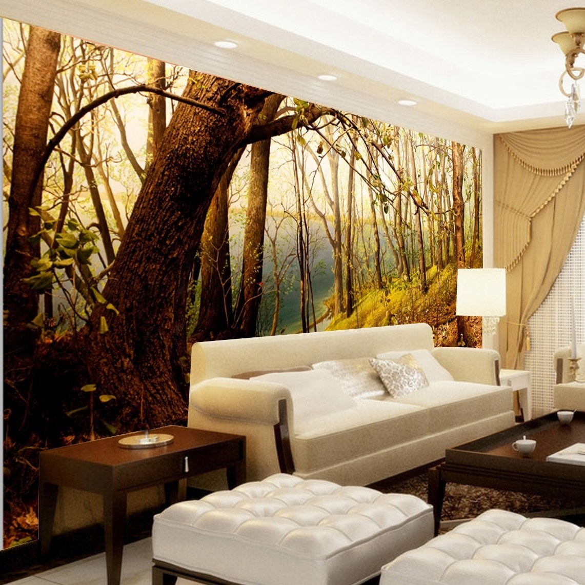 Фотообои лес в интерьере гостиной