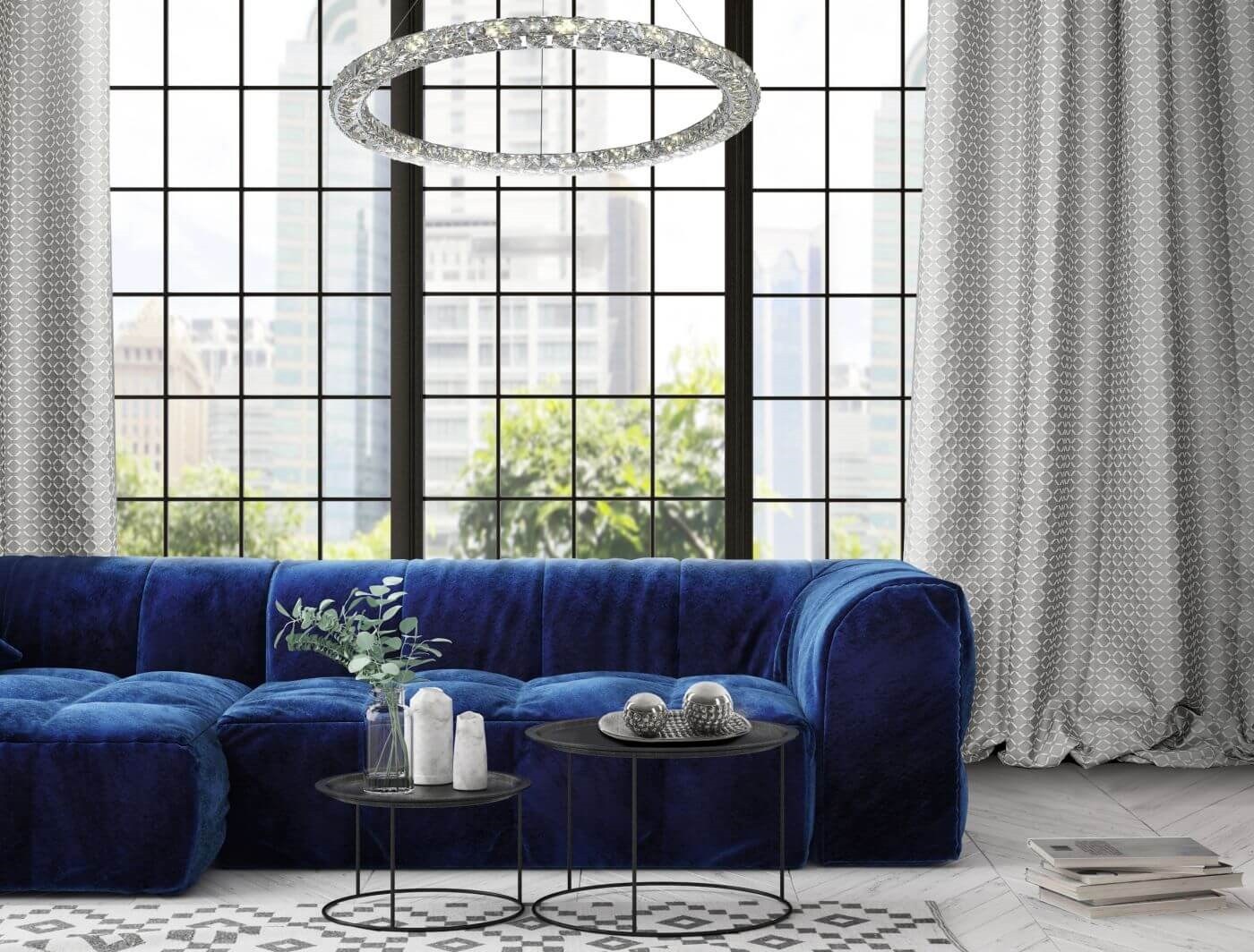 Синий диван в интерьере гостиной