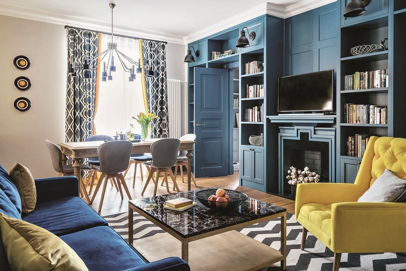 Синие шторы в интерьере гостиной