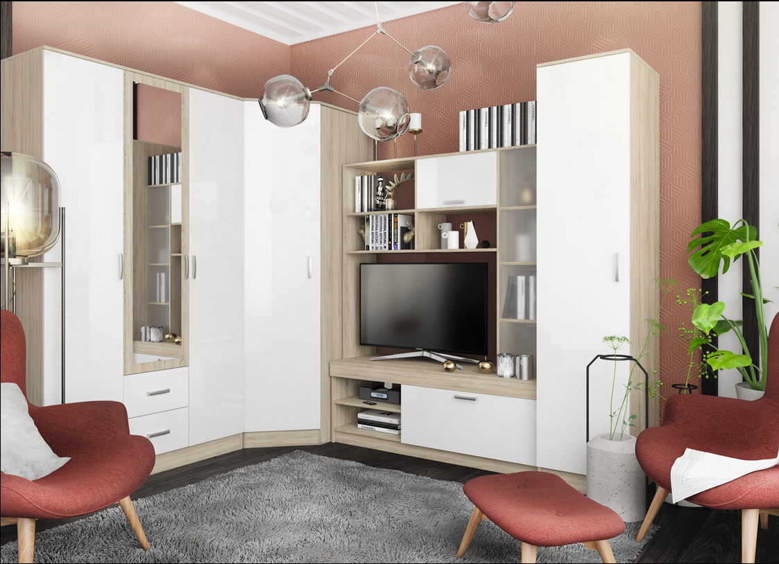 Угловой шкаф в интерьере гостиной