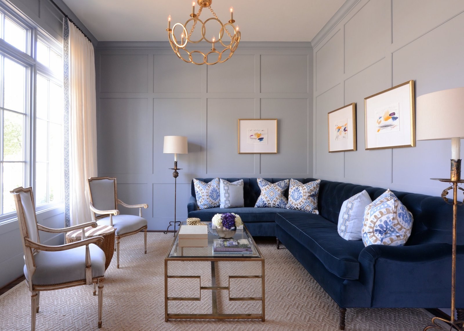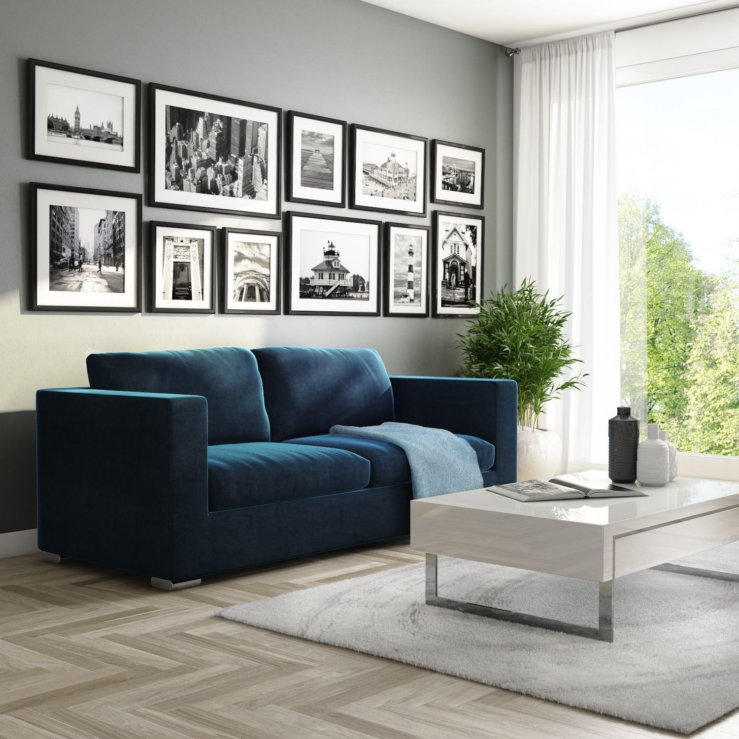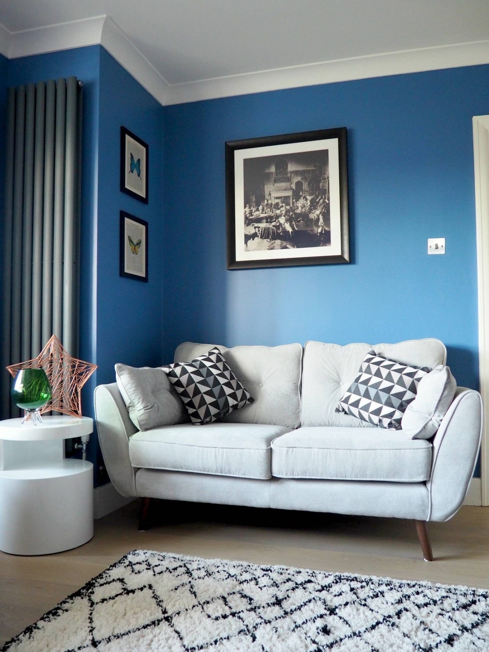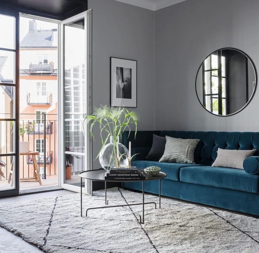 Серые стены и синий диван в интерьере (58 фото)
