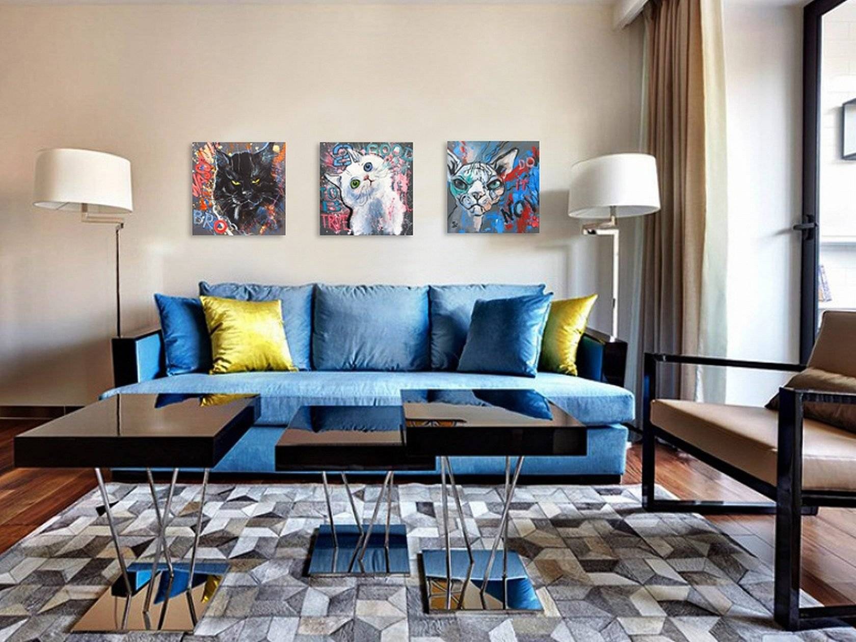 Синий диван в интерьере гостиной