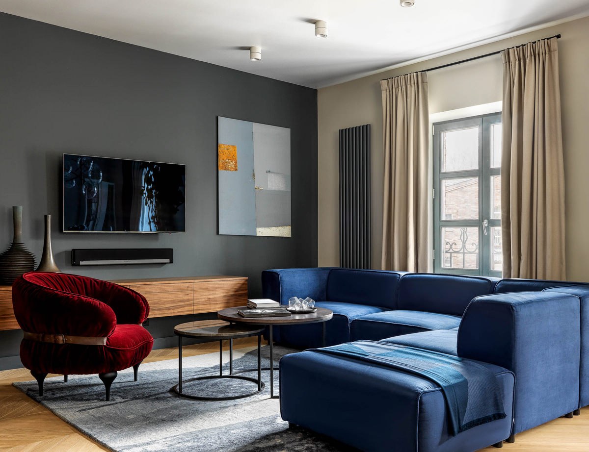 Синяя мебель в интерьере гостиной