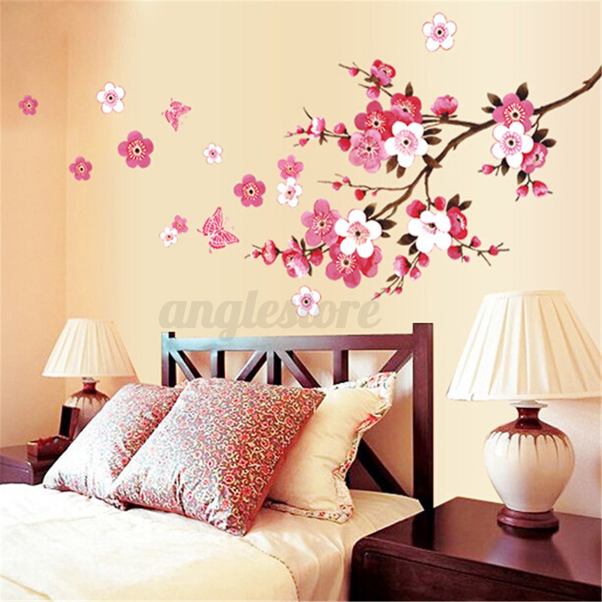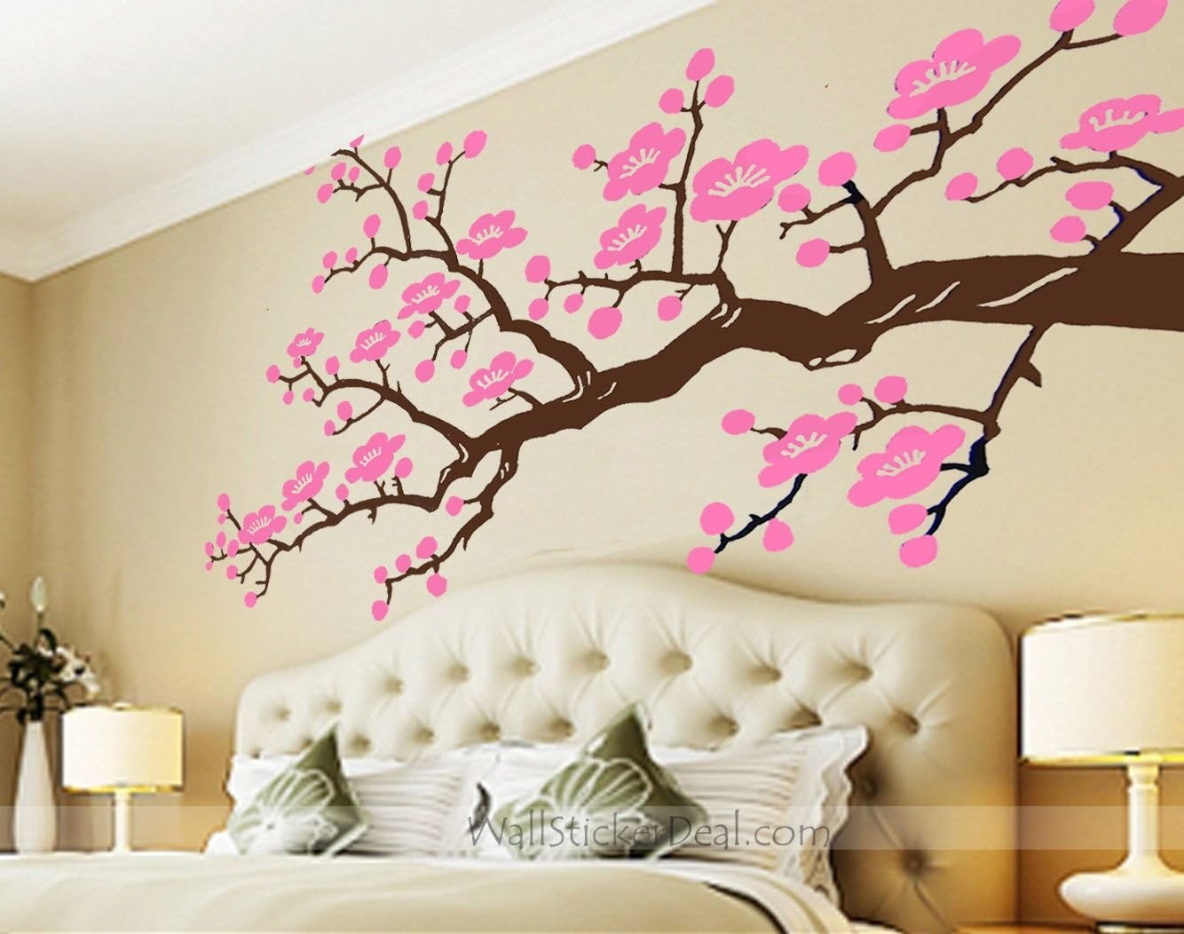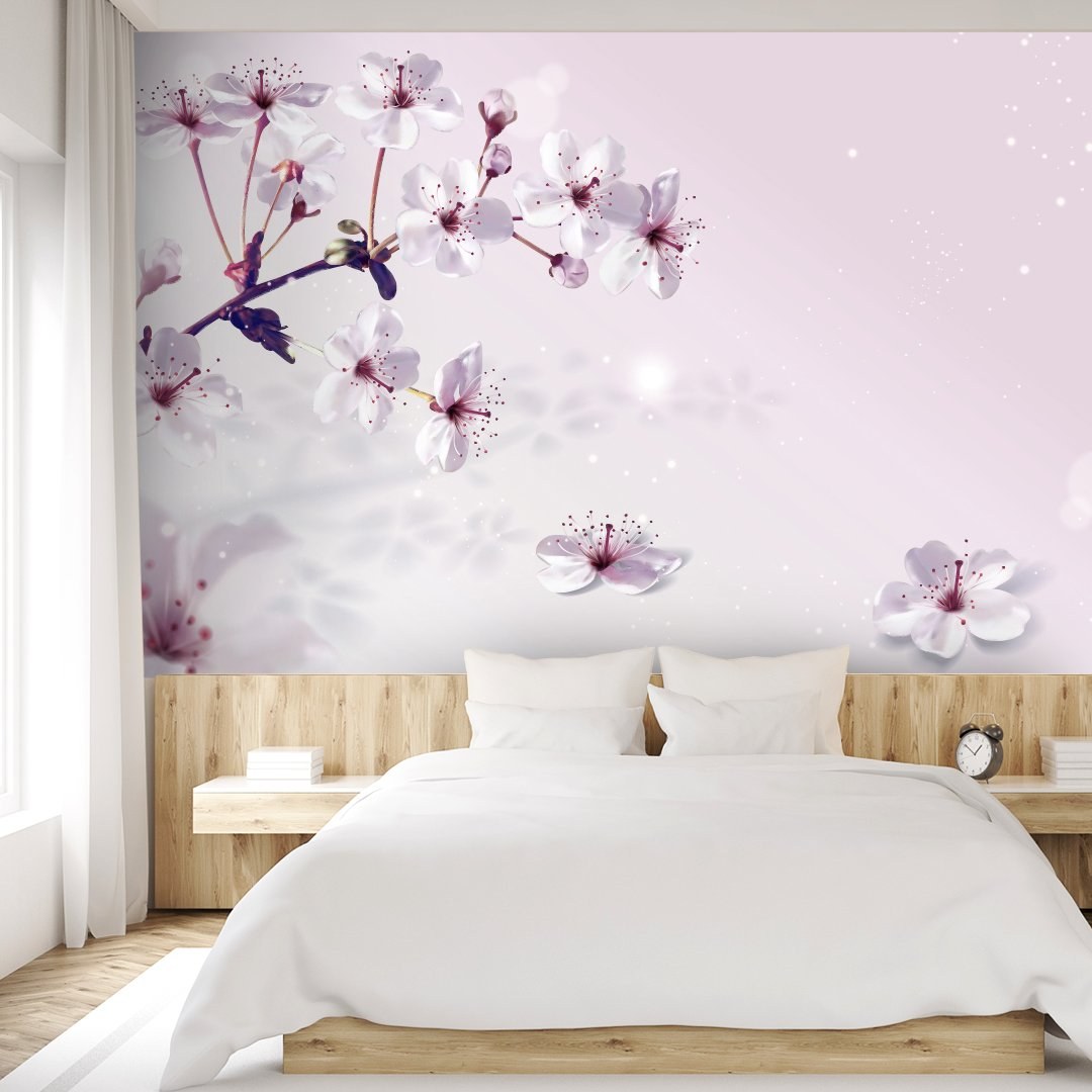 Обои с сакурой для стен в интерьере спальни